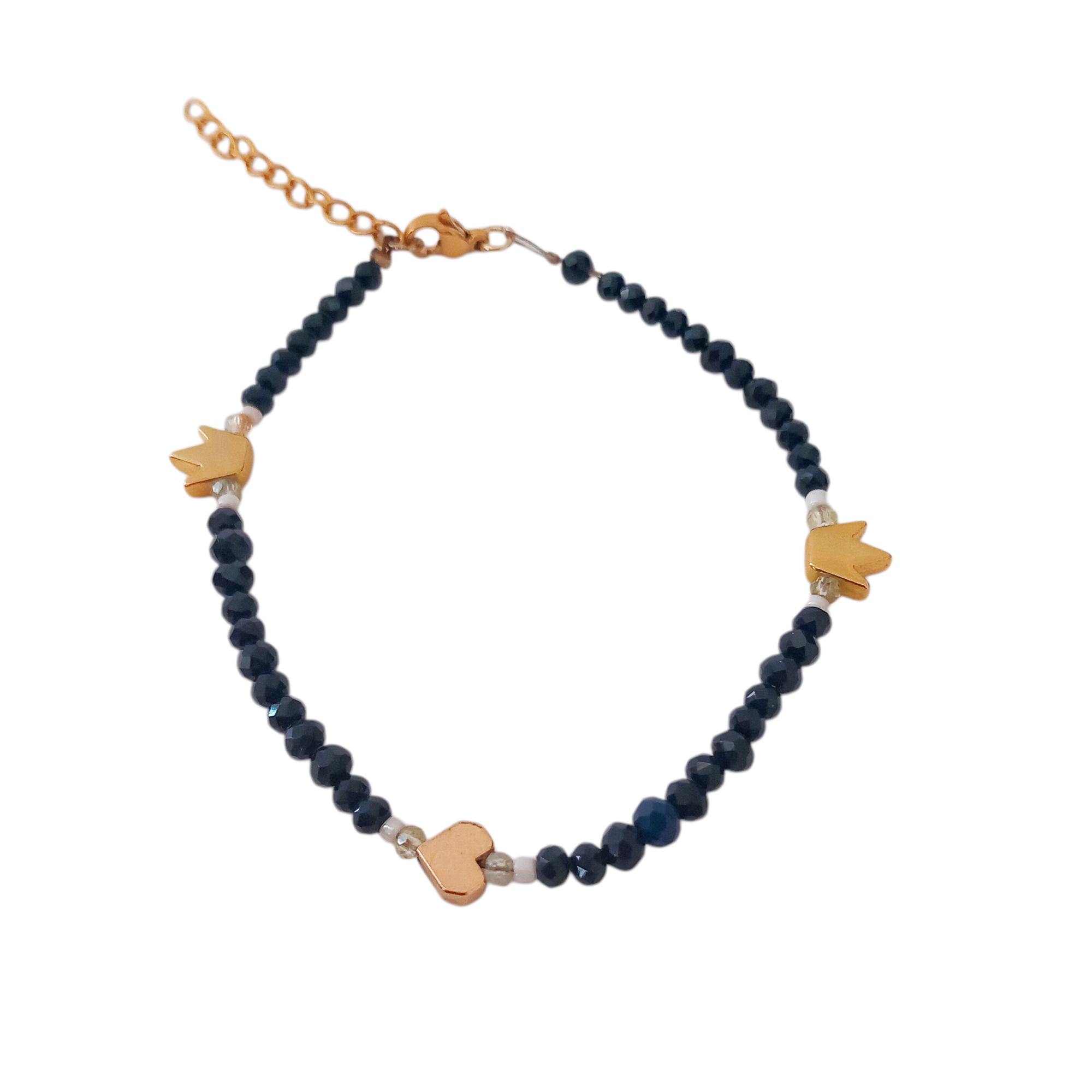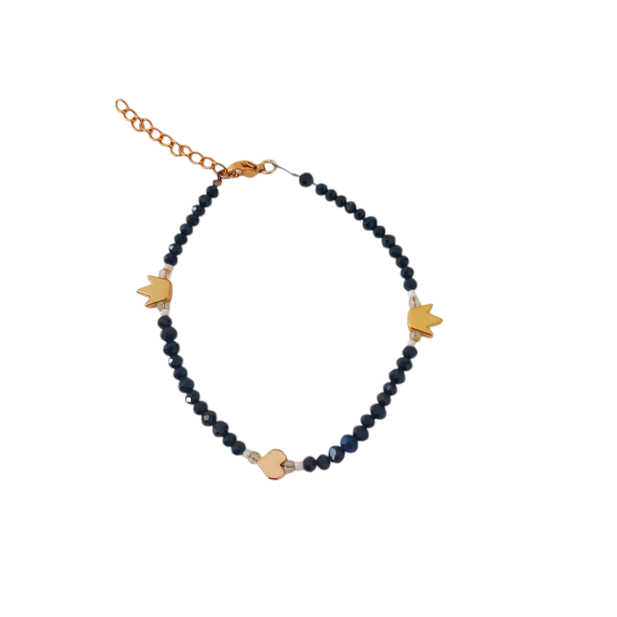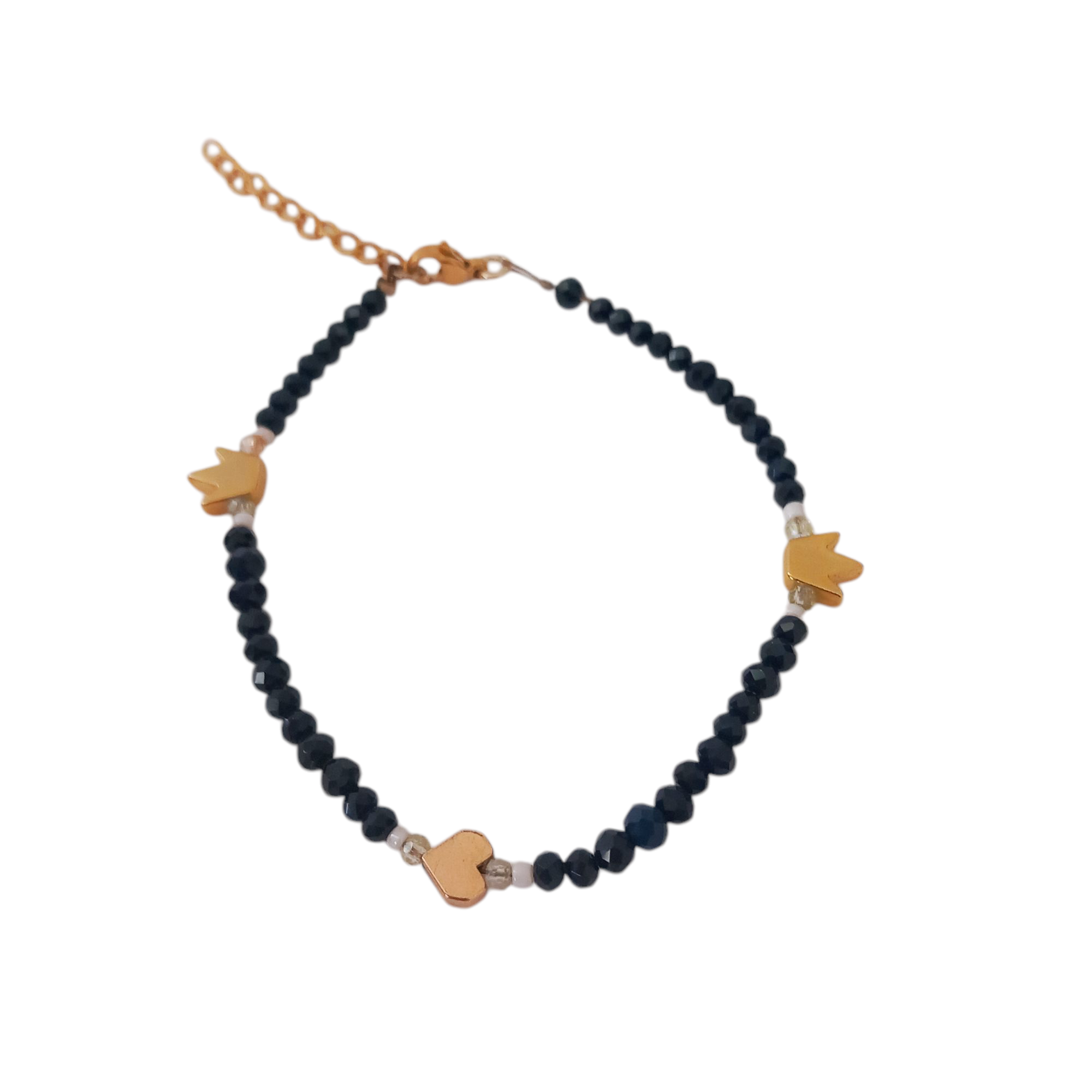 Χειροποίητο βραχιόλι με χάντρες και μεταλλικά στοιχεία σε χρυσό χρώμα. Κουμπώνει με ατσάλινο καβουράκι και ατσάλινη αλυσίδα αυξομείωσης.