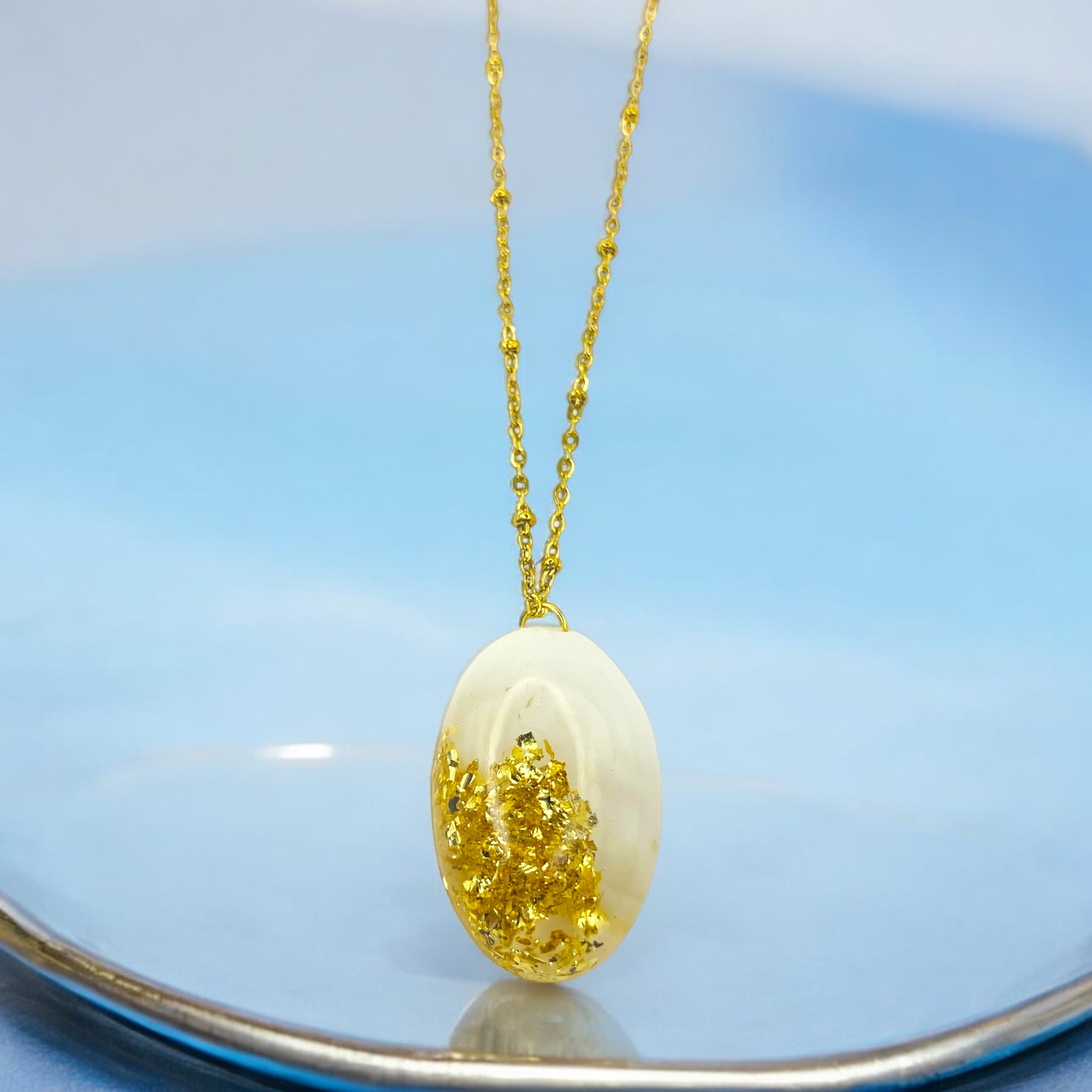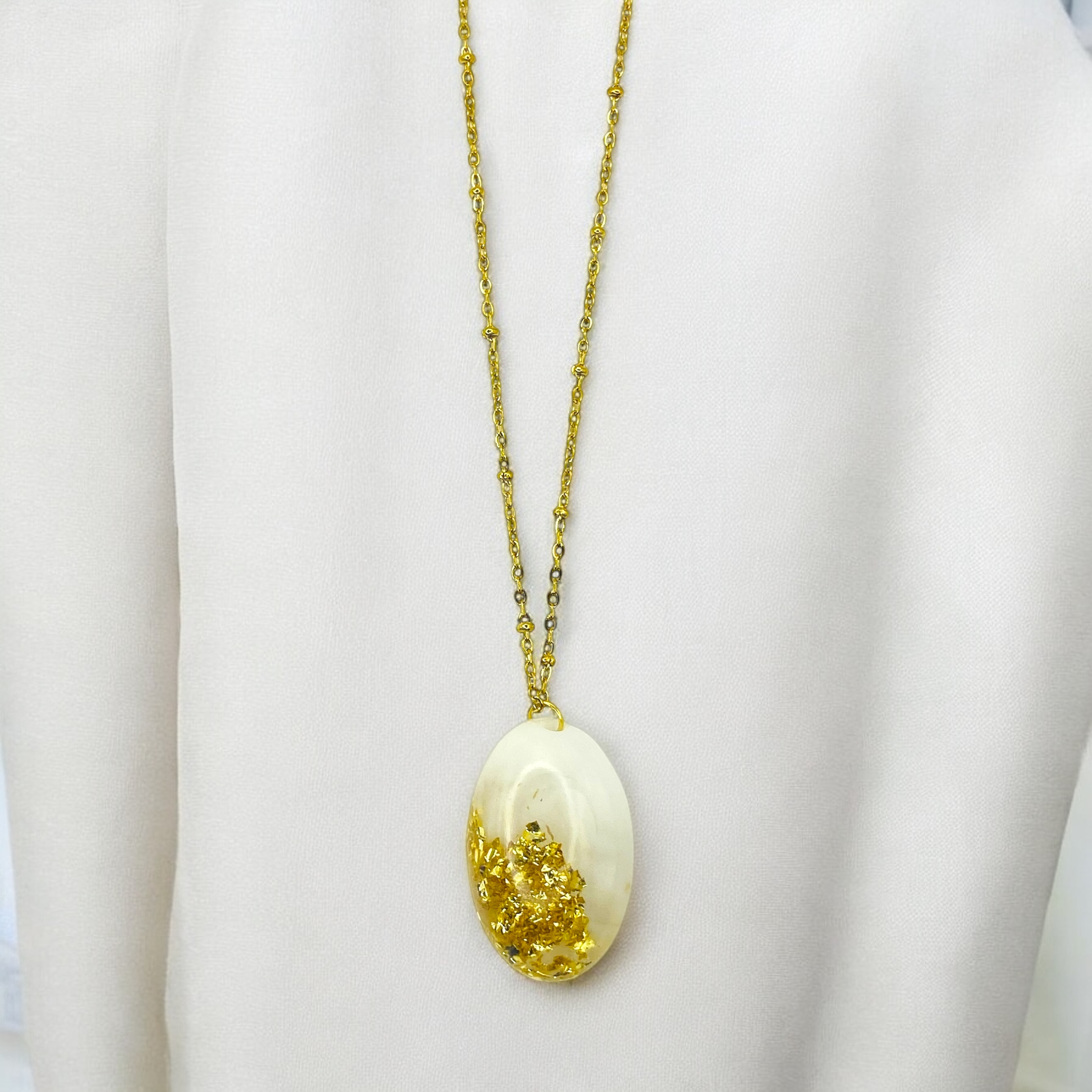 Χειροποίητο χρυσό ατσάλινο κολιέ με οβάλ κρεμαστό από υγρό γυαλί (3cm) (40+4cm)
