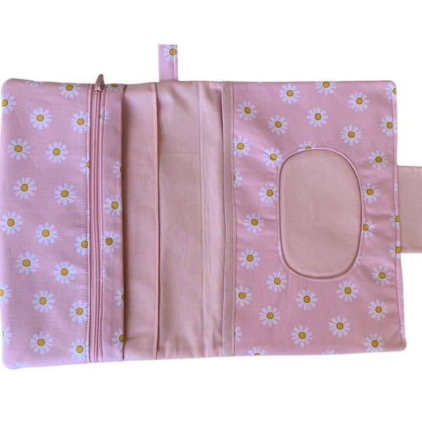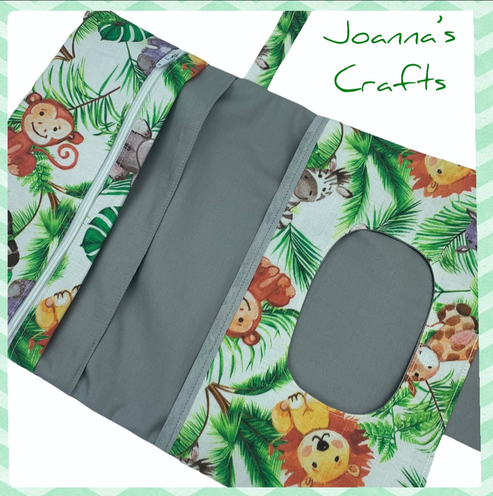 Διαθέτει μαγνητικό κούμπωμα και χερούλι για να την κρατάτε ή να την κρεμάτε όπου θέλετε. Εσωτερικά έχει θήκη για μωρομάντηλα, θήκη για πάνες και μια επιπλέον θήκη με φερμουάρ. Από 100% βαμβακερά υφάσματα.