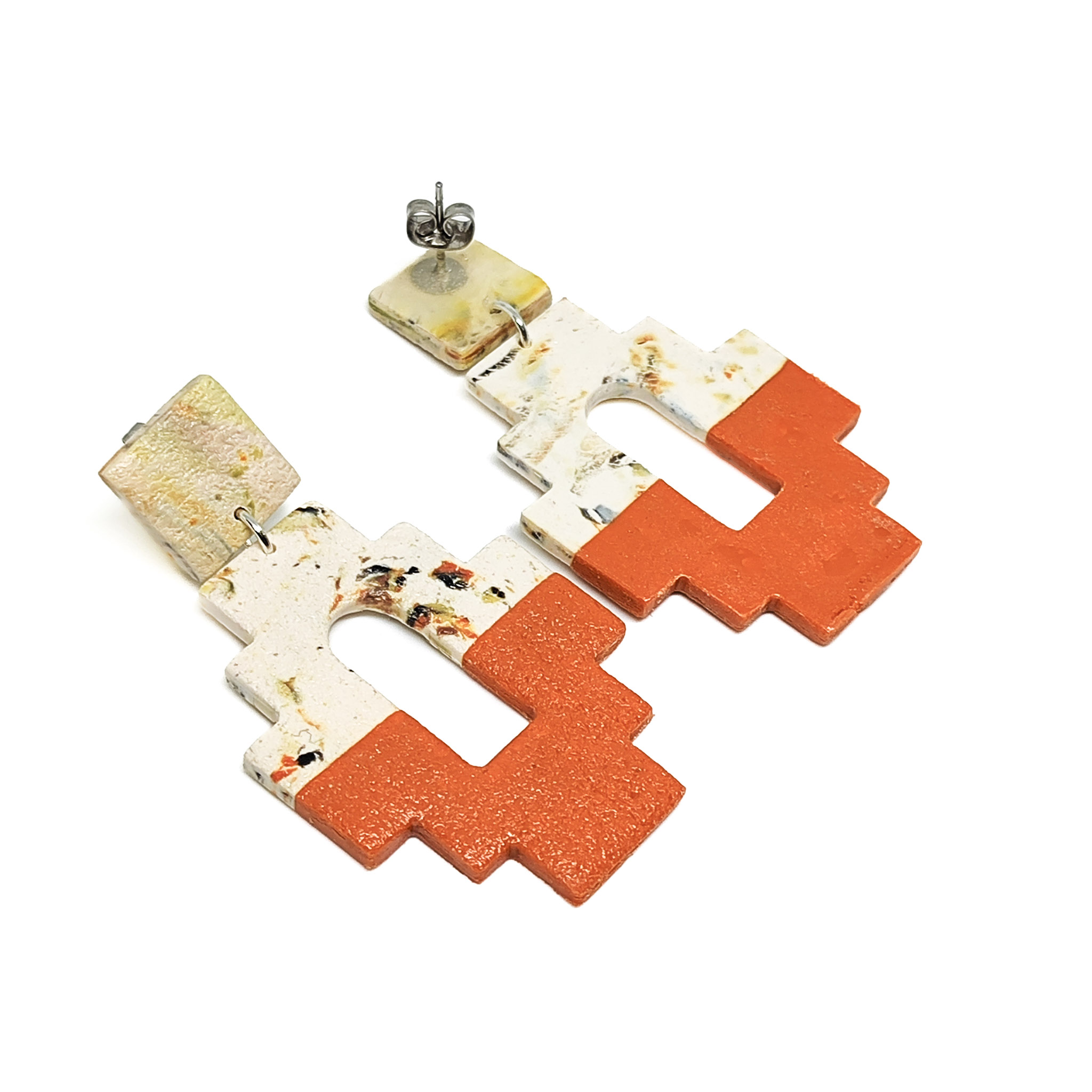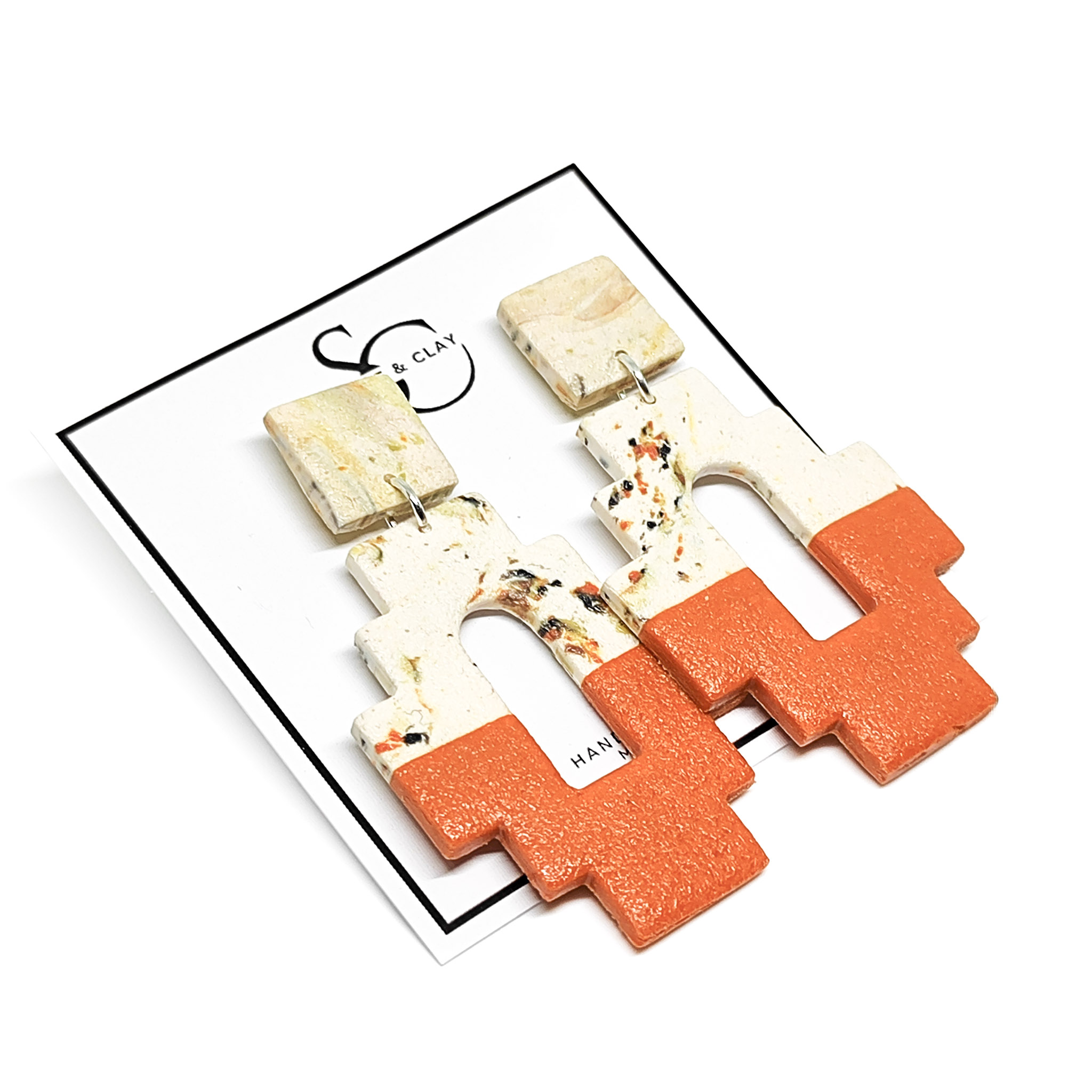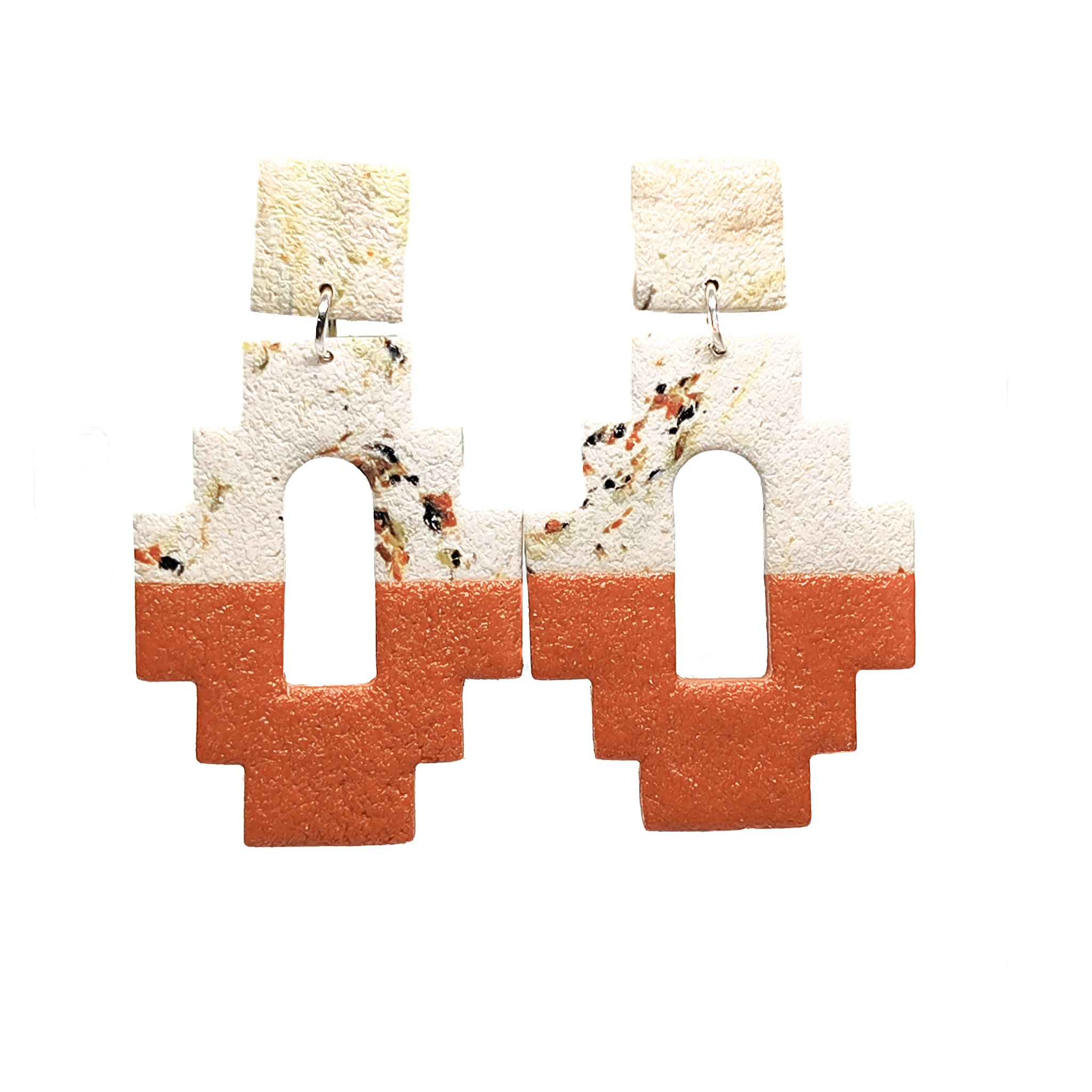 Αυτά τα χειροποίητα σκουλαρίκια από πολυμερικό πηλό έχουν εντυπωσιακό γεωμετρικό σχέδιο με αρχιτεκτονικές επιρροές. Ο συνδυασμός των γήινων αποχρώσεων – λευκό με πινελιές terrazzo και θερμό τερακότα – δημιουργεί μια ισορροπημένη αντίθεση που αποπνέει μοντέρνα αλλά και boho αισθητική.