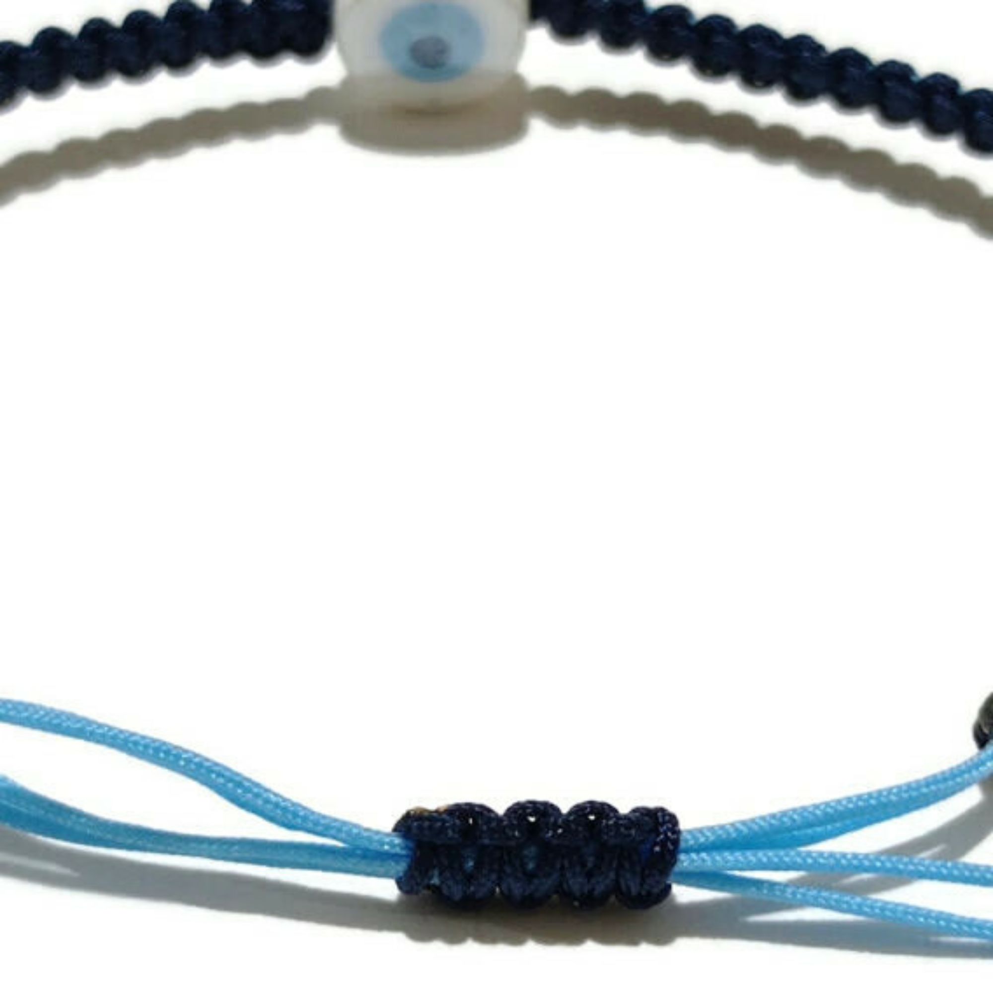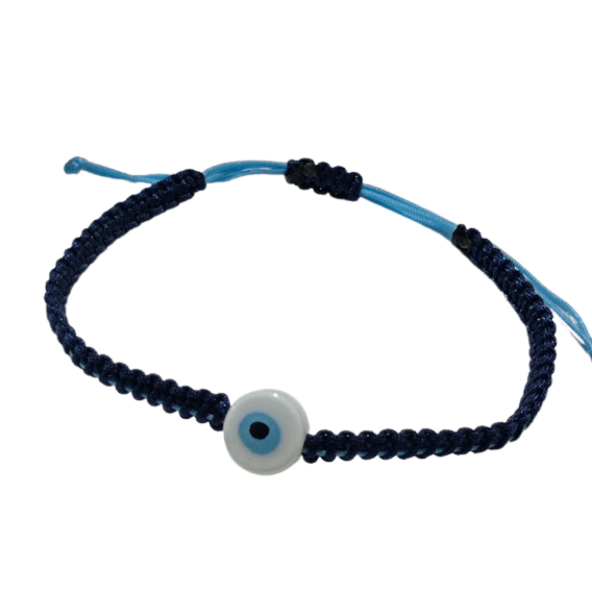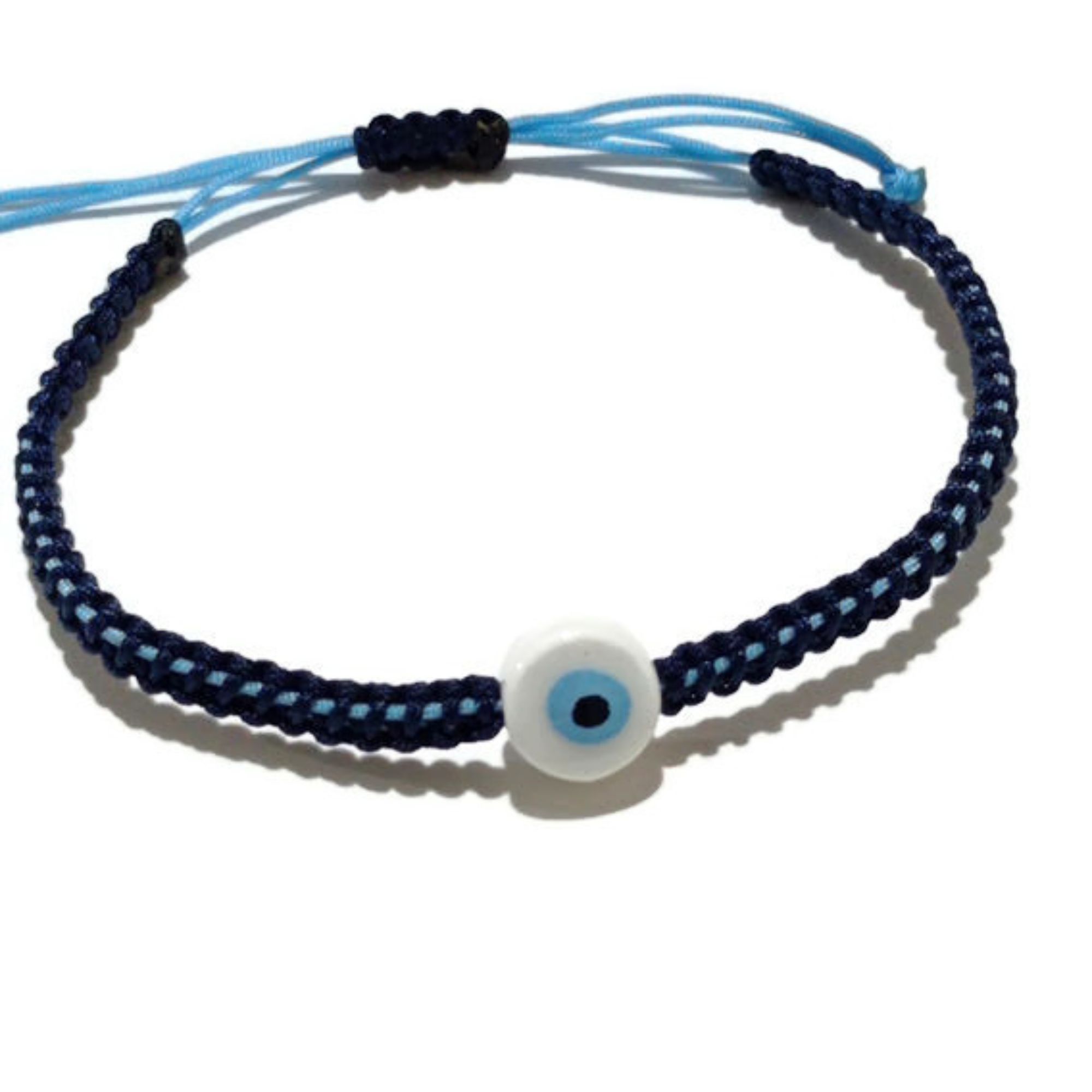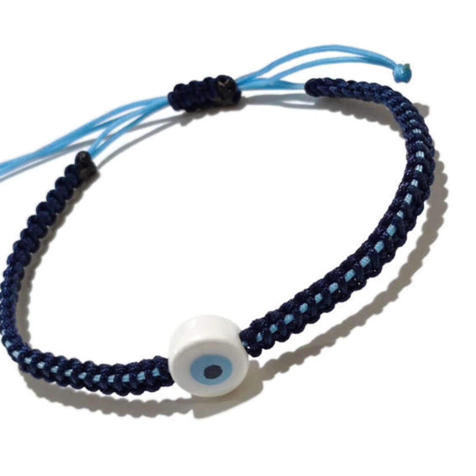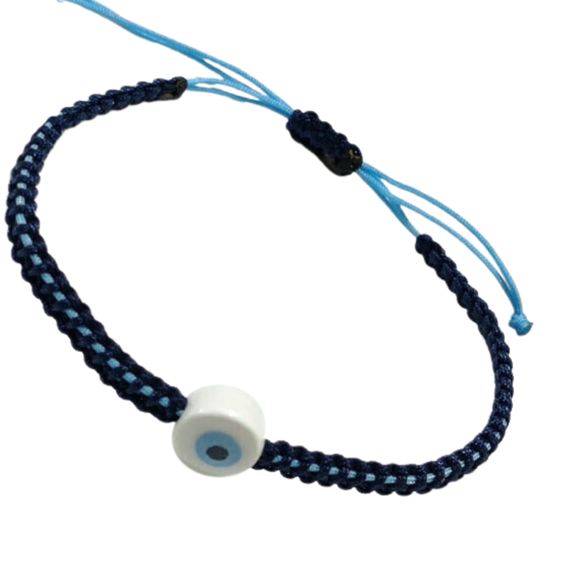 Βραχιόλι με στρογγυλό κεραμικό μάτι άσπρο, πλεγμένο μακραμέ σε γαλάζιο και μπλε χρώμα.