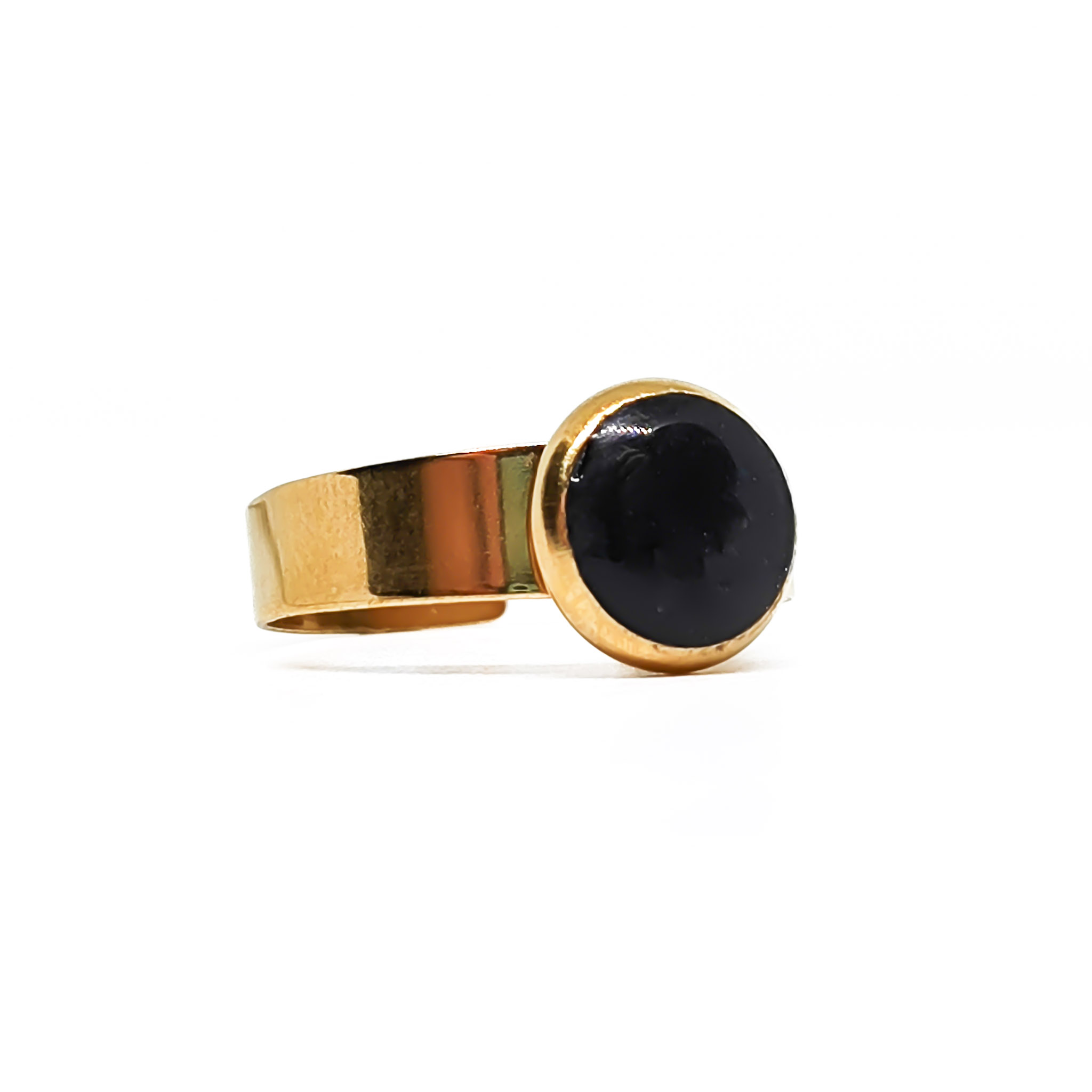 Χειροποίητο ατσάλινο δαχτυλίδι με ρυθμιζόμενο μέγεθος, που αποπνέει κομψότητα και διαχρονικό στυλ. Διαθέτει ένα στρογγυλό στοιχείο σε μαύρο χρώμα.