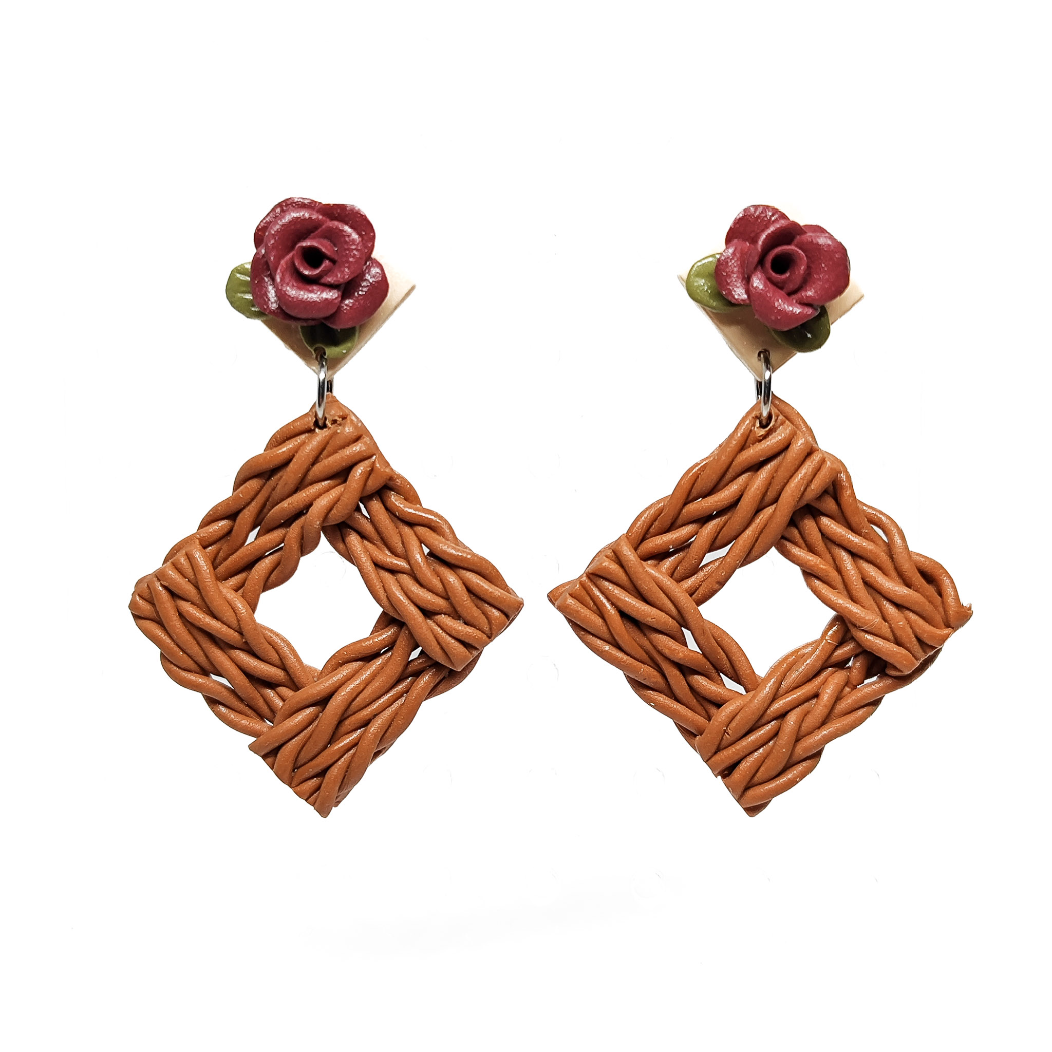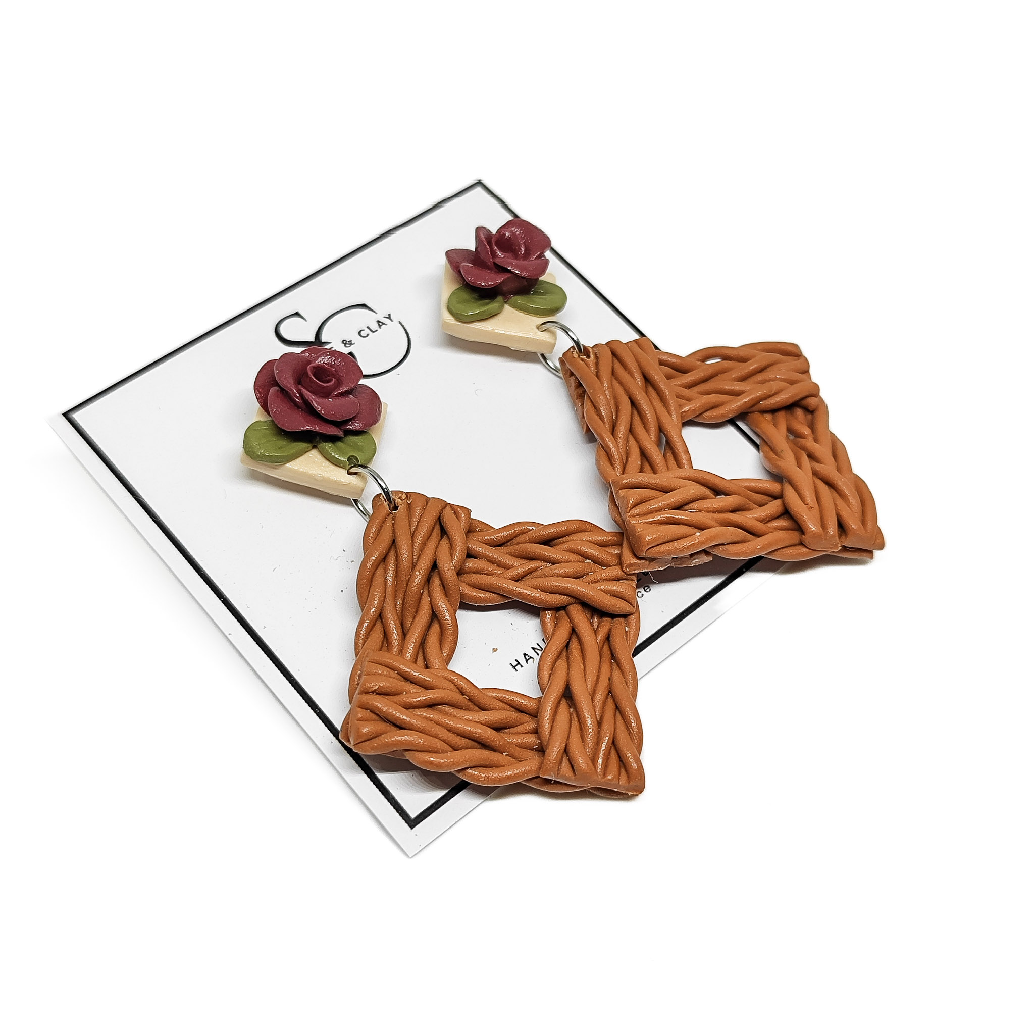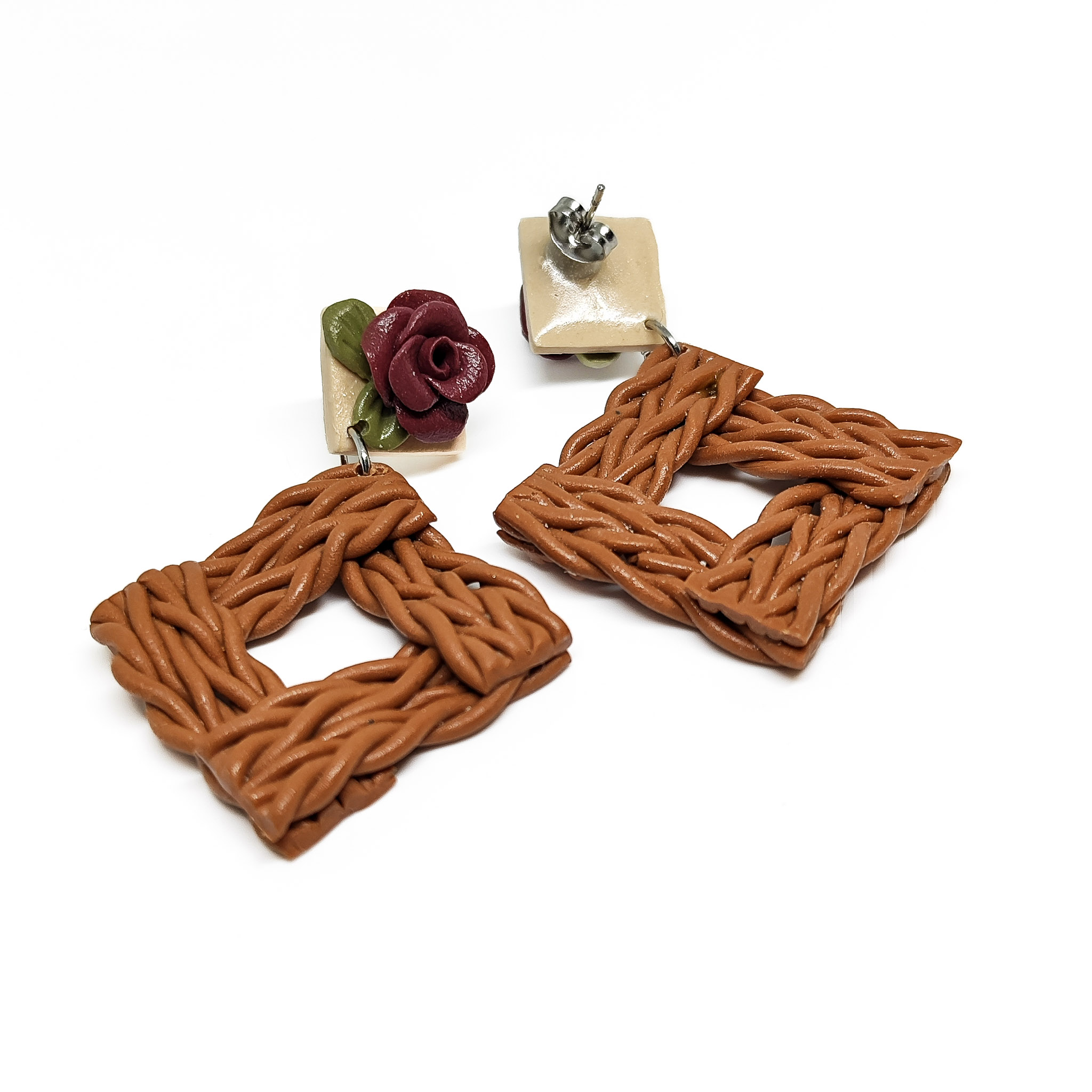 Αυτά τα εντυπωσιακά σκουλαρίκια είναι χειροποίητα από πολυμερικό πηλό, με ένα περίπλοκο πλεκτό σχέδιο και 3D τριαντάφυλλα. Η τέλεια προσθήκη για να αναδείξετε το στυλ σας με μια μοναδική και χειροποίητη πινελιά.