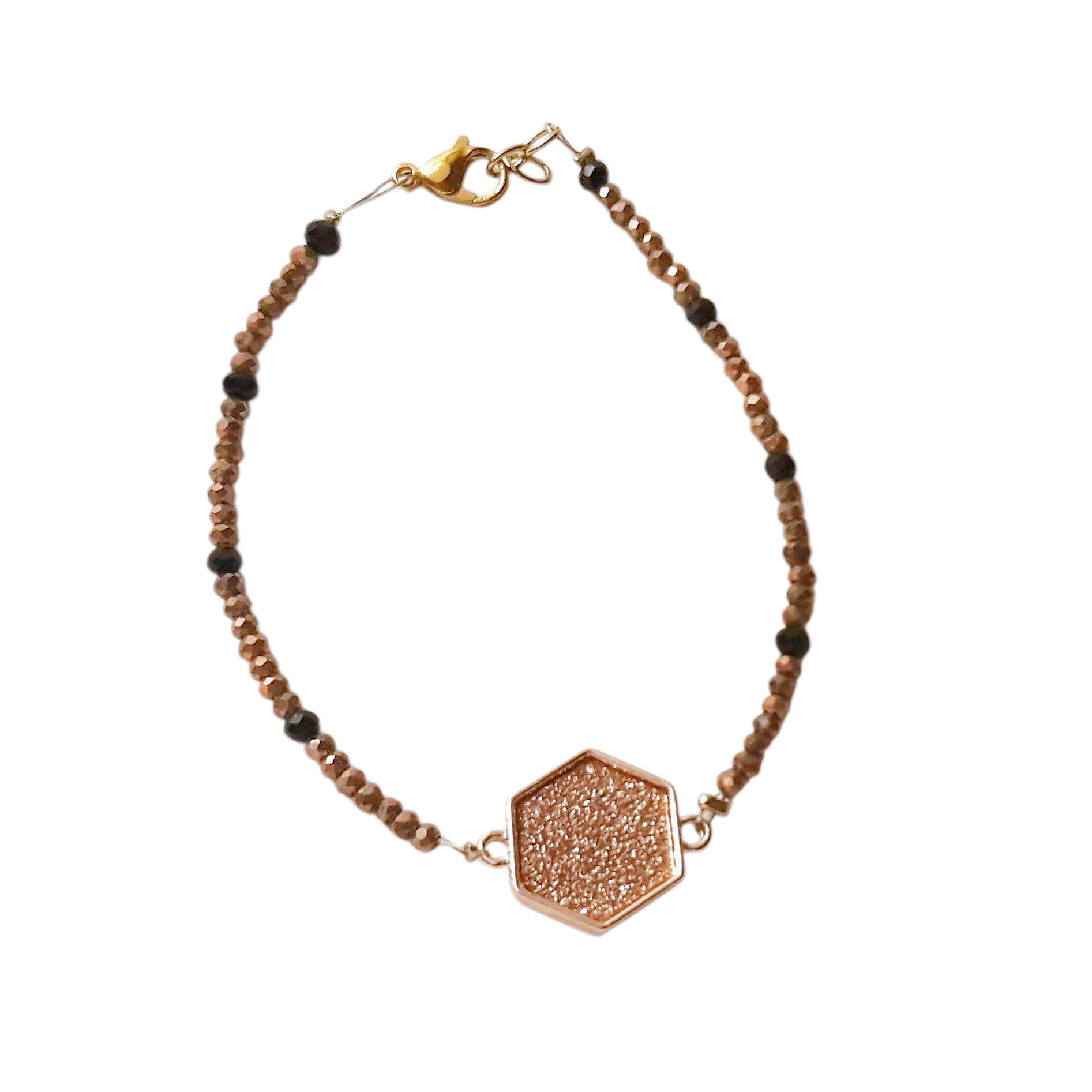 Χειροποίητο βραχιόλι με μεταλλικό μοτίφ με glitter και κρυστάλλινες χάντρες. Κουμπώνει με ατσάλινο καβουράκι και ατσάλινη αλυσίδα αυξομείωσης.
