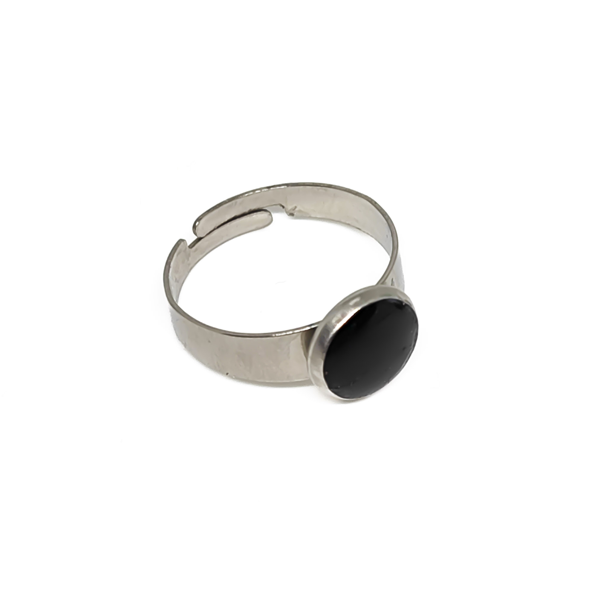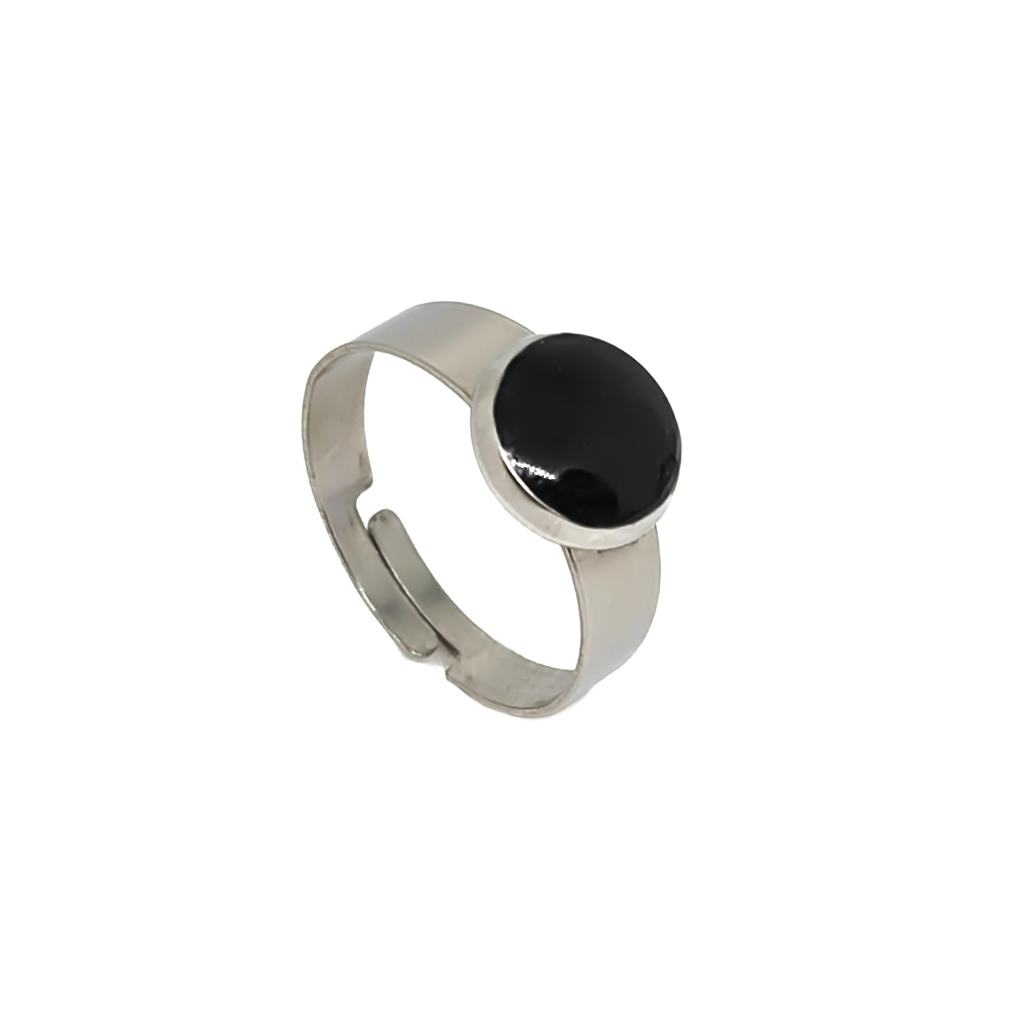 Χειροποίητο ατσάλινο δαχτυλίδι με ρυθμιζόμενο μέγεθος, που αποπνέει κομψότητα και διαχρονικό στυλ. Διαθέτει ένα στρογγυλό στοιχείο σε μαύρο χρώμα.