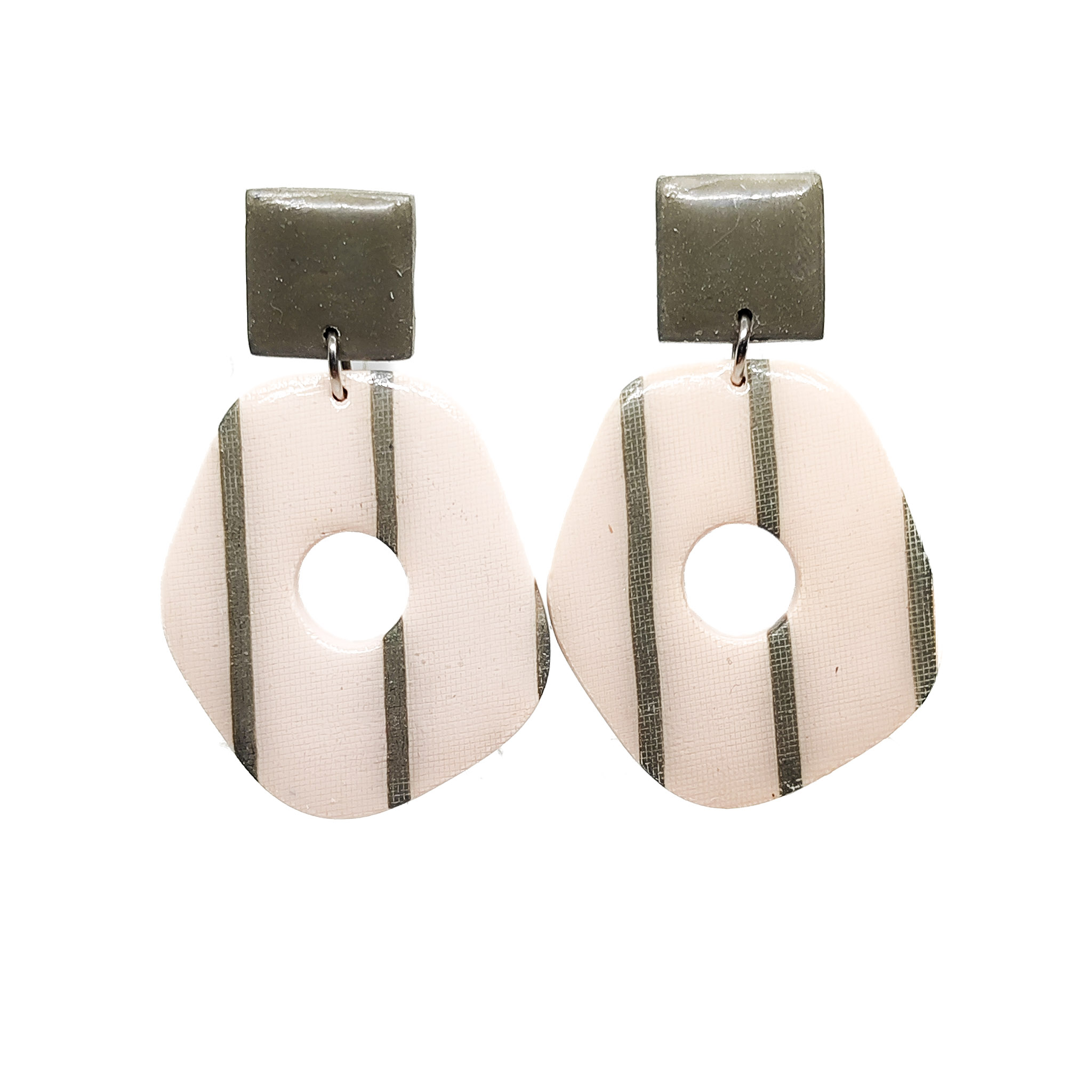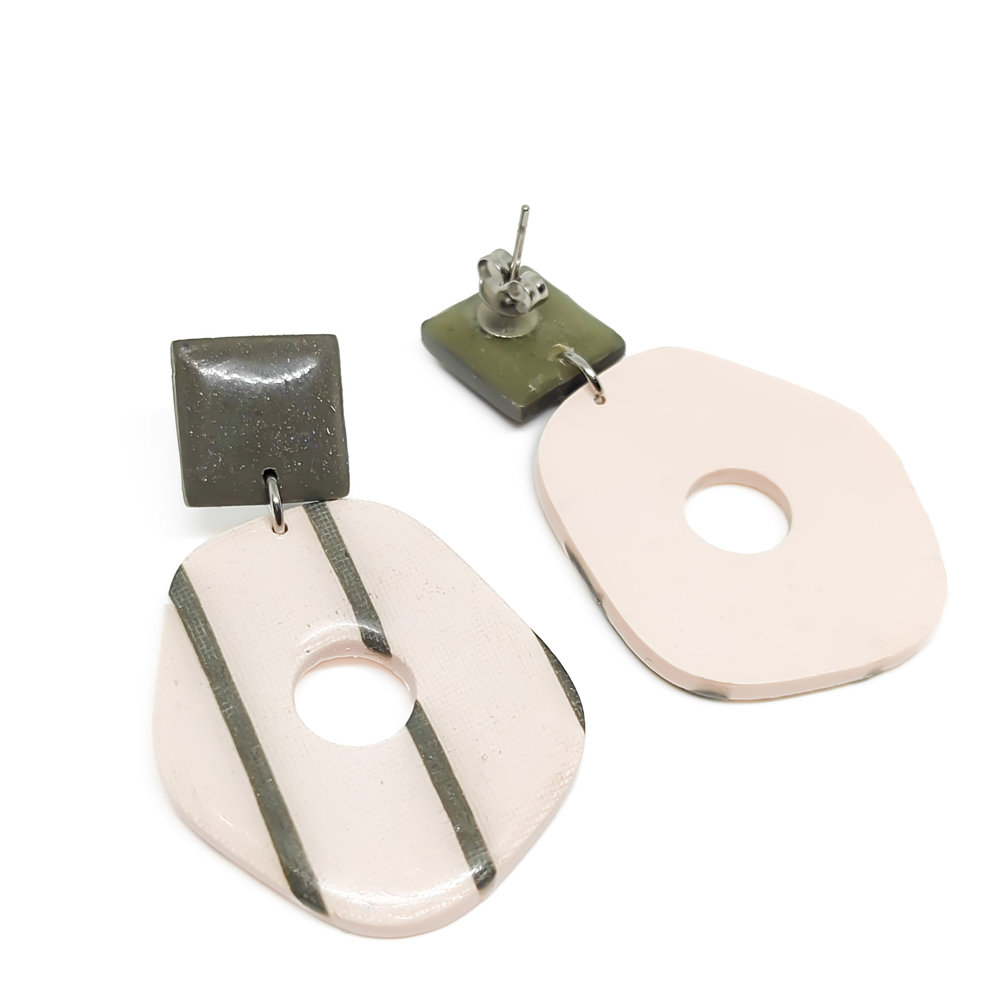 Χειροποίητα σκουλαρίκια από πολυμερικό πηλό, με σχέδιο ριγέ σε φόντο baby pink και ρίγες ανθρακί. Τα σκουλαρίκια έχουν επίστρωση ρητίνης και είναι ιδανικά για ανοιξιάτικες – καλοκαιρινές εμφανίσεις