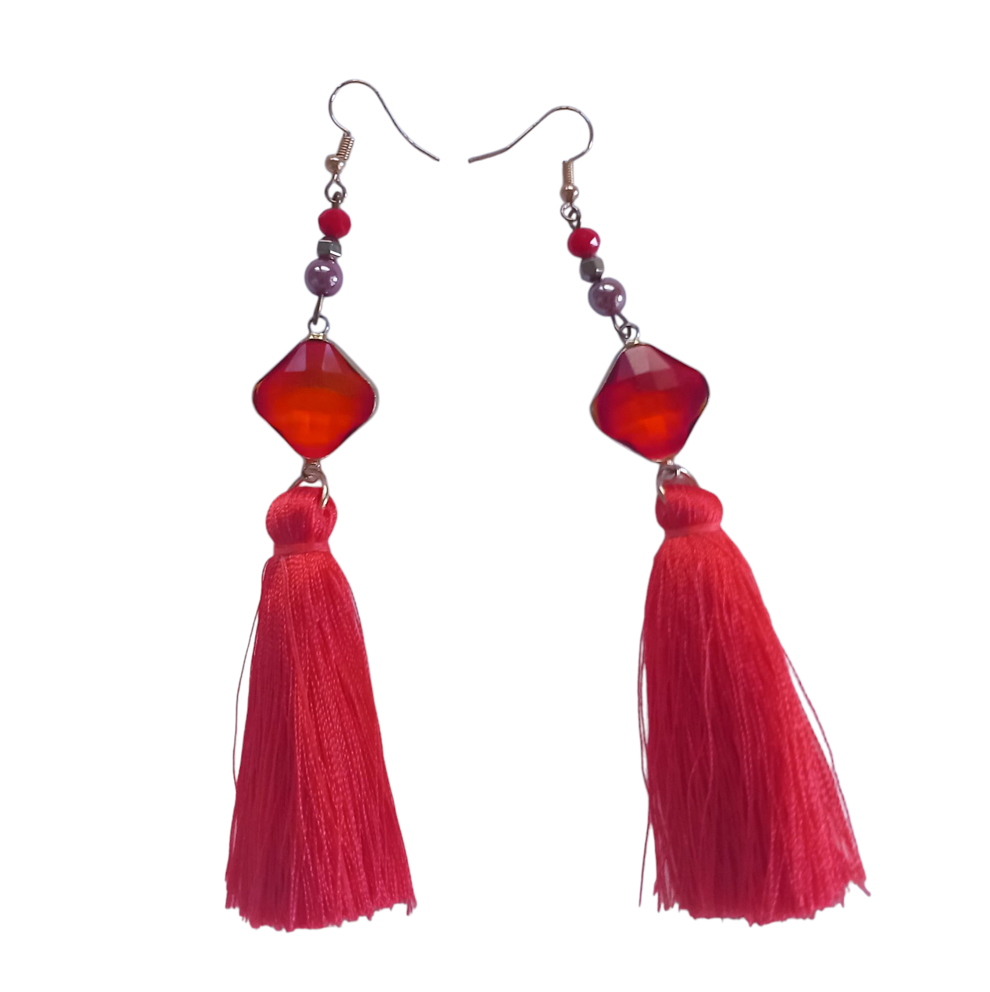 Χειροποίητα σκουλαρίκια μοτίφ κρύσταλλο από ορείχαλκο με χάντρες και μακριές κοραλλί φούντες. Ο γάντζος είναι από ατσάλι.