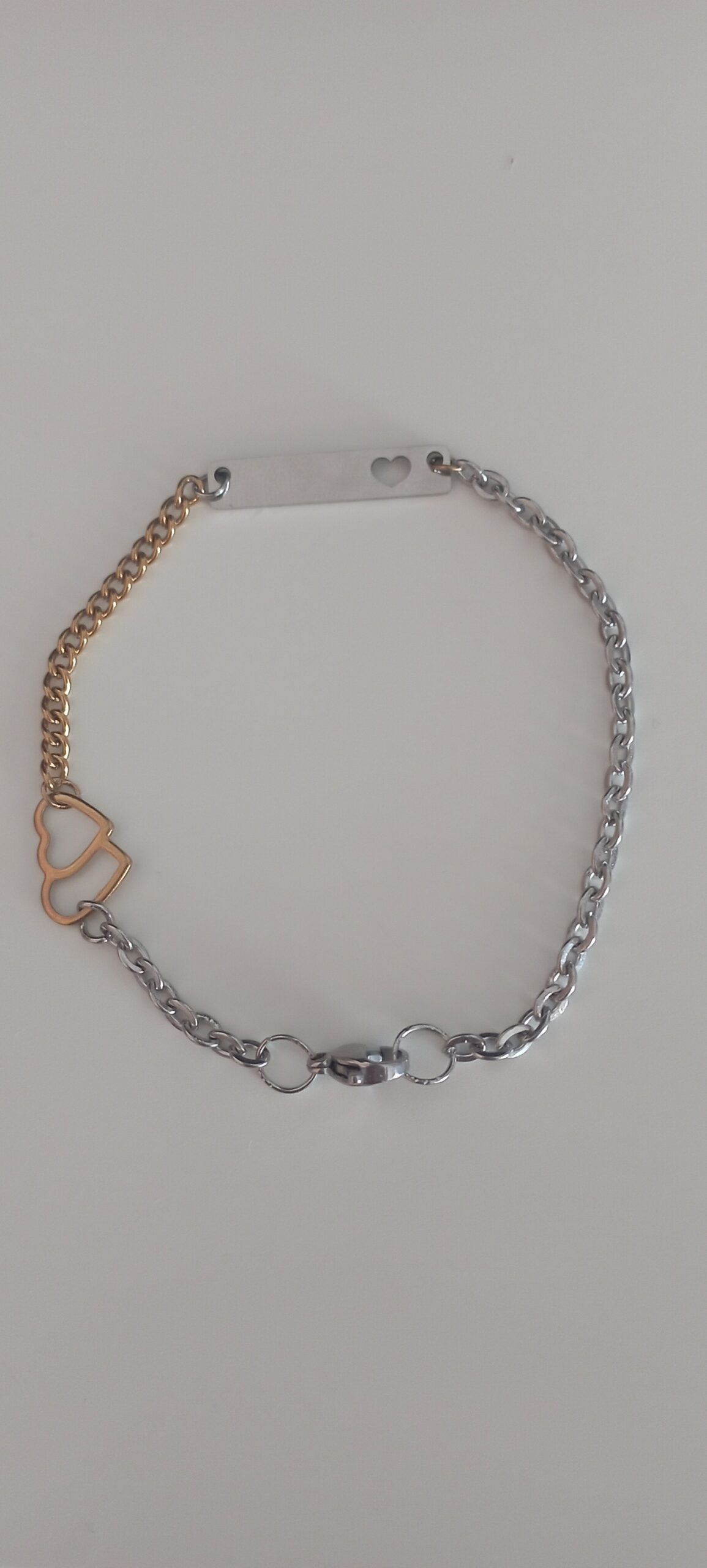 Ο ένας σύνδεσμος είναι ατσάλινη ταυτότητα 25 επί 5mm σε χρώμα ασημί και έχει χαραγμένη πάνω της , μια μικρή καρδιά . Ο δεύτερος σύνδεσμος είναι μια διπλή , ατσάλινη καρδιά 10mm χρυσού χρώματος. Η μία αλυσίδα είναι ατσάλινη , επίχρυση μεσαίου μεγέθους ενώ η δεύτερη αλυσίδα είναι πιο λεπτή ατσάλινη , ασημί χρώματος . Το κούμπωμα(παπαγαλάκι ) 10 mm του βραχιολιού είναι ατσάλινο σε ασημί χρώμα . Αν το θέλετε μπορούμε να προσθέσουμε στο βραχιόλι αλυσίδα προέκτασης 5mm. ώστε να το προσαρμόσετε στον δικό σας καρπό . Ο συνδυασμός ασημί με χρυσού χρώματος δίνει στο βραχιόλι ένα ιδιαίτερο και φινετσάτο χαρακτήρα και μια εκλεπτυσμένη εικόνα .