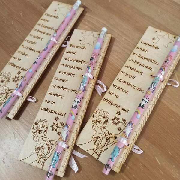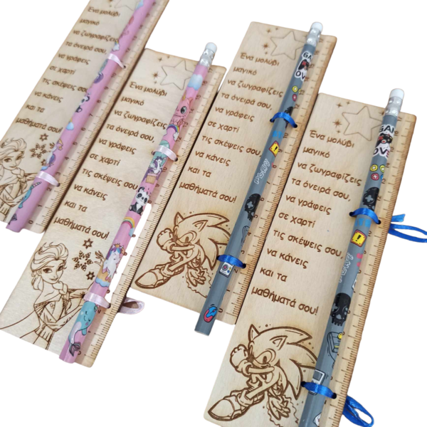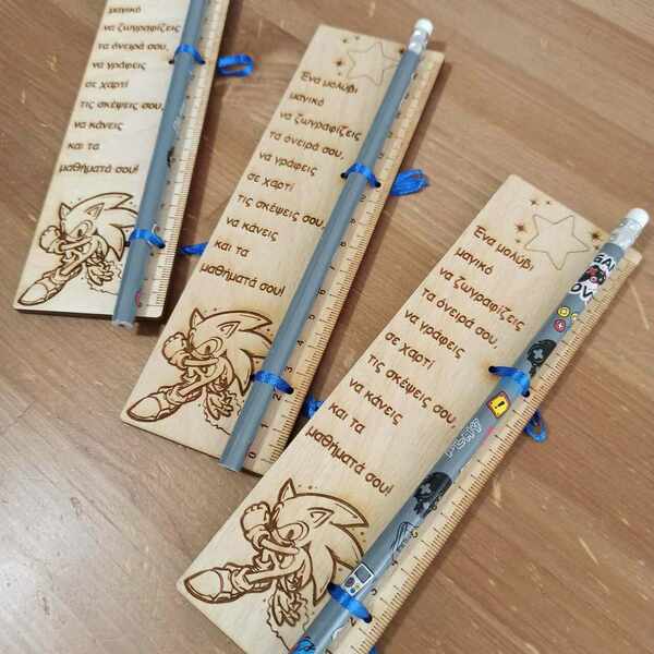 Δωράκια για πάρτι 15 ξύλινοι χάρακες έλσα και σόνικ με αφίερωση και μολύβι