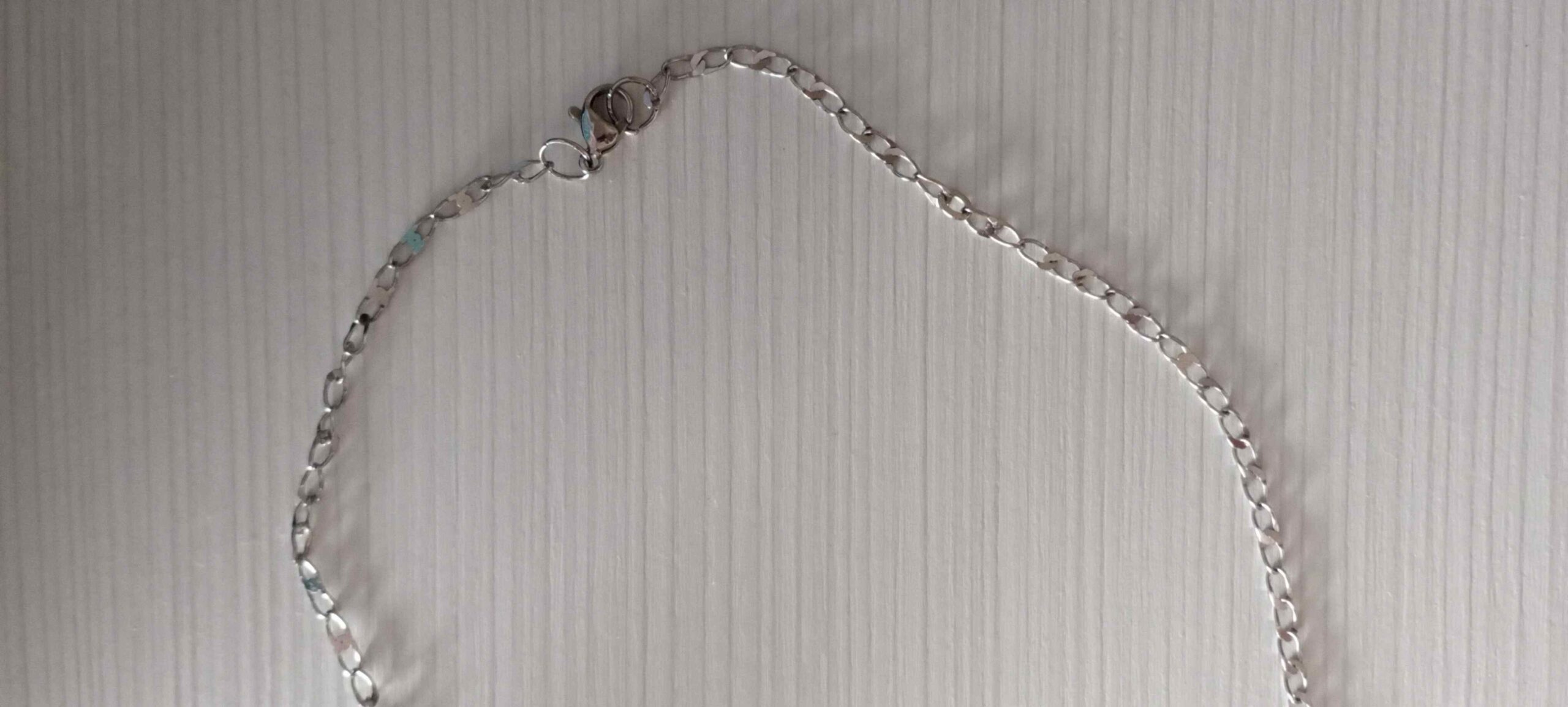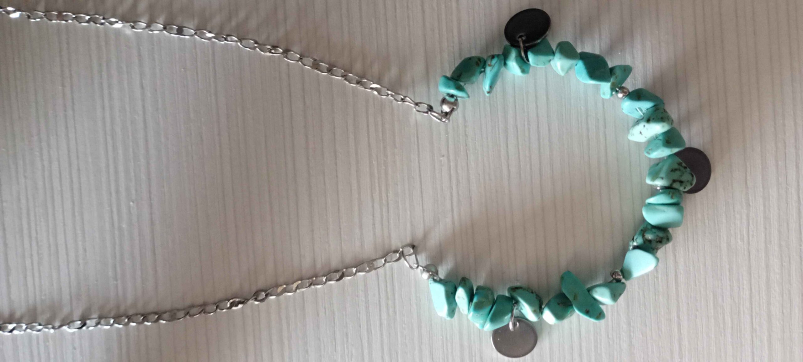 Χειροποίητο ατσάλινο κολιέ με ατσάλινη , ηλεκτρογυαλισμένη αλυσίδα 45cm μεσαίου μεγέθους , η οποία ενώνεται με μισινέζα στην οποία είναι περασμένα μεγάλα τσιπς τιρκουάζ χαολίτη 4 με 15 mm . Ανάμεσα στα τσίπς είναι περασμένεs πολύ μικρές ατσάλινες ασημί χάντρες 2mm . Τα κρεμαστά του στοιχεία είναι ατσάλινα , ασημί φλουριά 10mm . Το κούμπωμα του κολιέ είναι ατσάλινο ασημί παπαγαλάκι 10mm . Αν το προτιμάτε μπορούμε να προσθέσουμε αλυσίδα προέκτασης 7 εκατοστά ώστε να το προσαρμόσετε στον δικό σας λαιμό . Το κολιέ αυτό είναι ότι χρειάζεστε για τις εξόδους σας τούς καλοκαιρινούς μήνες . Μπορείτε να το φορέσετε ακόμα και στην παραλία καθώς και η αλυσίδα και τα τσιπς χαολίτη δεν παθαίνουν τίποτα είναι πολύ ανθεκτικά .