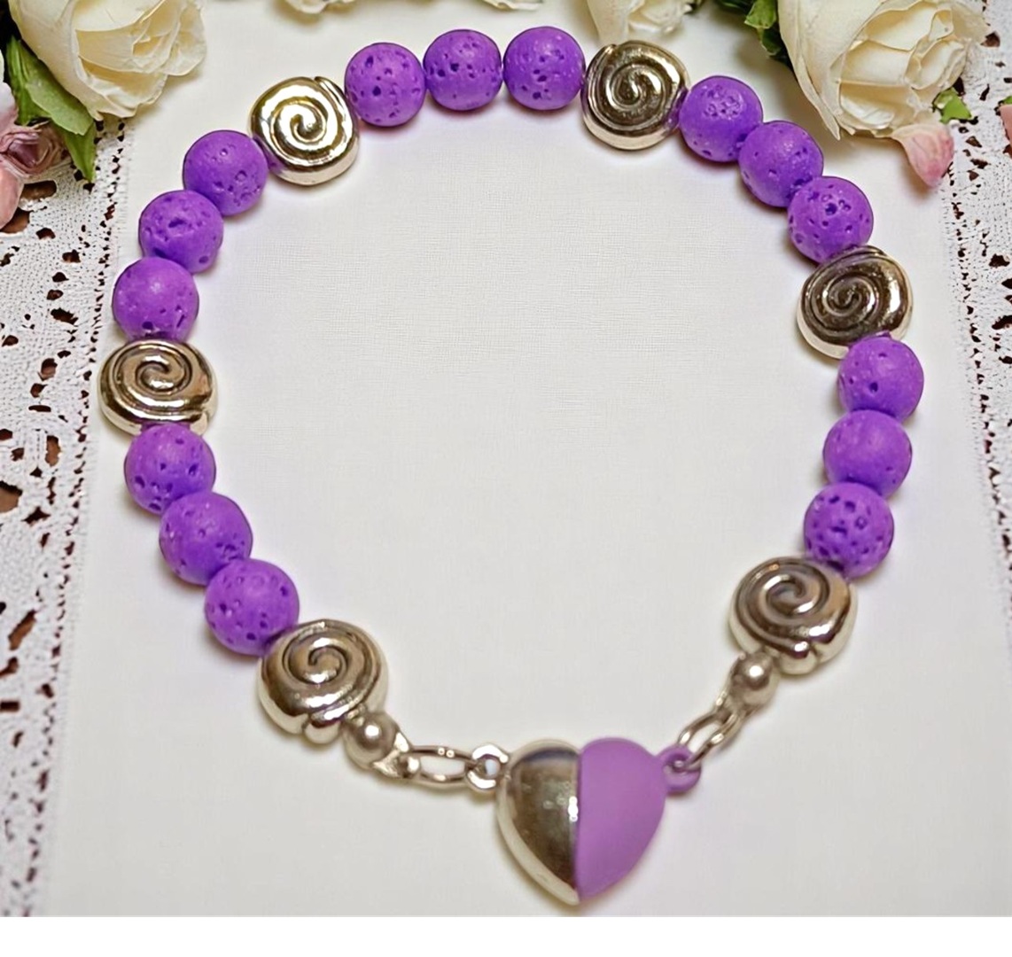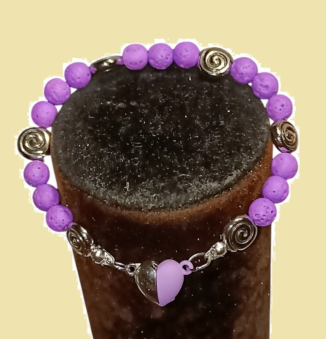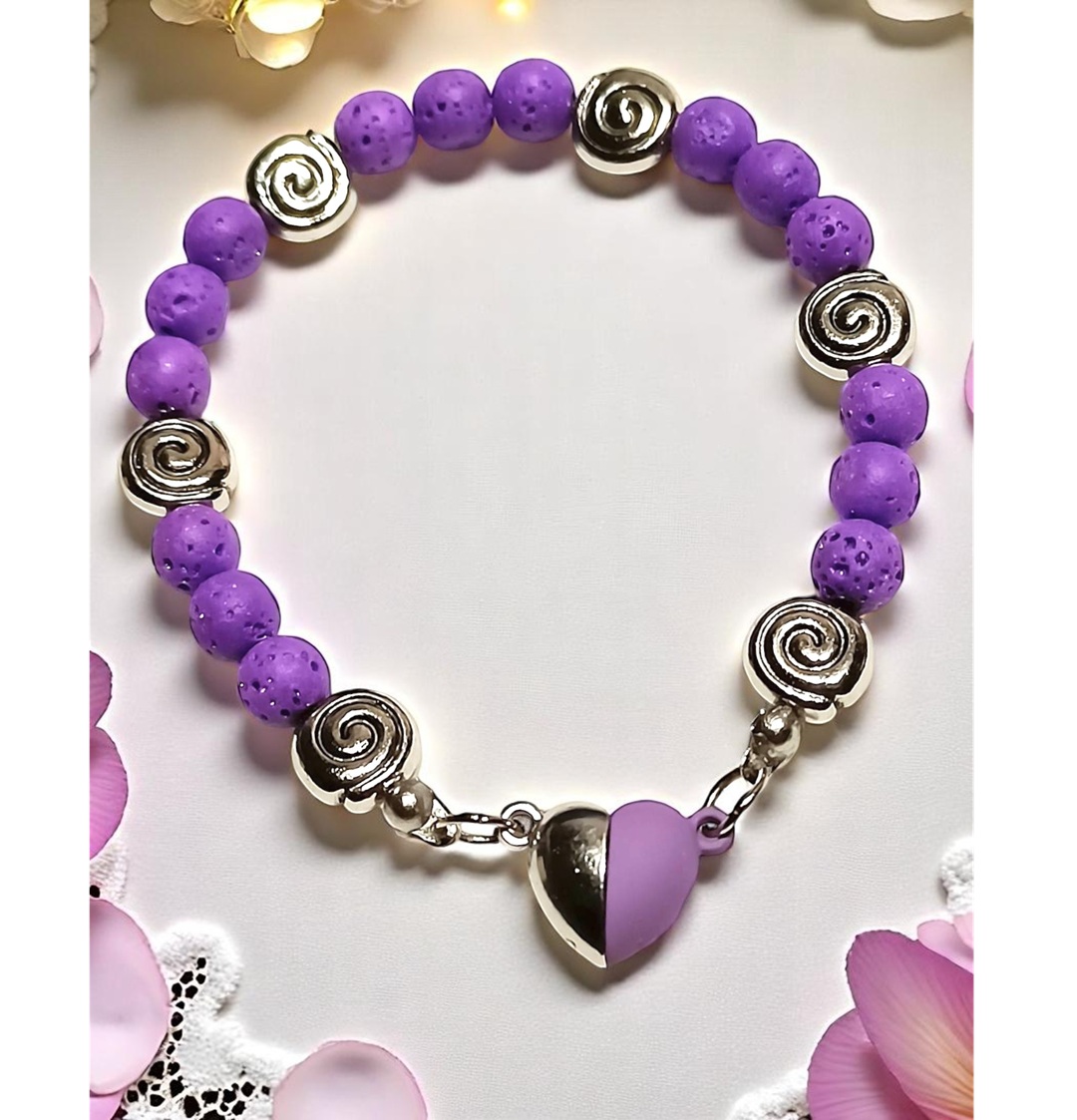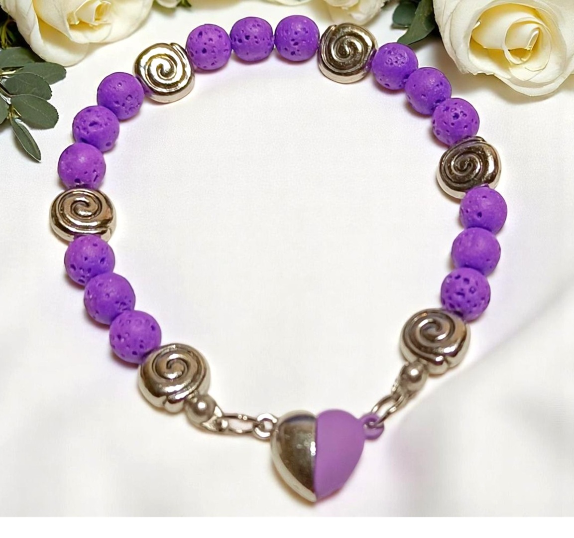 Χειροποιητο Βραχιολι με ημιπολυτιμο λιθο ΛΑΒΑ(purple) ,μαγνητικο κουμπωμα καρδια και μεταλλικα ασημί στοιχεια