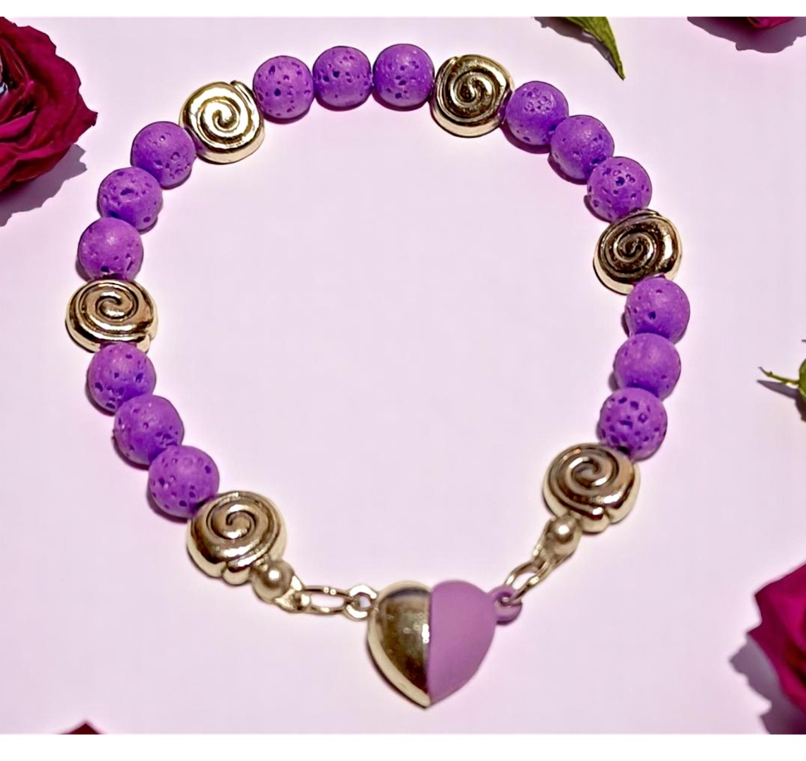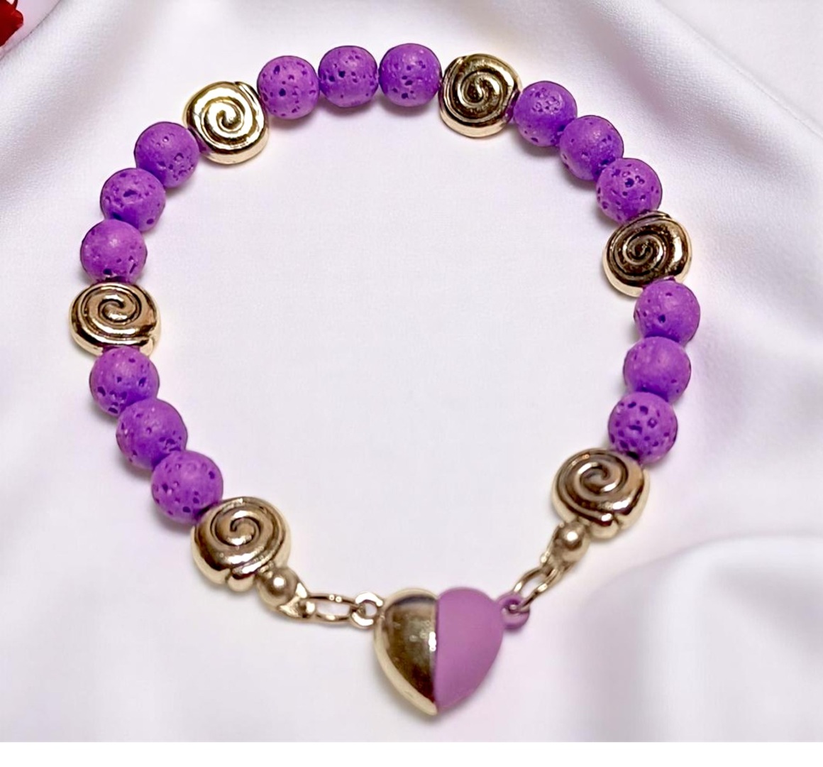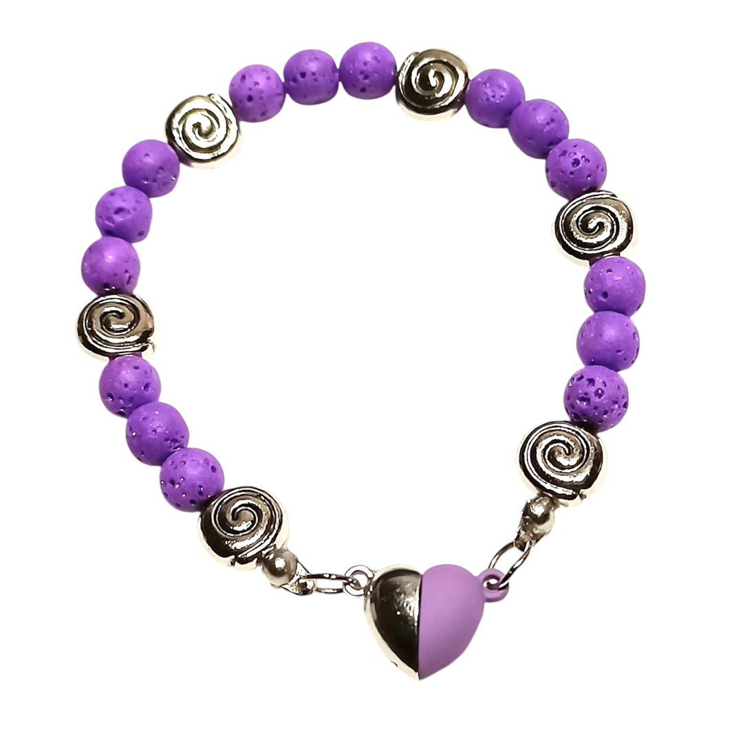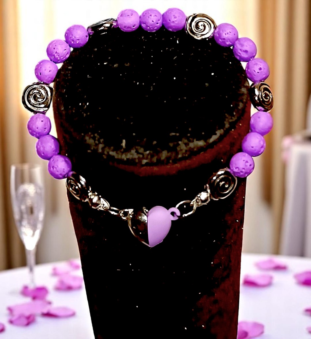 Χειροποιητο Βραχιολι με ημιπολυτιμο λιθο ΛΑΒΑ(purple) ,μαγνητικο κουμπωμα καρδια και μεταλλικα ασημί στοιχεια