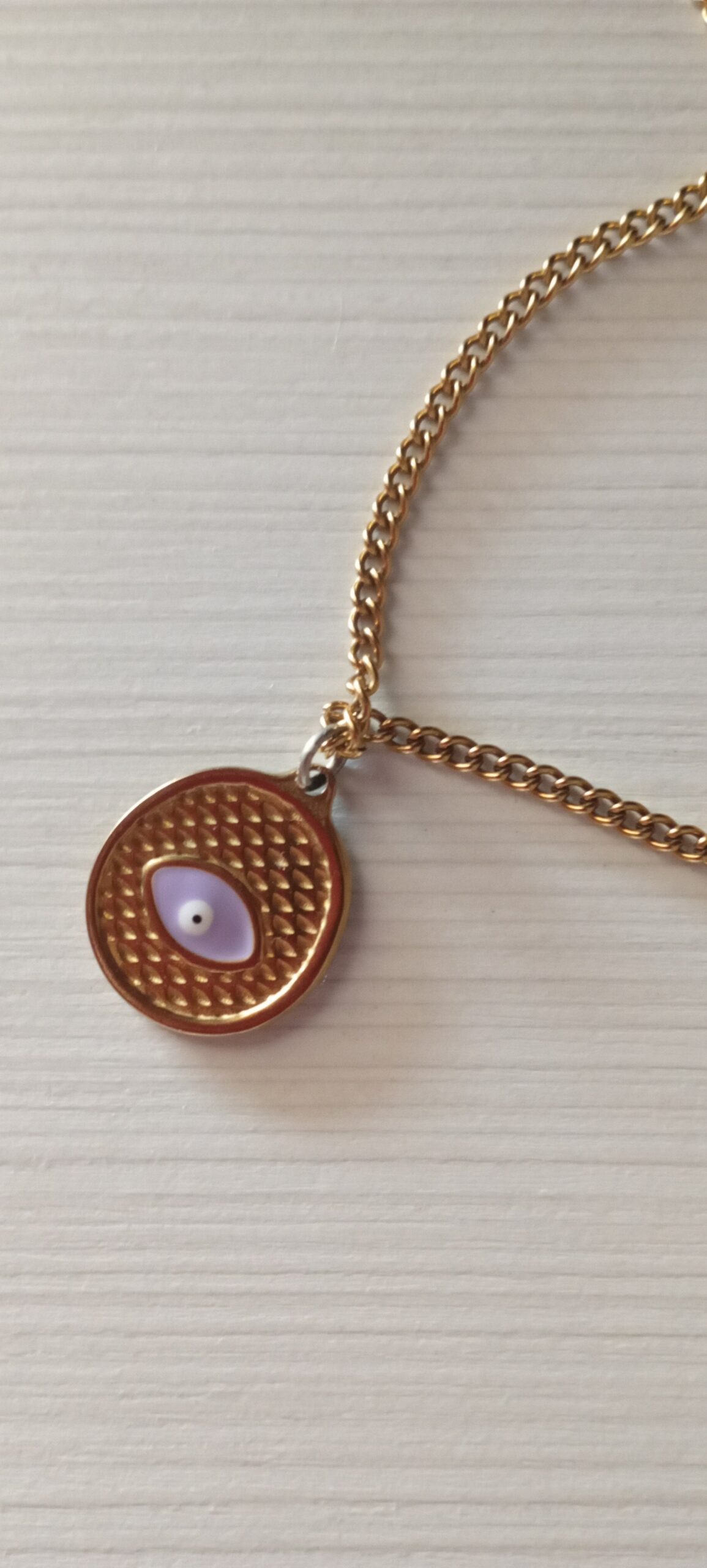 Χειροποίητο , ατσάλινο επίχρυσο κολιέ .Η αλυσίδα του είναι ατσάλινη , επίχρυση μεσαίου μεγέθους 35 cm .Το κρεμαστό του στοιχείο είναι ατσάλινο , επίχρυσο μάτι με μωβ σμάλτο 18K , 24mm Αν το επιθυμείτε μπορούμε να προσθέσουμε στο κολιέ αλυσίδα προέκτασης 7 με 8 εκατοστά , ώστε να το προσαρμόσετε στο μήκος πού θέλετε και στο δικός σας λαιμό .
