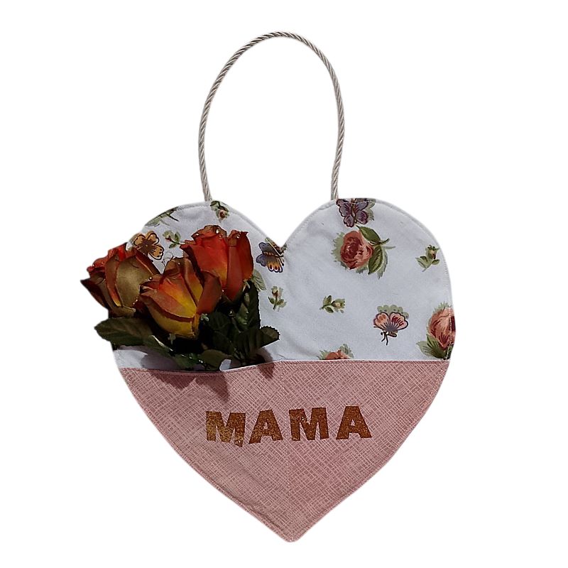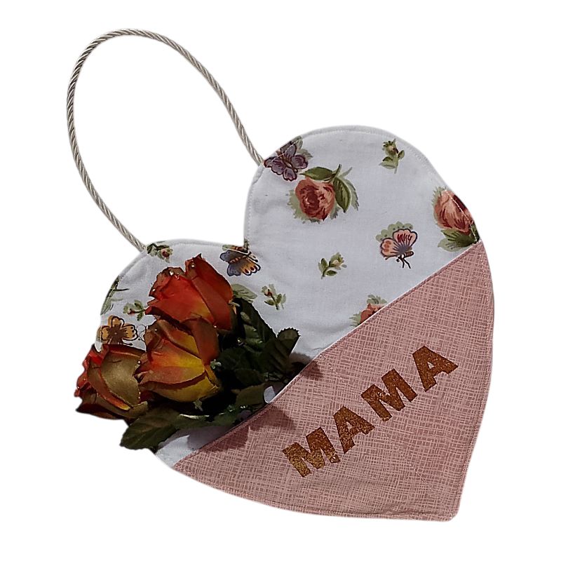 Κρεμαστή χειροποίητη θήκη τακτοποίησης, σε σχήμα καρδιάς απο βαμβακερό ύφασμα σε σομόν και λευκό με τριανταφυλλάκια, με τη λέξη ” ΜΑΜΑ ” σε χρυσό χρώμα, θα την παραλάβεις με 3 υφασμάτινα τριαντάφυλλα ( όπως στις φωτογραφίες ) . Η διάσταση της είναι 22 x22 εκατοστά και διαθέτει κορδόνι για να μπορείτε να την κρεμάσετε. Πανέμορφο και χρηστικό δωράκι για τη ΓΙΟΡΤΗ ΤΗΣ ΜΗΤΈΡΑΣ