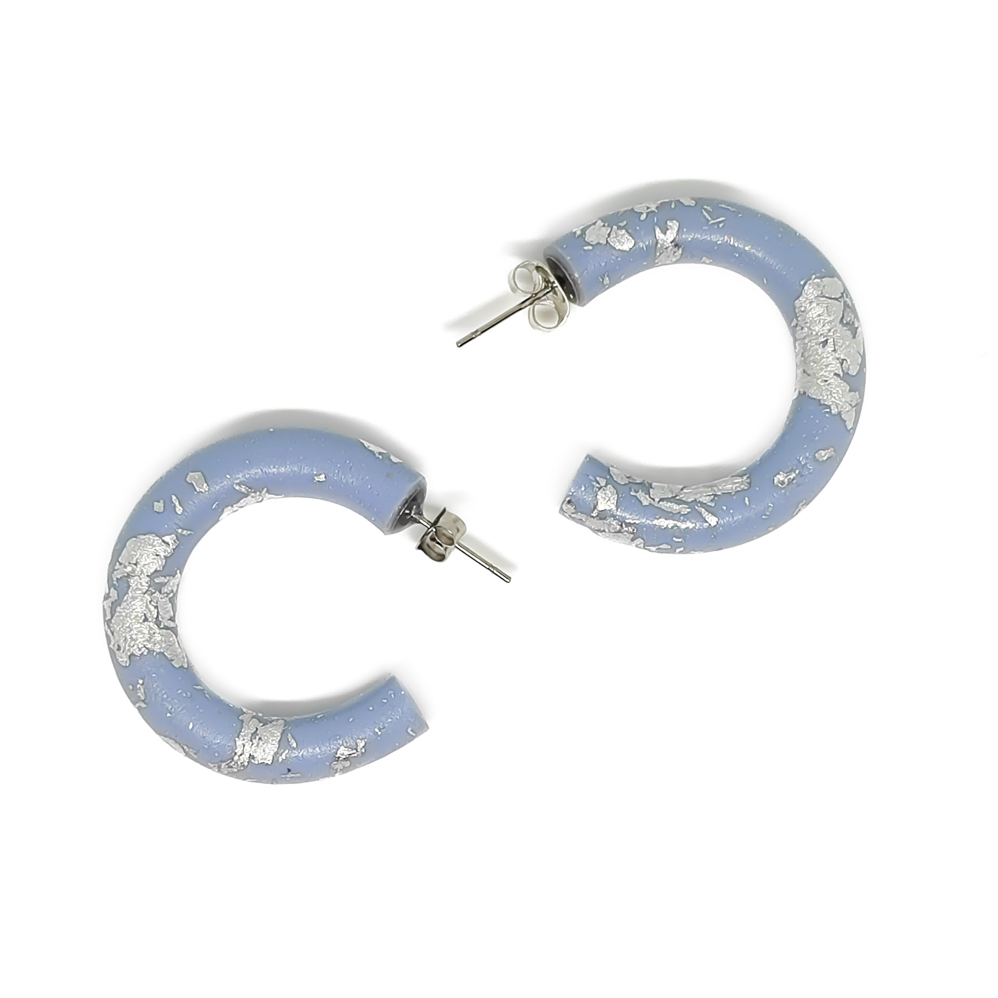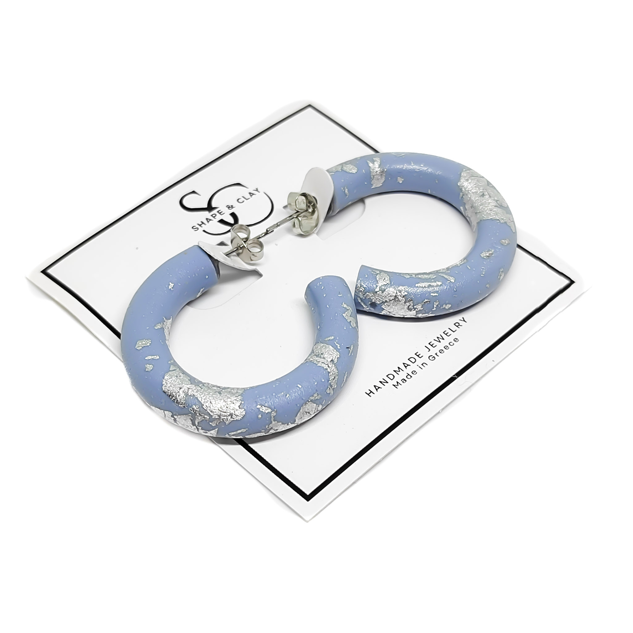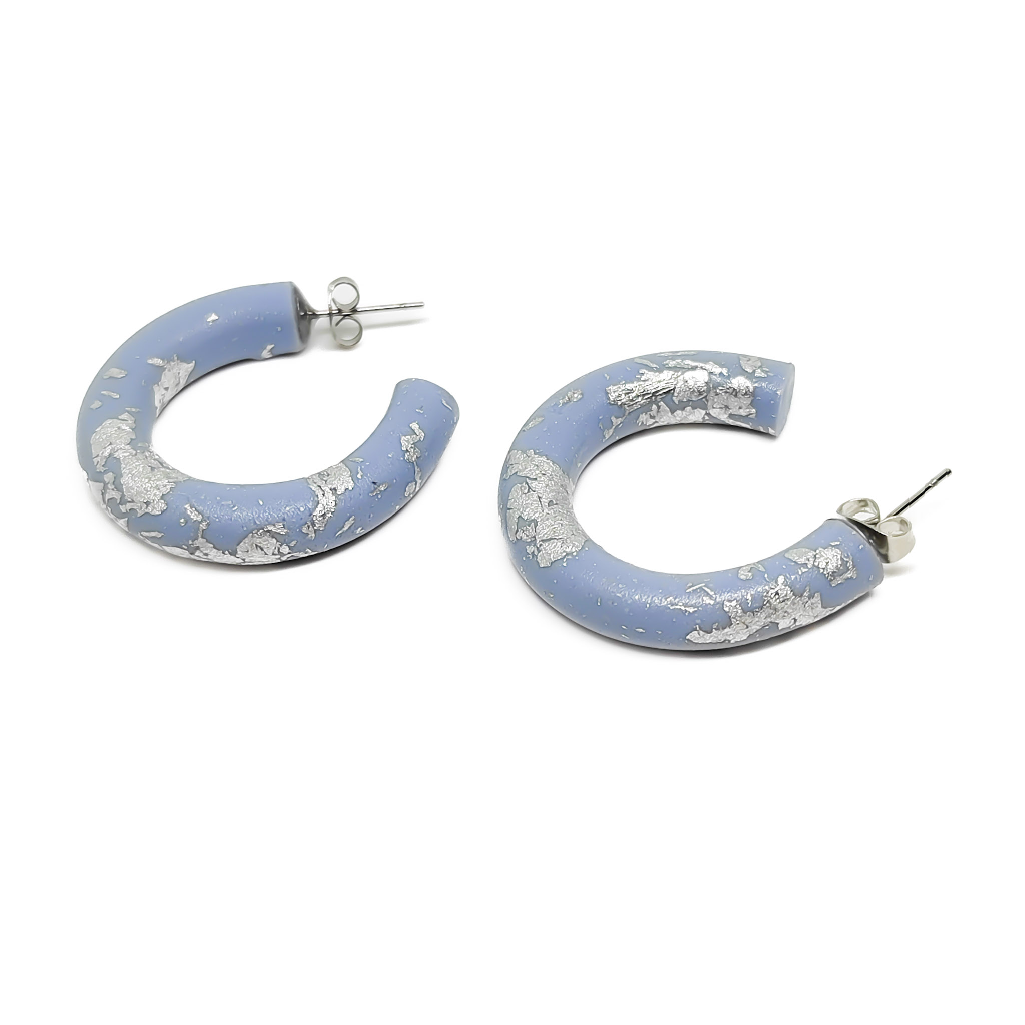 Χειροποίητα σκουλαρίκια κρίκοι από πολυμερικό πηλό σε χρώμα indigo με ασημένια φύλλα. Τα καρφάκια είναι ατσάλινα και είναι βερνικωμένα με gloss βερνίκι