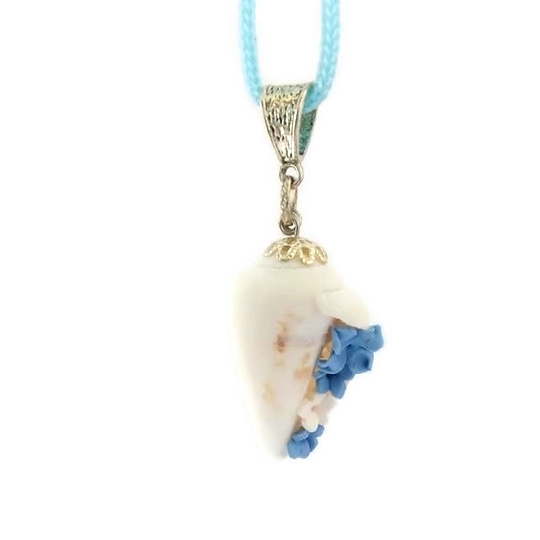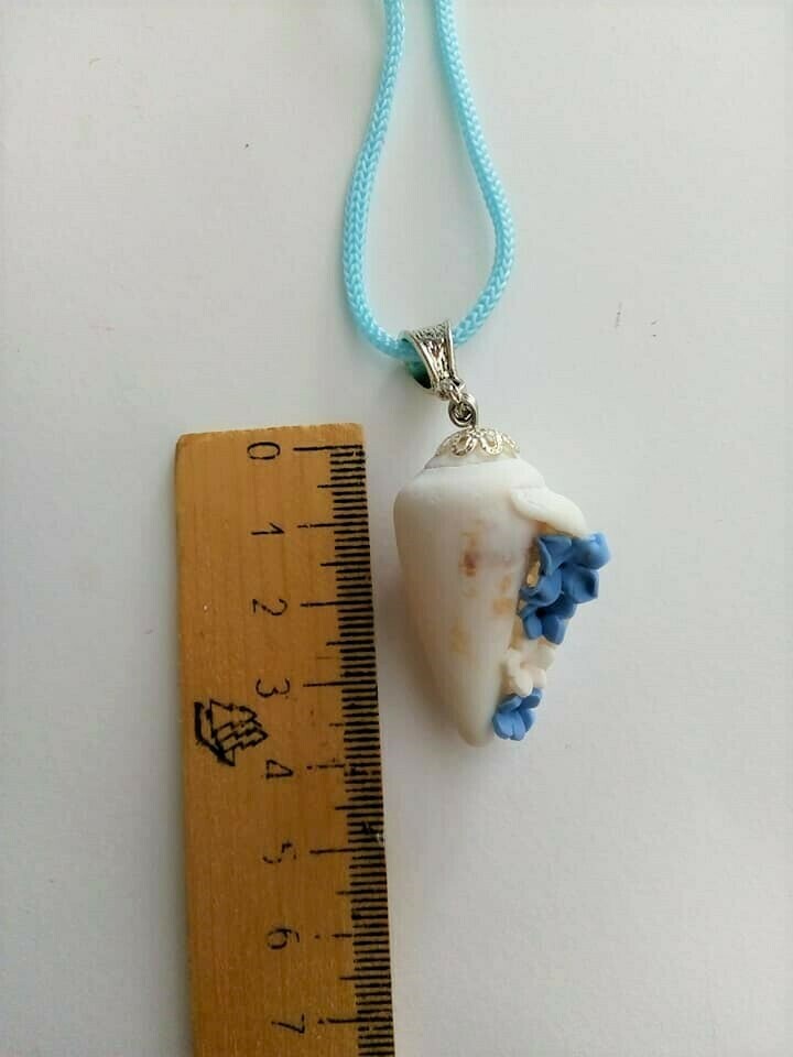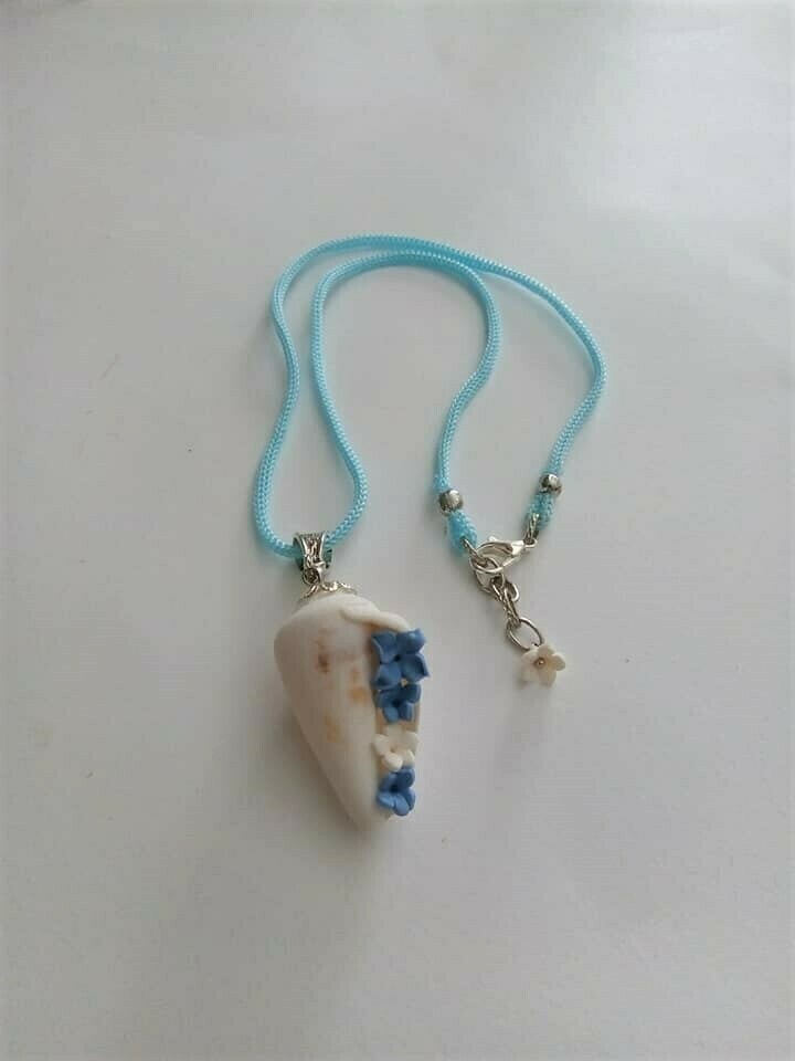 Κολιέ με Κοχύλι σε Λευκό Χρώμα 4 χ 2,5 εκ. Λουλούδια λευκό και γαλάζιο χρώμα. Από πολυμερικό πηλό.