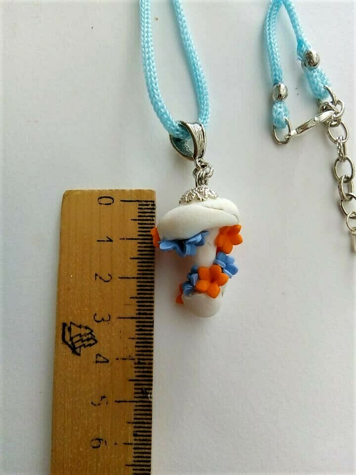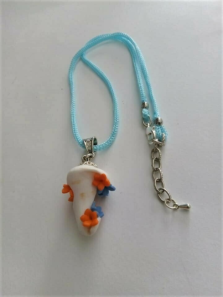 Γυναικείο κολιέ κοχύλι χειροποίητο σε Λευκό Χρώμα 3,2 χ 2,2 εκ. Λουλούδια πορτοκαλί και γαλάζιο χρώματα. Πολυμερικος Πηλός.