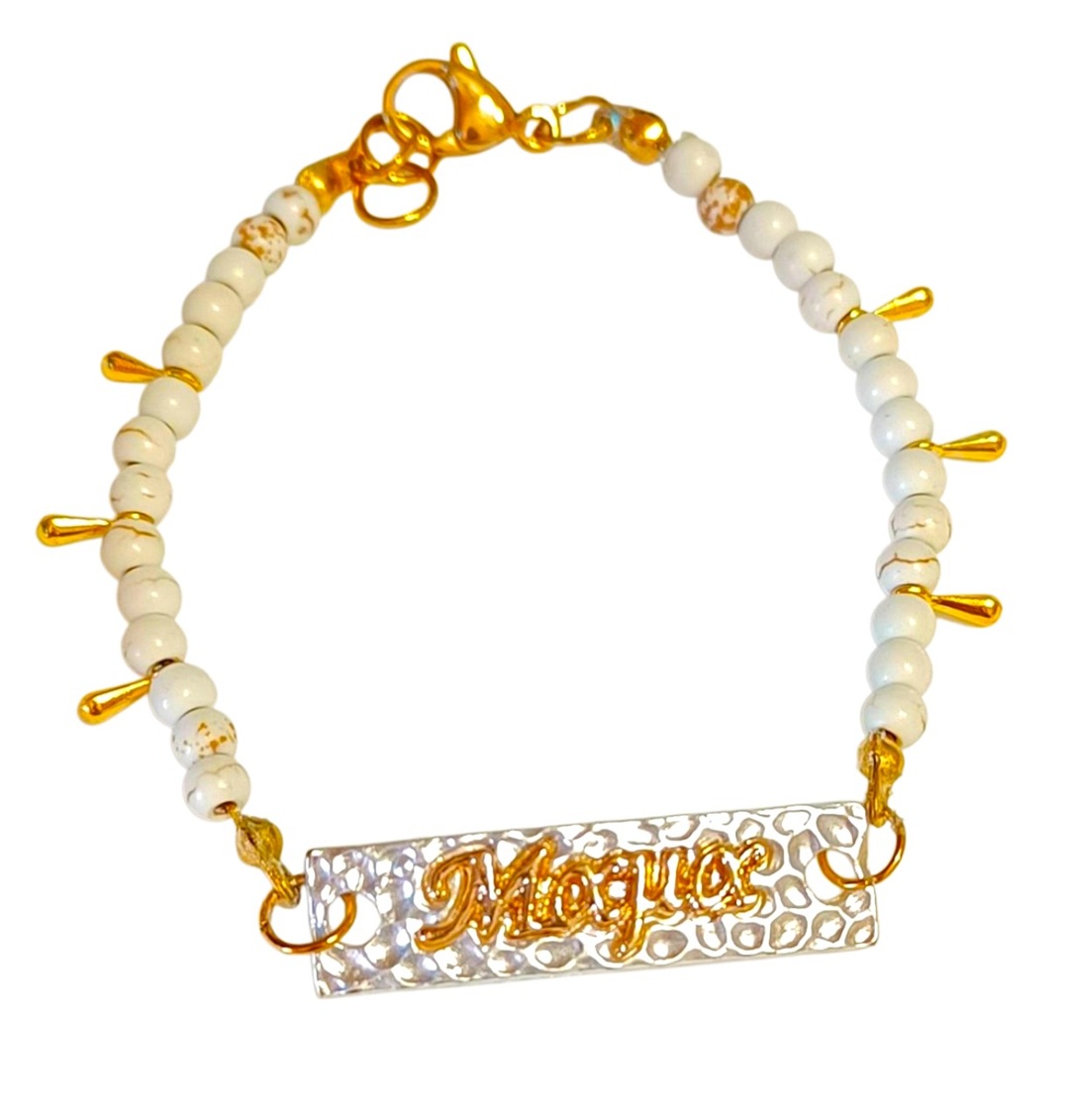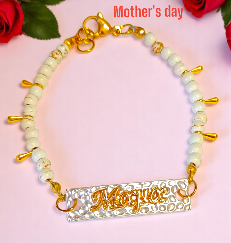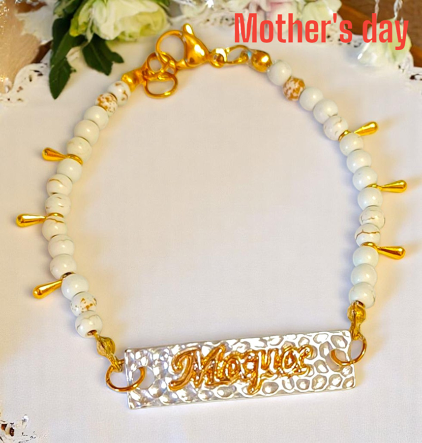 Χειροποιητο Βραχιολι Καδενα – Μαμα – με ημιπολυτιμο λιθο Χαολιτη ,ατσαλινες χρυσες σταγονες και ασημι καδενα σφυρηλατη με χρυση αναγλυφη τη λεξη Μαμα.Αυξομειουμενο με ατσαλινο καβουρακι