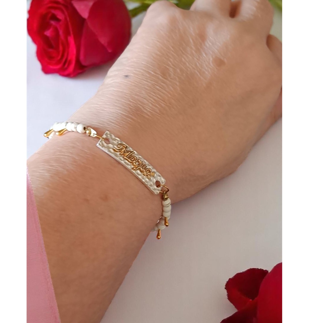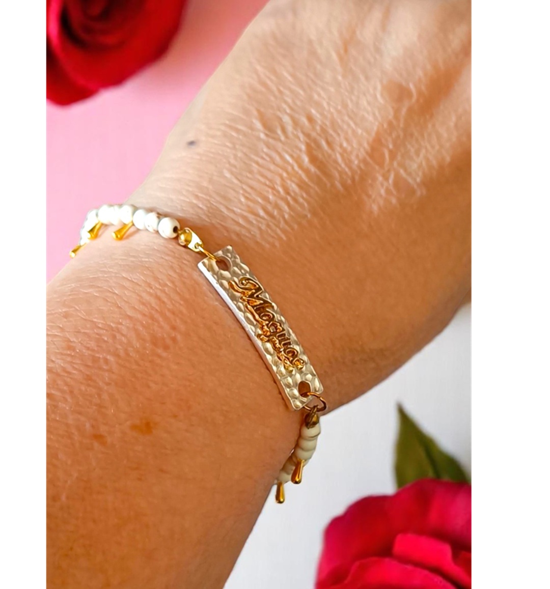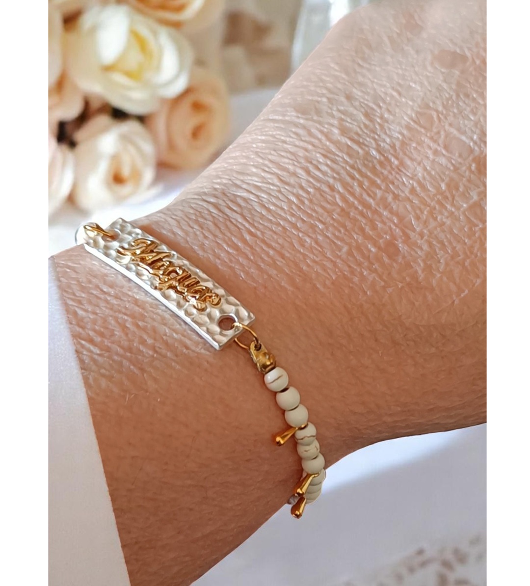 Χειροποιητο Βραχιολι Καδενα – Μαμα – με ημιπολυτιμο λιθο Χαολιτη ,ατσαλινες χρυσες σταγονες και ασημι καδενα σφυρηλατη με χρυση αναγλυφη τη λεξη Μαμα.Αυξομειουμενο με ατσαλινο καβουρακι