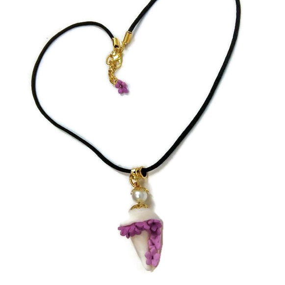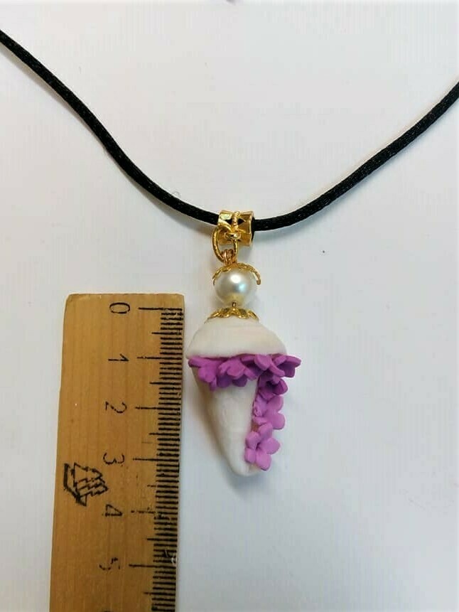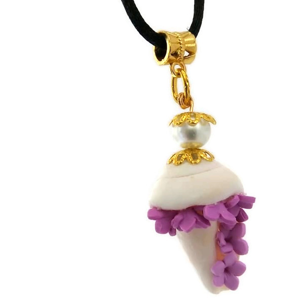 Κολιέ με Κοχύλι σε Λευκό Χρώμα 3χ2 εκ. Λουλούδια μωβ-λιλά χρώματα. Πολυμερικος Πηλός – Μήκος 44 εκ. μαύρο κορδόνι