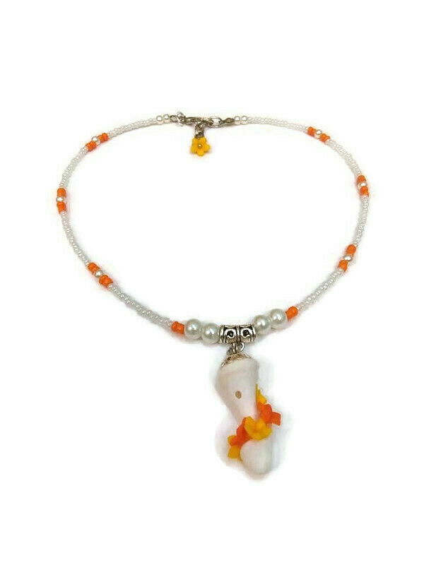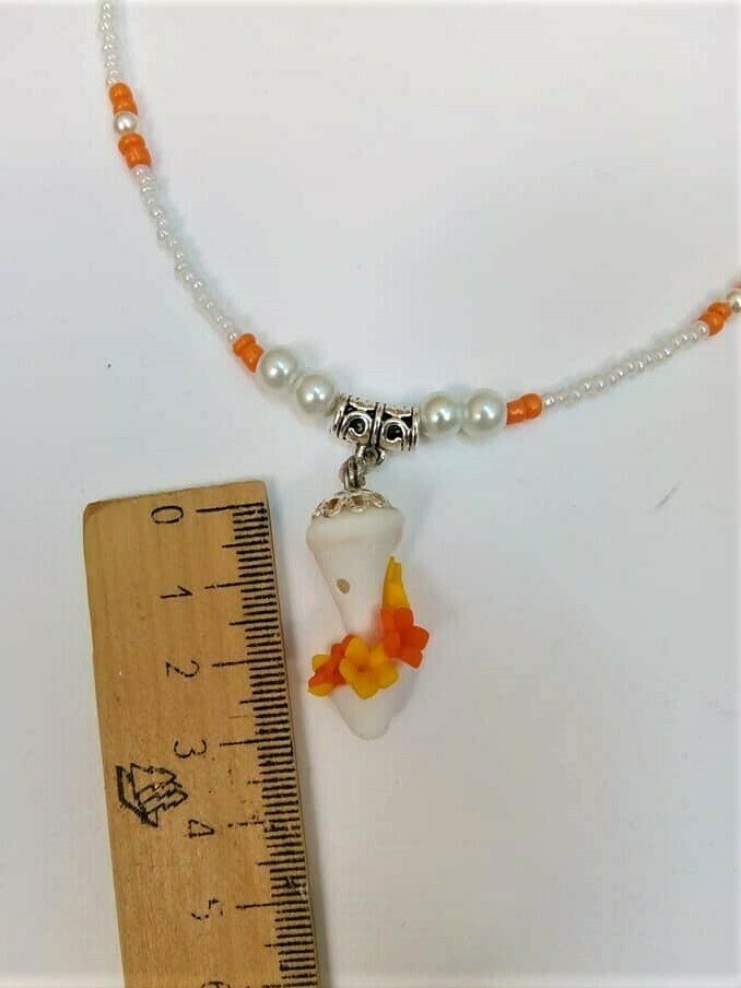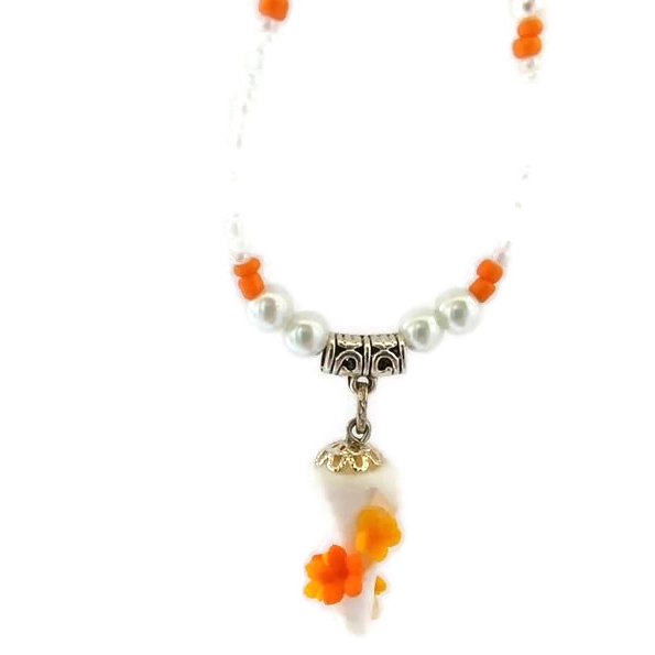 Κολιέ με φυσικό κοχύλι σε λευκό χρώμα (3×1,3 εκ.) με χάντρες και πέρλες – μήκος 40 εκ. Λουλούδια σε πορτοκαλί-κίτρινο χρώμα από πολυμερικό πηλό. Μοναδικό χειροποίητο κομμάτι.