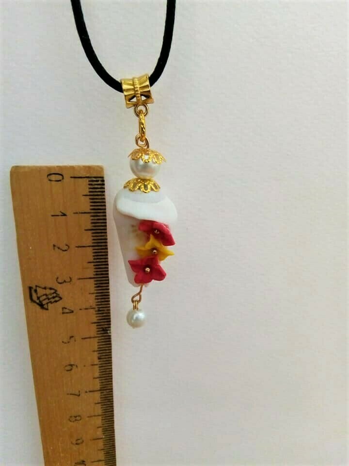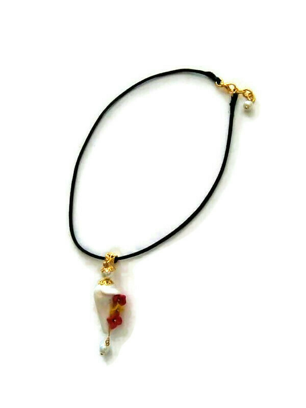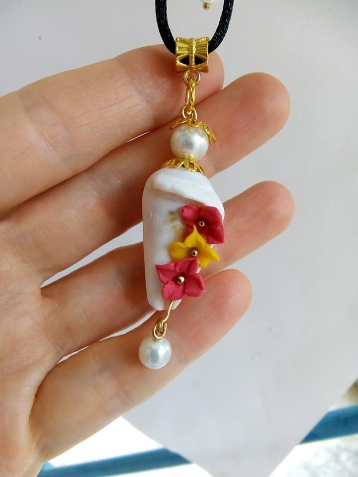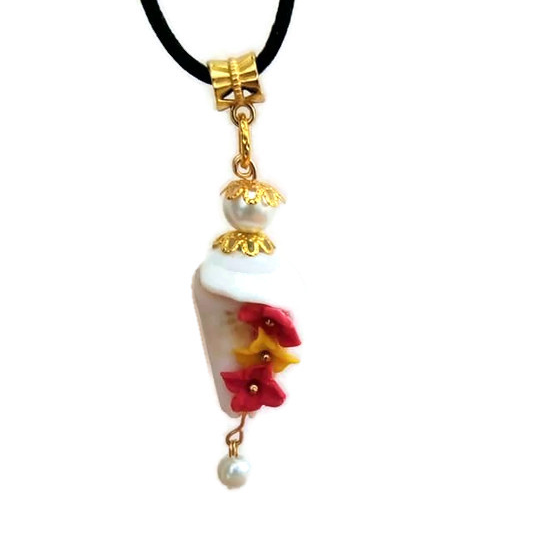 Κολιέ με Κοχύλι φυσικό σε Λευκό Χρώμα 3χ1,8 εκ. με μαύρο κορδόνι 40εκ. με Πέρλες και λουλούδια από πολυμερικο πηλό.