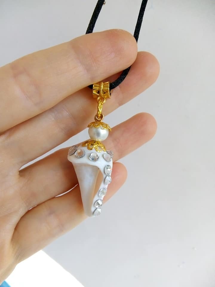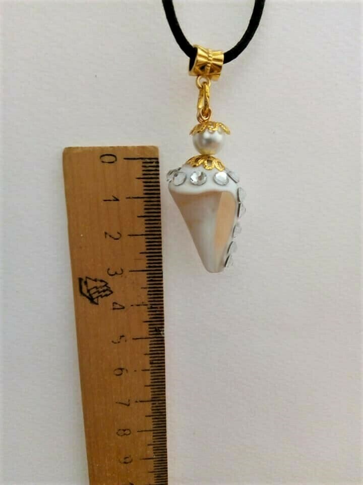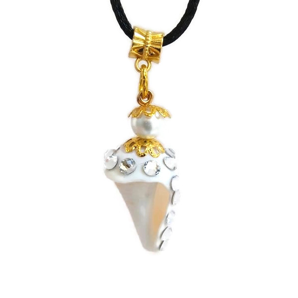 Κολιέ με Κοχύλι φυσικό σε Λευκό Χρώμα 3χ1,5 εκ. με μαύρο κορδόνι 40εκ. με Πέρλες και στρασακια.