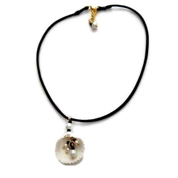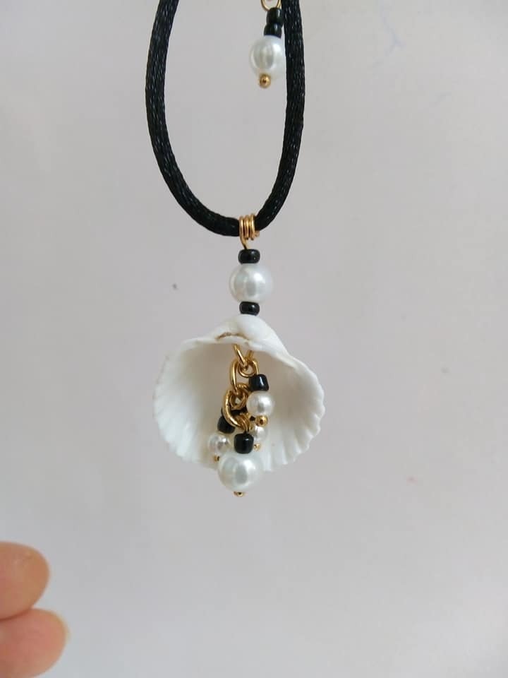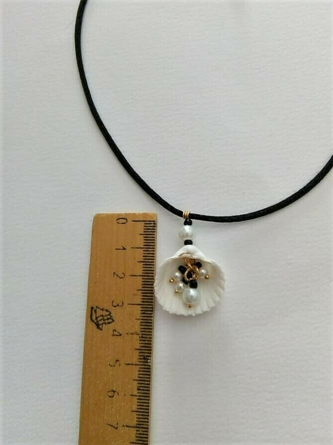 Κολιέ με Κοχύλι φυσικό σε Λευκό Χρώμα 2,5χ2,5 εκ. με μαύρο κορδόνι 40εκ. και με Πέρλες. Μοναδικό χειροποίητο κομμάτι.