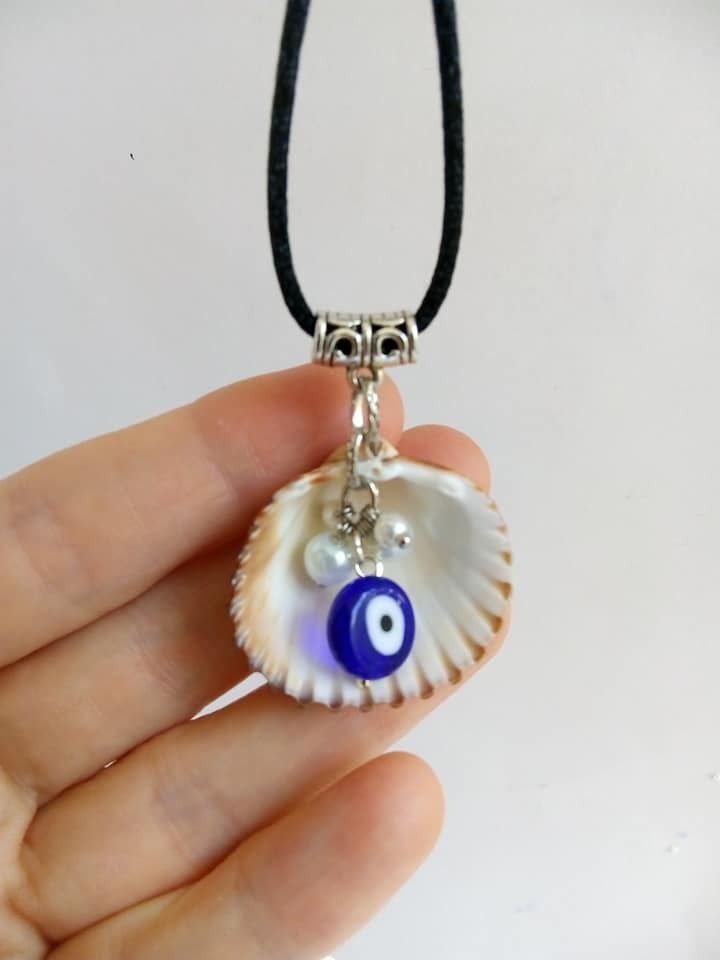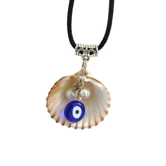 Κολιέ με Κοχύλι φυσικό σε Λευκό-Καφέ Χρώμα 3,5χ3,5 εκ. με μαύρο κορδόνι 40εκ. και με γυάλινο μπλε ματάκι. Μοναδικό χειροποίητο κομμάτι
