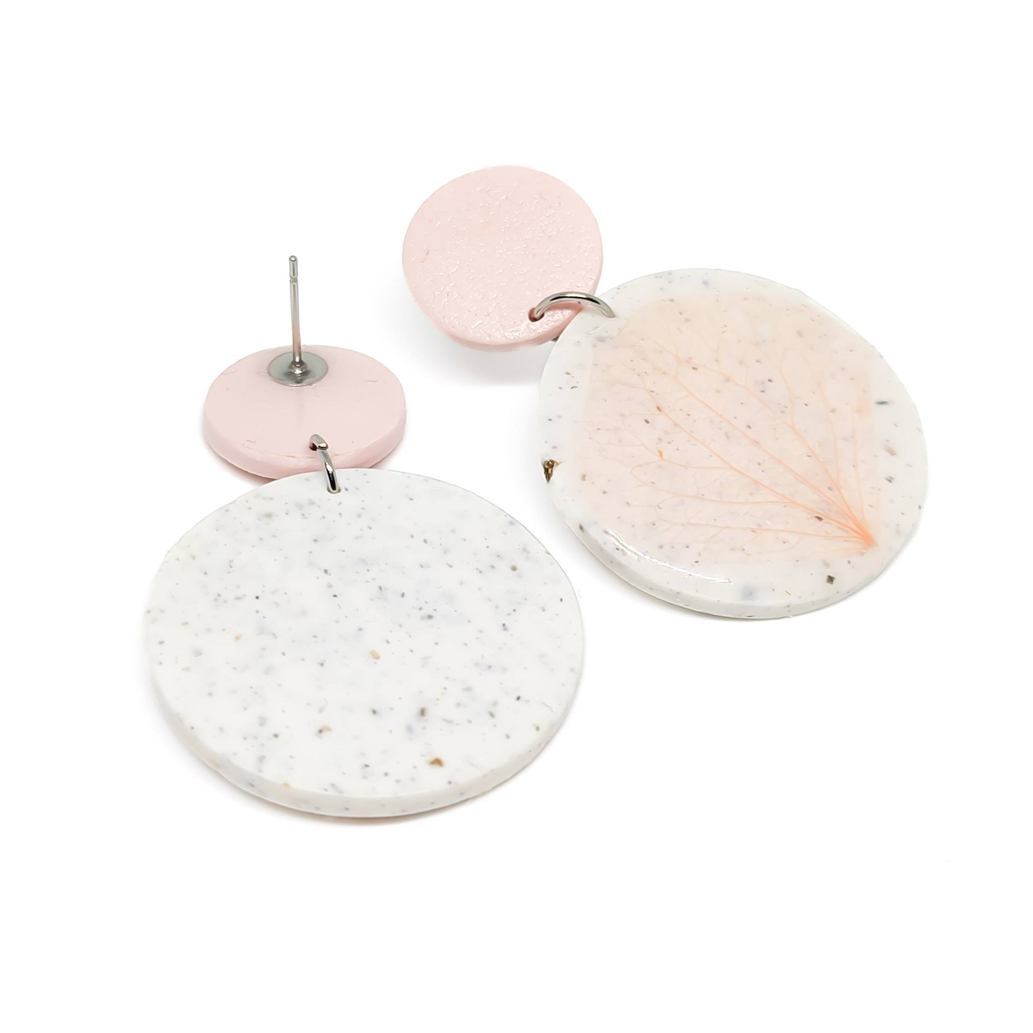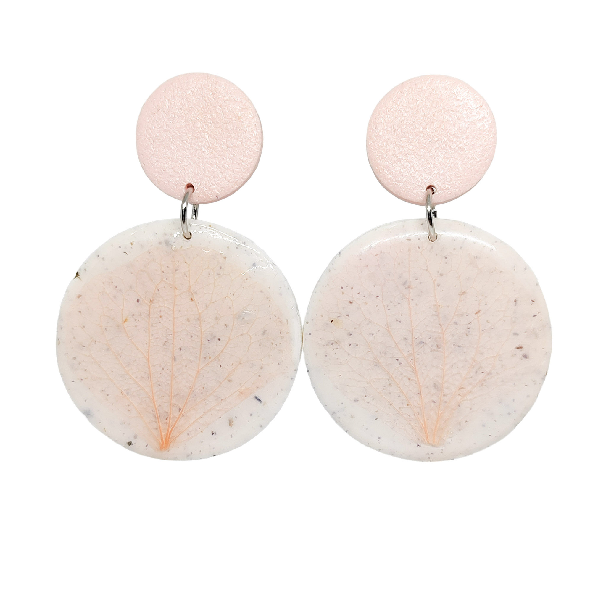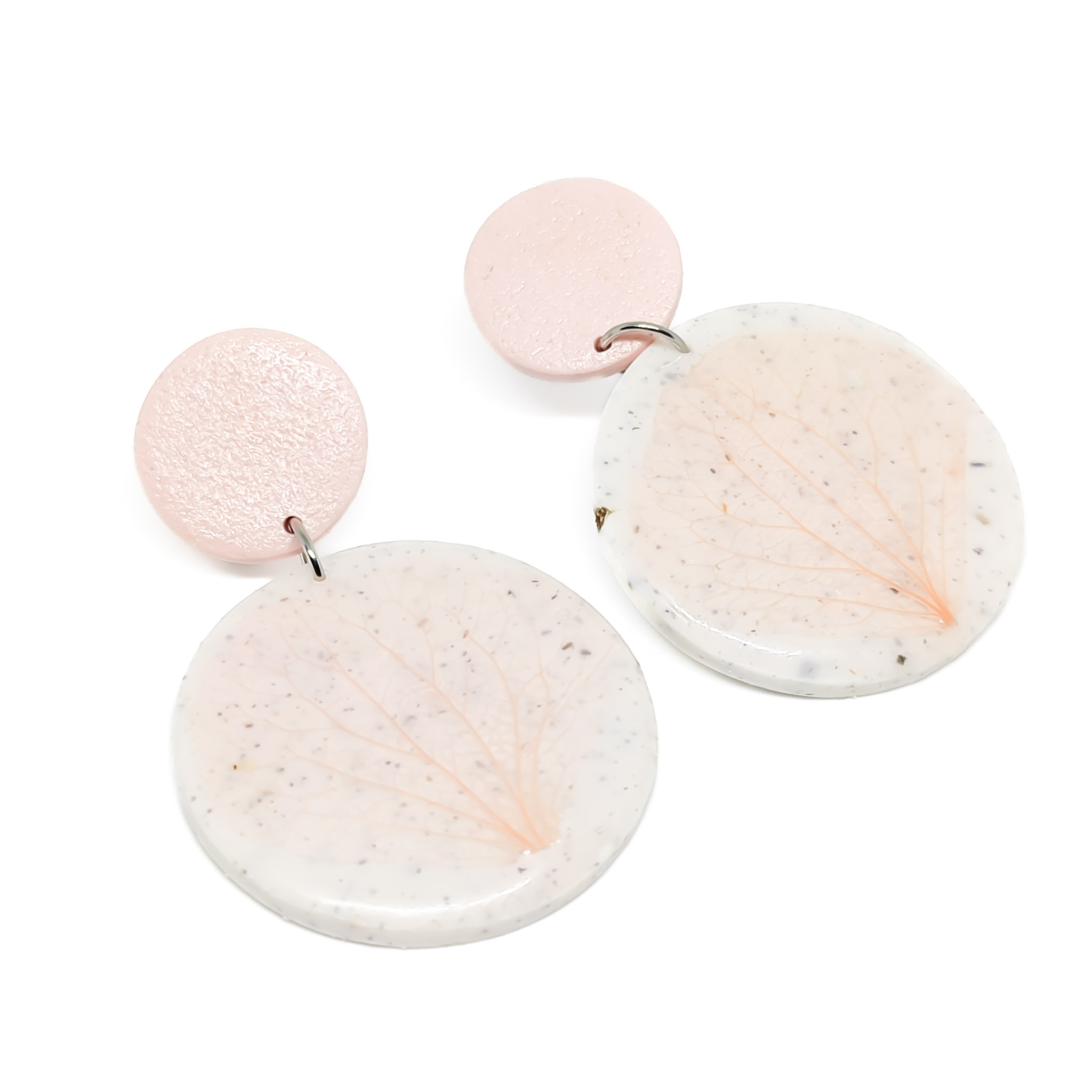 Μοναδικά χειροποίητα κρεμαστά καρφωτά σκουλαρίκια από πολυμερικό πηλό που περιέχει βότανα. Tα λουλούδια είναι αποξηραμένα φύλλα σε ροζ χρώμα. Τα σκουλαρίκια έχουν επίστρωση ρητίνης στην περιοχή των λουλουδιών.