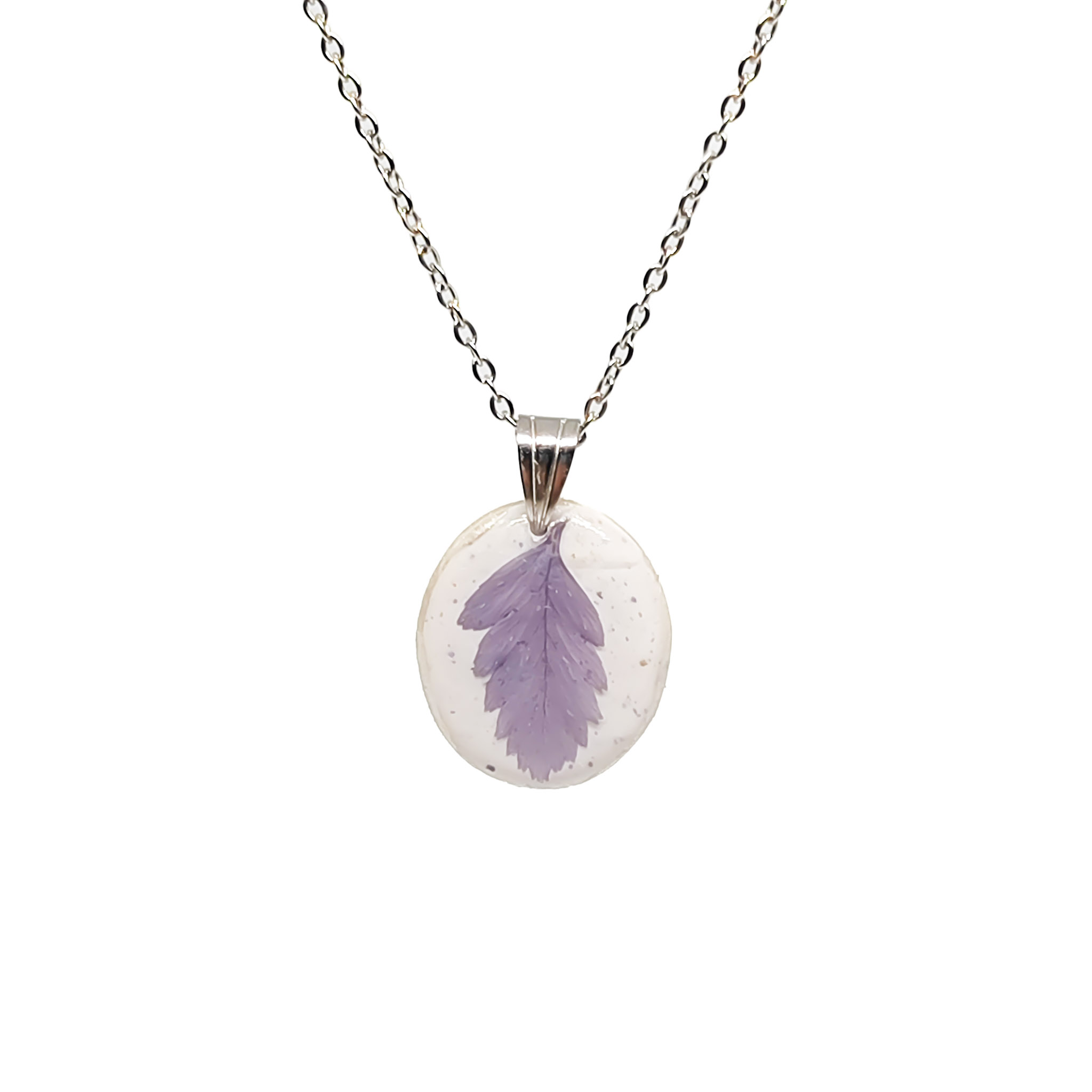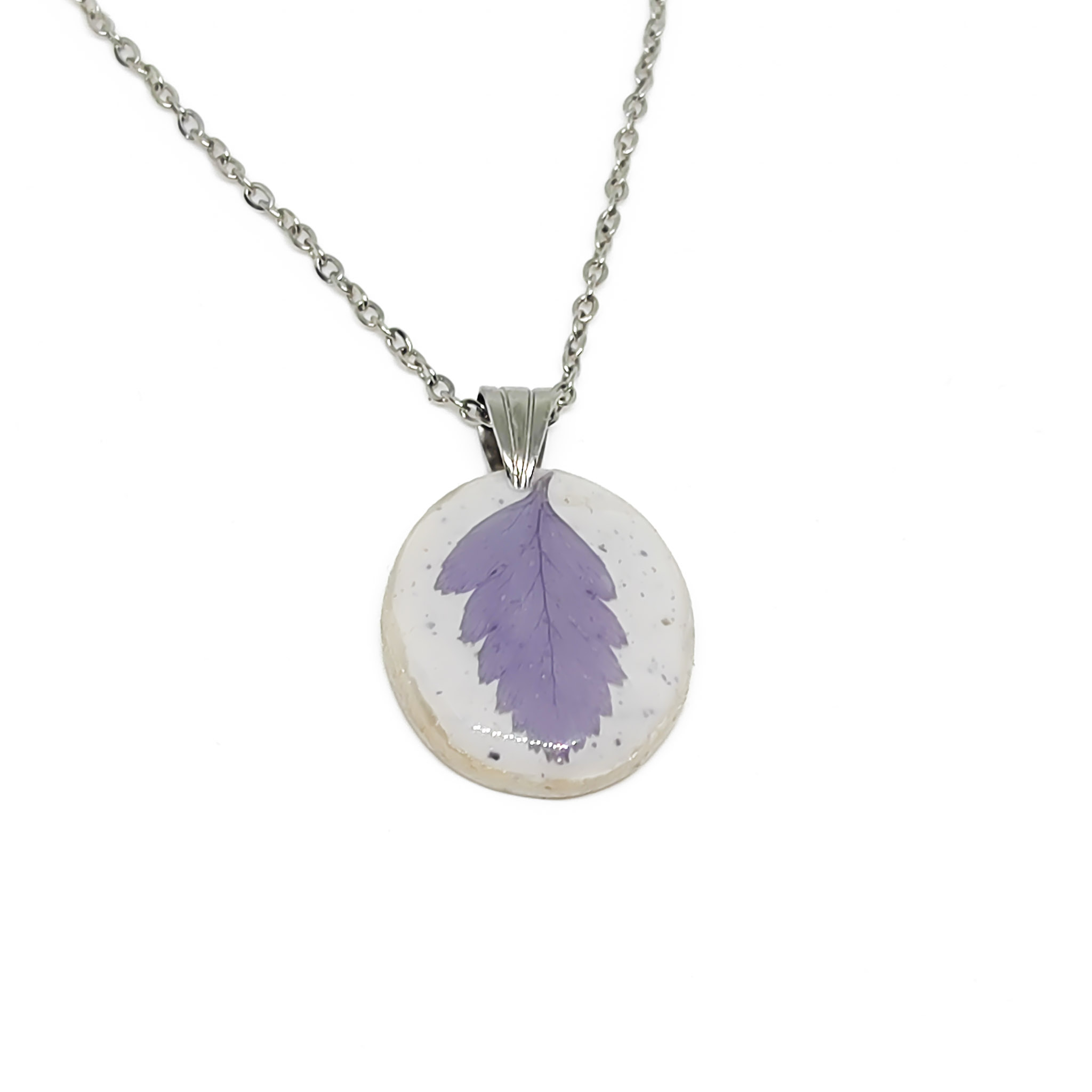 Χειροποίητο κολιέ από πολυμερικό πηλό προστατευμένο που περιέχει αποξηραμένα βότανα. Το κολιέ έχει ένα αποξηραμένο φύλλο σε λιλά χρώμα. Το πίσω μέρος του κολιέ είναι ζωγραφισμένο με ασημί ακρυλικό χρώμα. Η αλυσίδα είναι από ανοξείδωτο υποαλλεργικό ατσάλι 304, διαστάσεις: 45εκ, 50εκ και 60εκ.