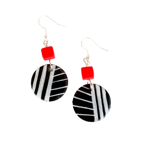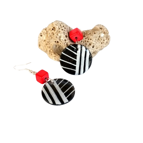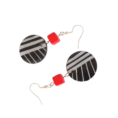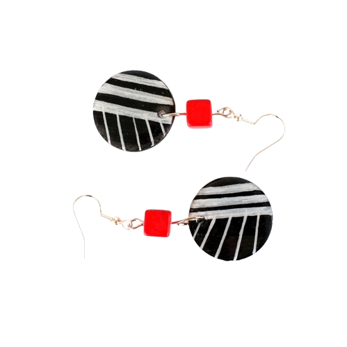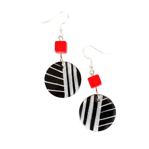 Σκουλαρίκια ξύλινα κρεμαστά από ξύλο σε στρογγυλό σχήμα, ζωγραφισμένα στο χέρι με ακρυλικά χρώματα – μαύρο, με λευκές λεπτομέρειες. Είναι περασμένα με υγρό γυαλί για προστασία και λάμψη, το κούμπωμα είναι επάργυρο σκουλαρίκι hook μεταλλικό, χάντρα τετράγωνη σε κόκκινο χρώμα στο κάθε σκουλαρίκι.