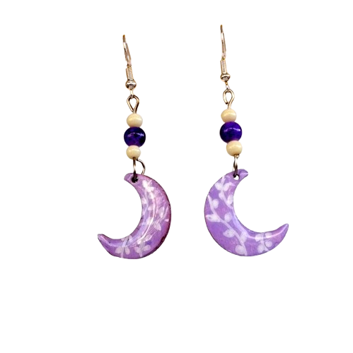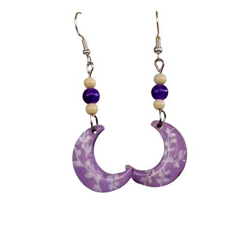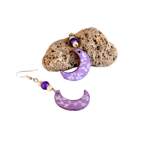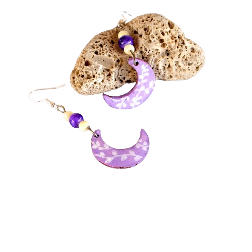 Σκουλαρίκια ξύλινα κρεμαστά από ξύλο σε σχήμα φεγγαριού, ζωγραφισμένα στο χέρι με ακρυλικά χρώματα – μωβ ανοικτό, με λευκές λεπτομέρειες. Είναι περασμένα με υγρό γυαλί για προστασία και λάμψη, το κούμπωμα είναι επάργυρο σκουλαρίκι hook μεταλλικό, μωβ και λευκές ακρυλικές χάντρες στο κάθε σκουλαρίκι.