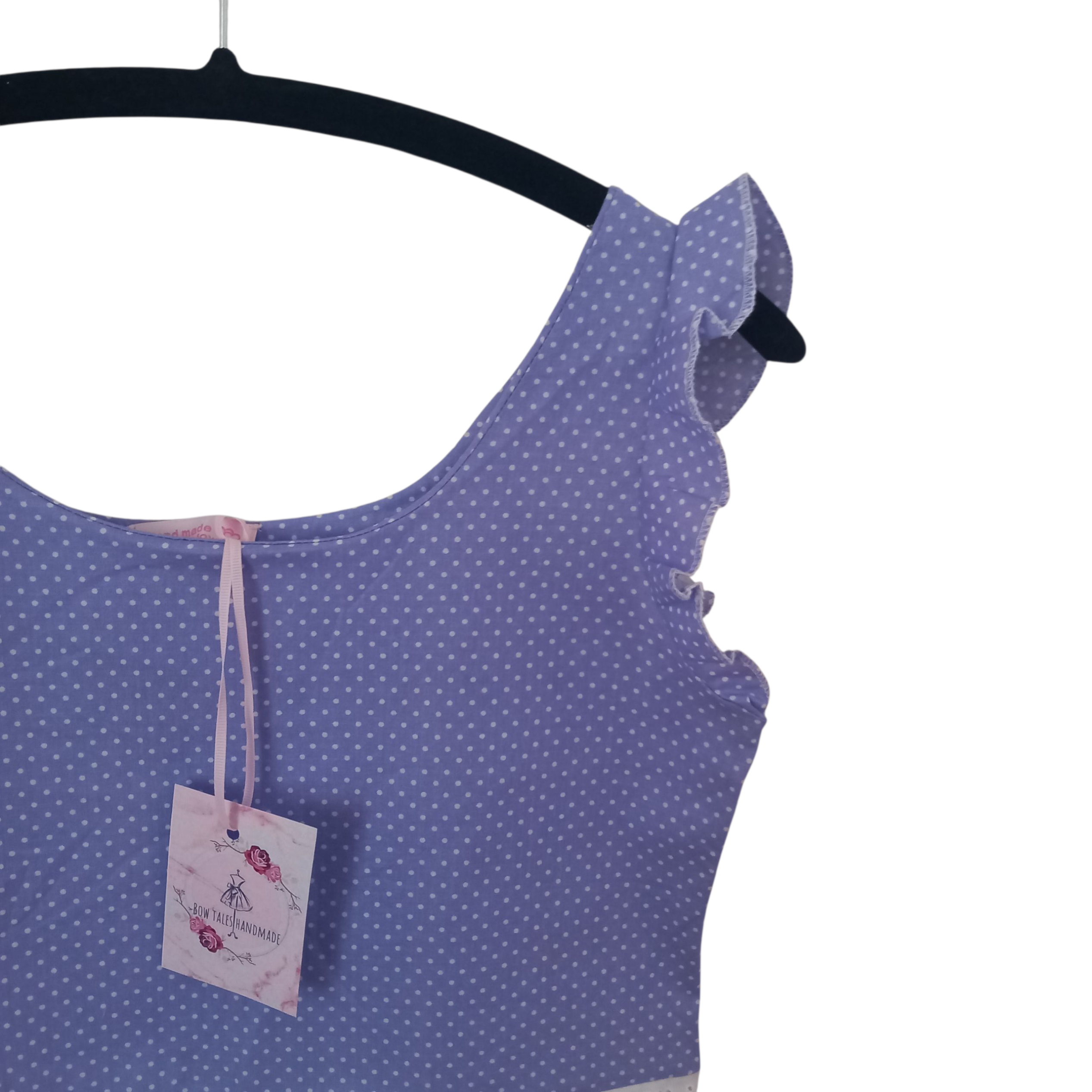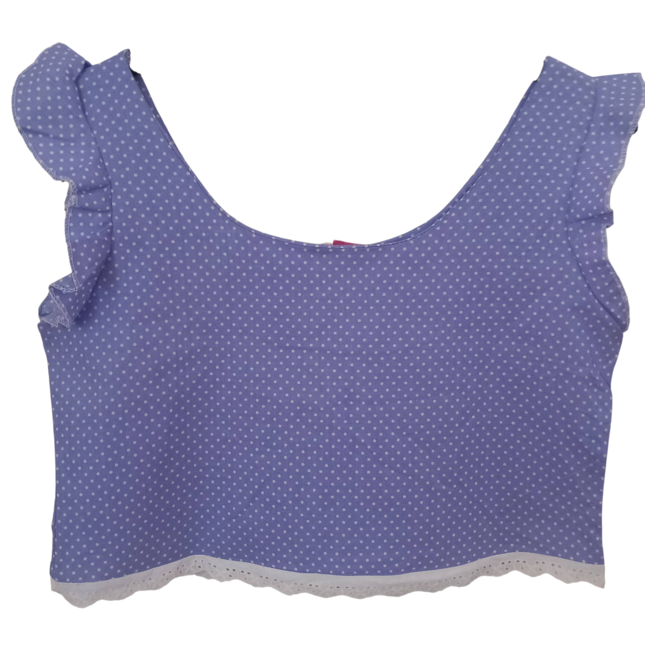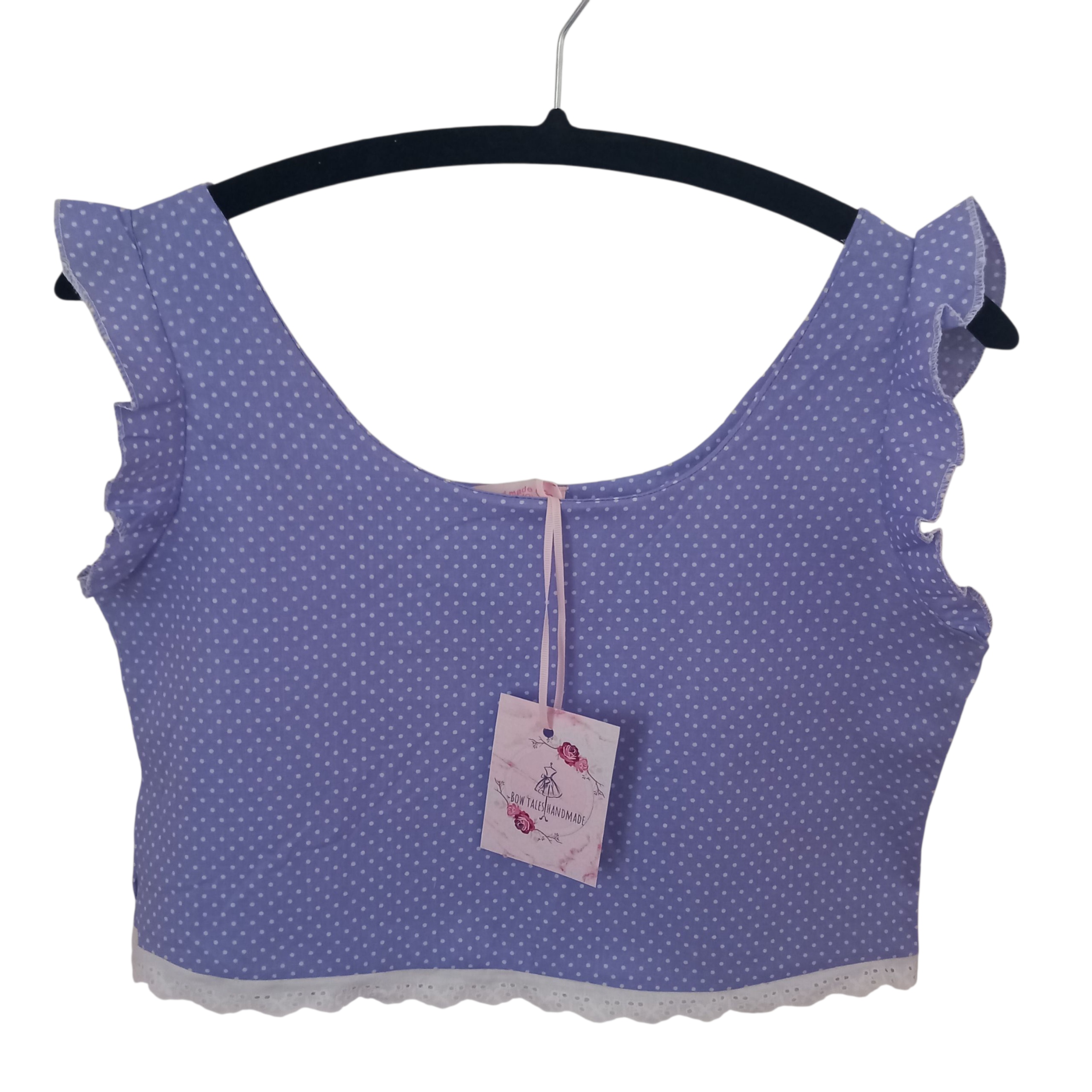 Χειροποίητο crop top από πουά μωβ βαμβακερή ποπλίνα με βολάν. Με διακοσμητική βαμβακερή δαντέλα στο κάτω μέρος. Χωρίς φερμουάρ. Καλύπτει νούμερο XXS-S