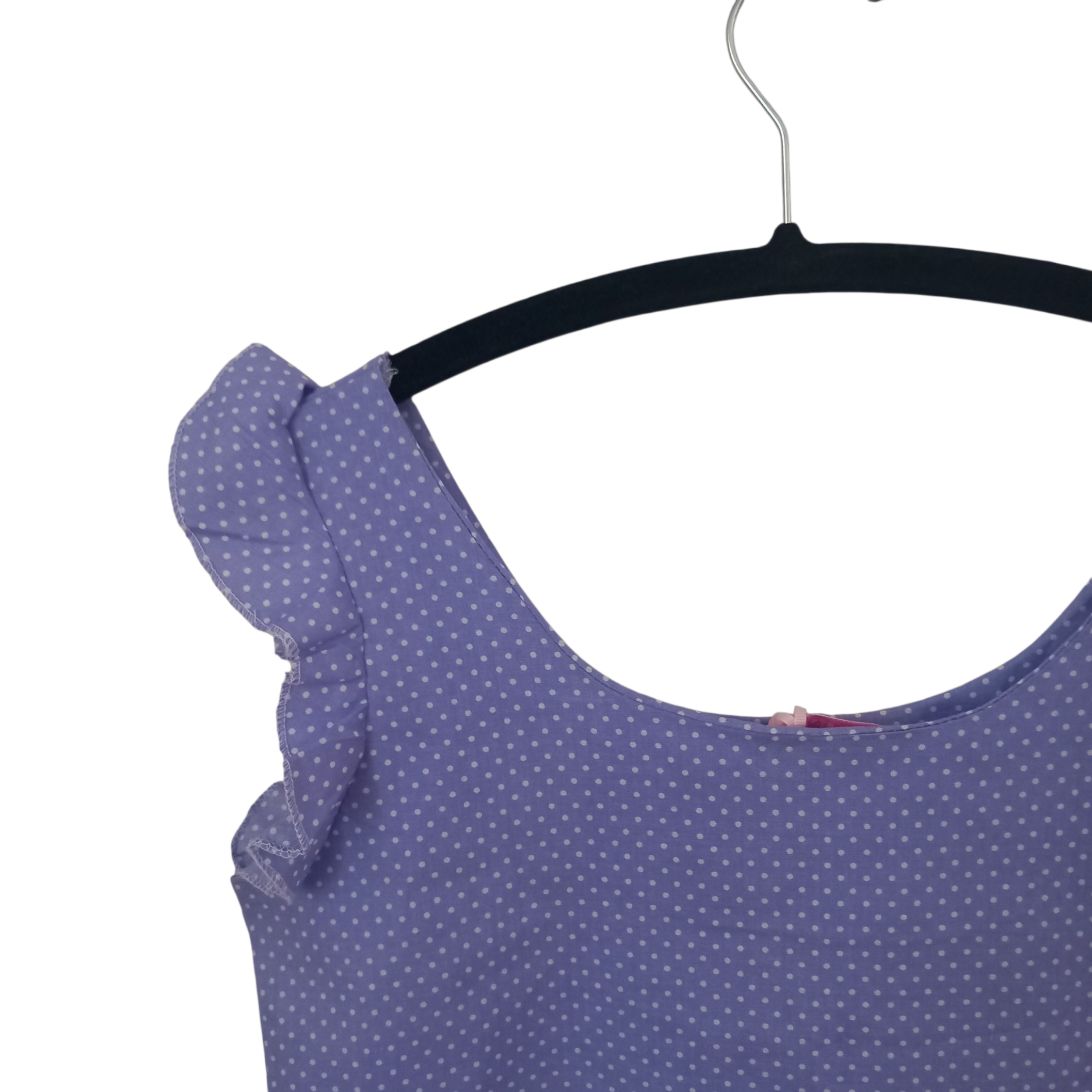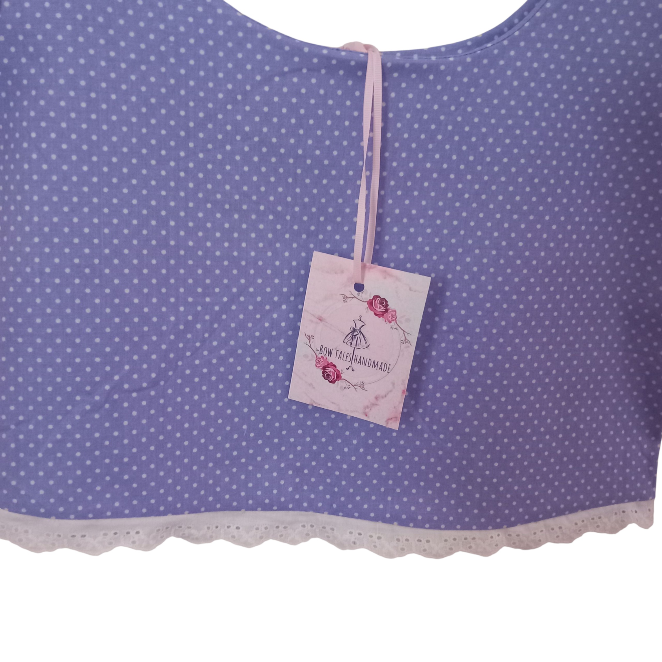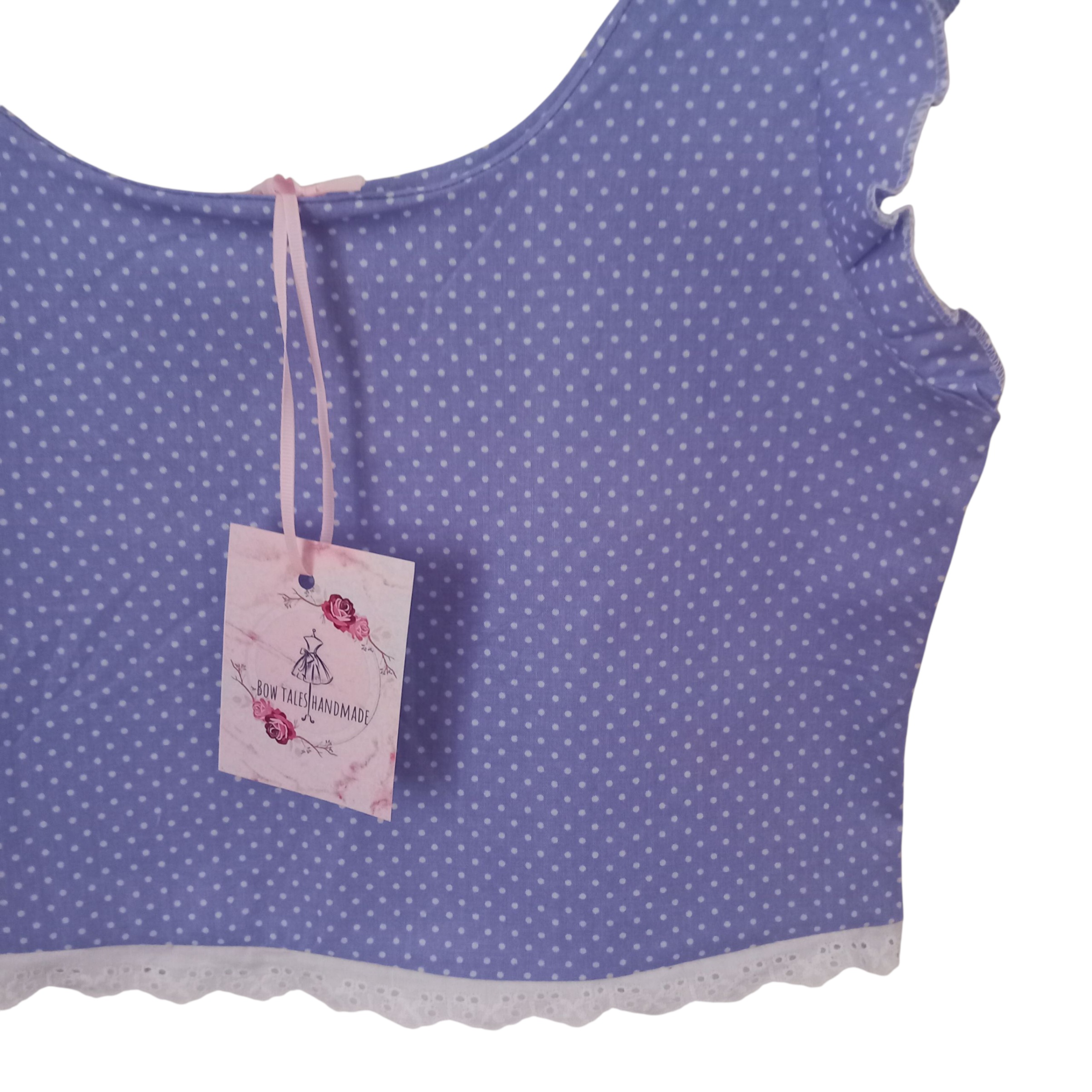 Χειροποίητο crop top από πουά μωβ βαμβακερή ποπλίνα με βολάν. Με διακοσμητική βαμβακερή δαντέλα στο κάτω μέρος. Χωρίς φερμουάρ. Καλύπτει νούμερο XXS-S