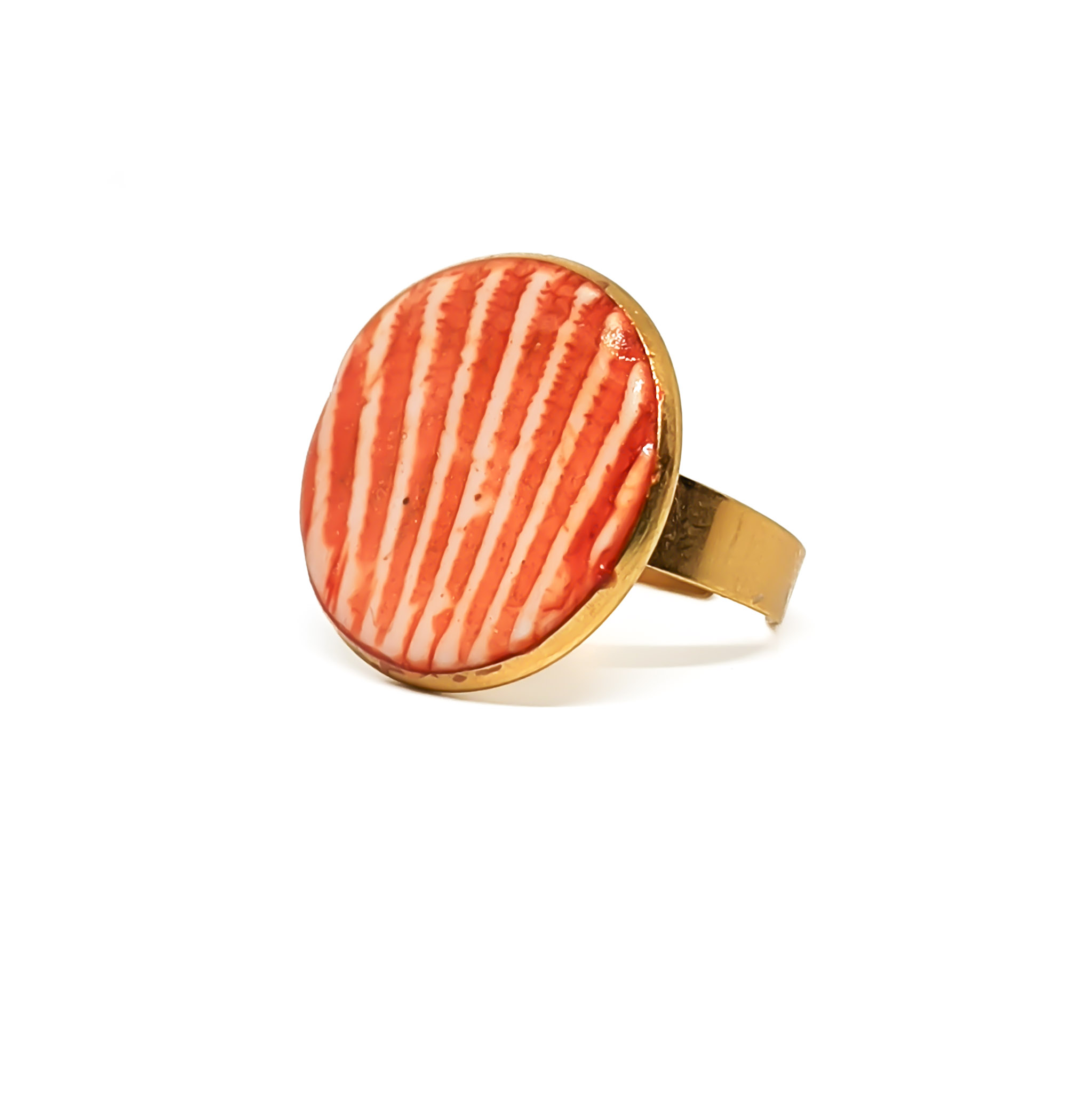 Χειροποίητο ατσάλινο δαχτυλίδι με ρυθμιζόμενο μέγεθος που είναι αποτύπωμα κοχυλιού σε χρώμα πορτοκαλί.