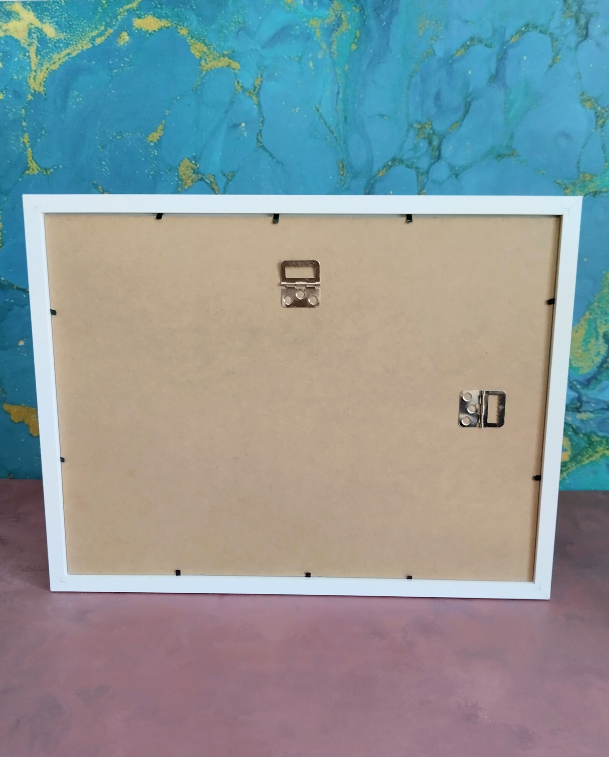 Είναι πλαισιωμένο από λευκή ξύλινη κορνίζα.