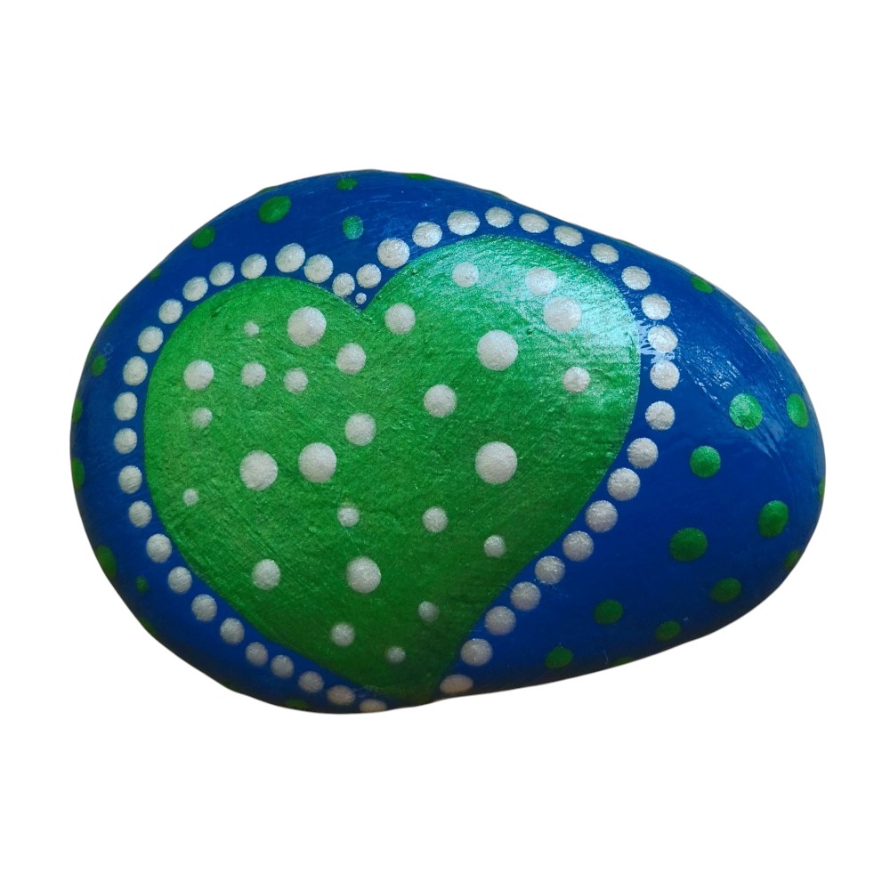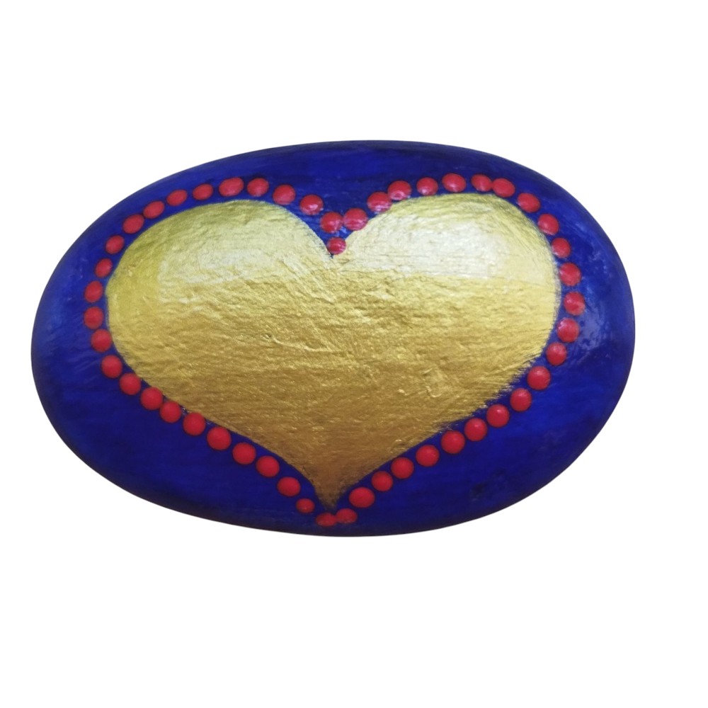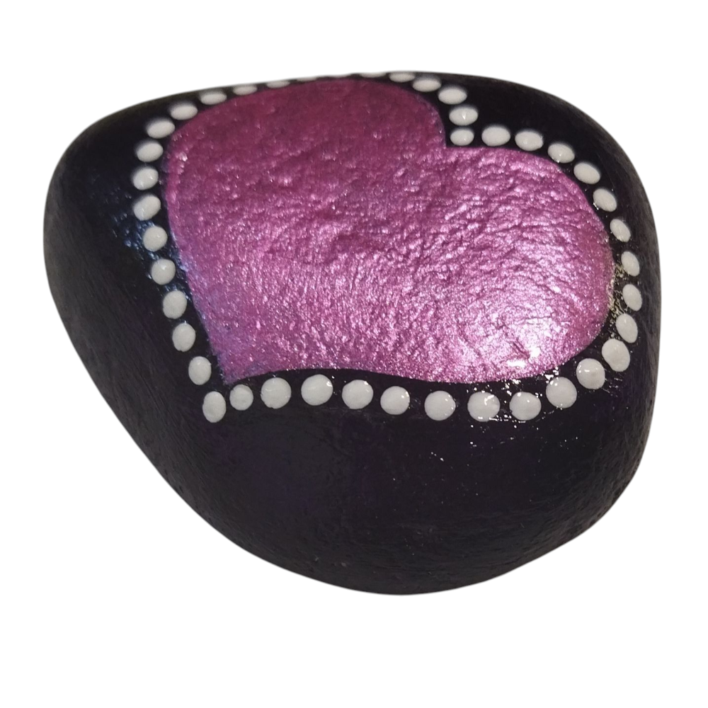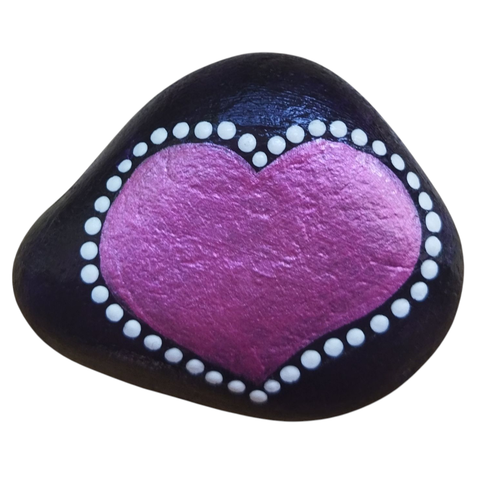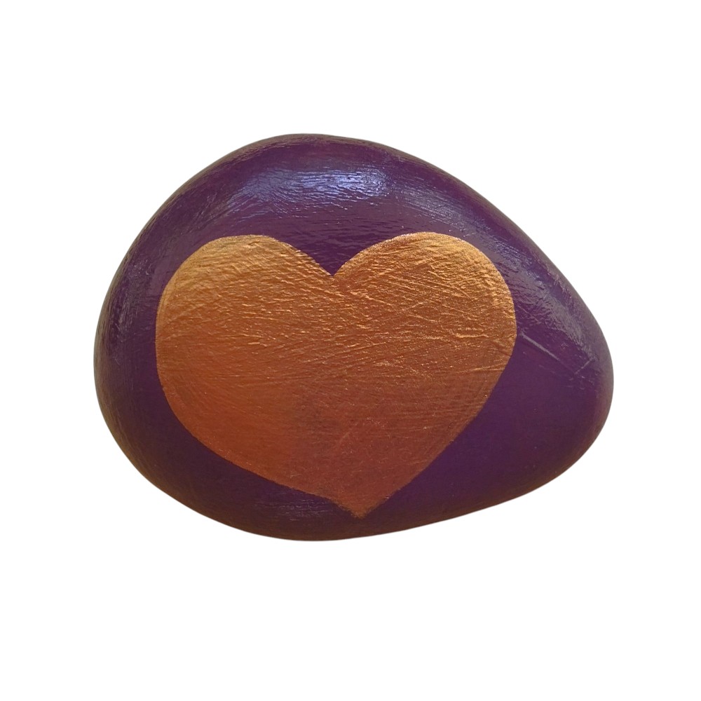 Σετ από 5 ζωγραφισμένα βότσαλα με θέμα την καρδιά. Οι καρδιές είναι ζωγραφισμένες με ακρυλικά μεταλλικά χρώματα, ενώ για το φόντο έχουν χρησιμοποιηθεί επίσης ακρυλικά χρώματα σε αποσρώσεις του μπλε, μωβ και μπορντό. Ιδανικά για διακόσμηση, για να χαρίσουν μια τρυφερή πινελιά στο σπίτι ή για να προσφερθούν ως ξεχωριστό δώρο αγάπης.