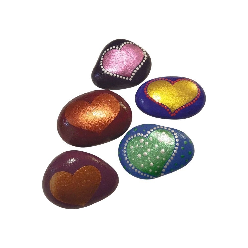 Metallic hearts, σετ από 5 ζωγραφισμένα βότσαλα.