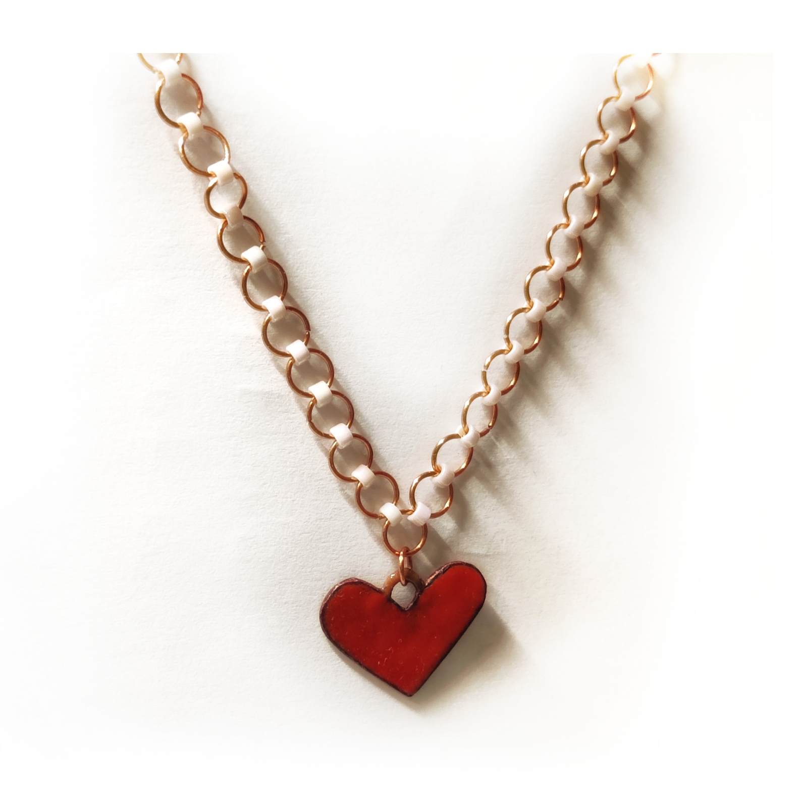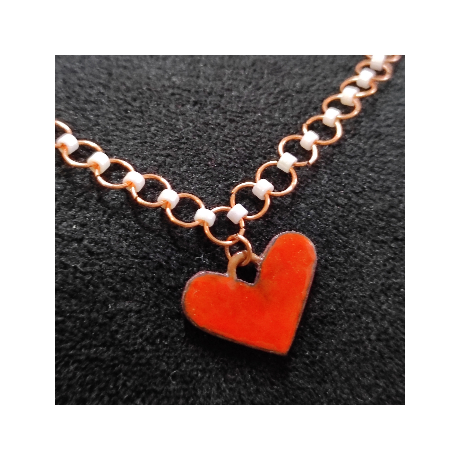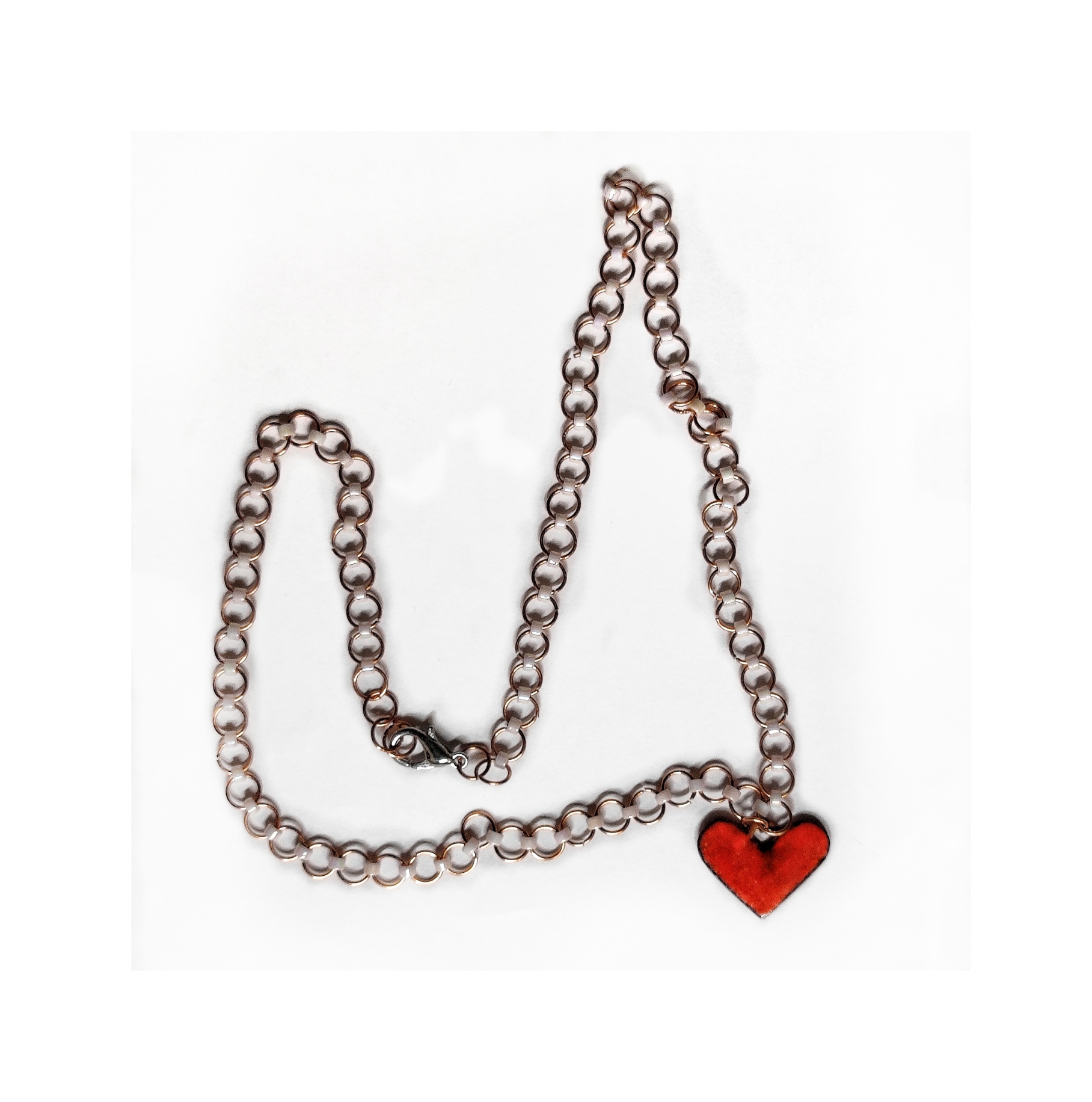 Καρδιά χαλκού επικαλυμμένη με κόκκινο σμάλτο, έχει αλυσίδα χάλκινη πλεγμένη με χάντρες χρώματος μπεζ περλέ. Εξ ολοκλήρου χειροποίητο.