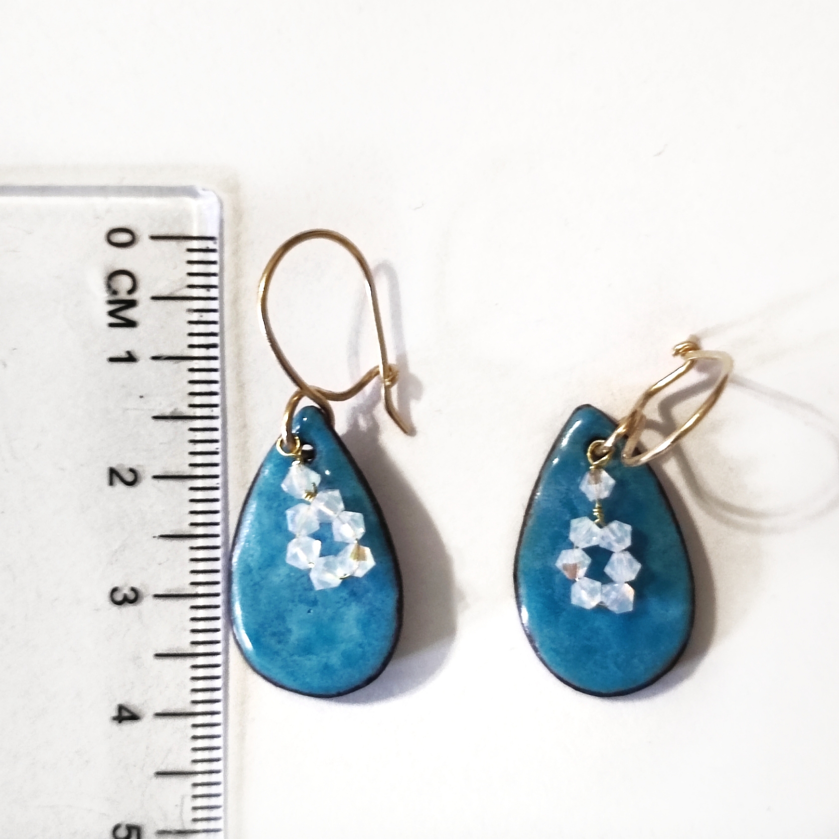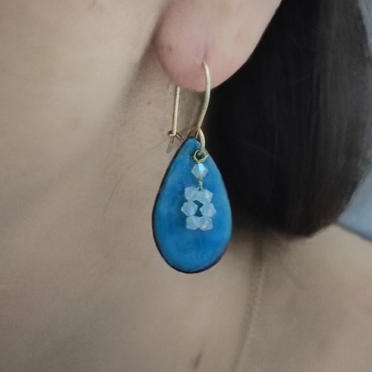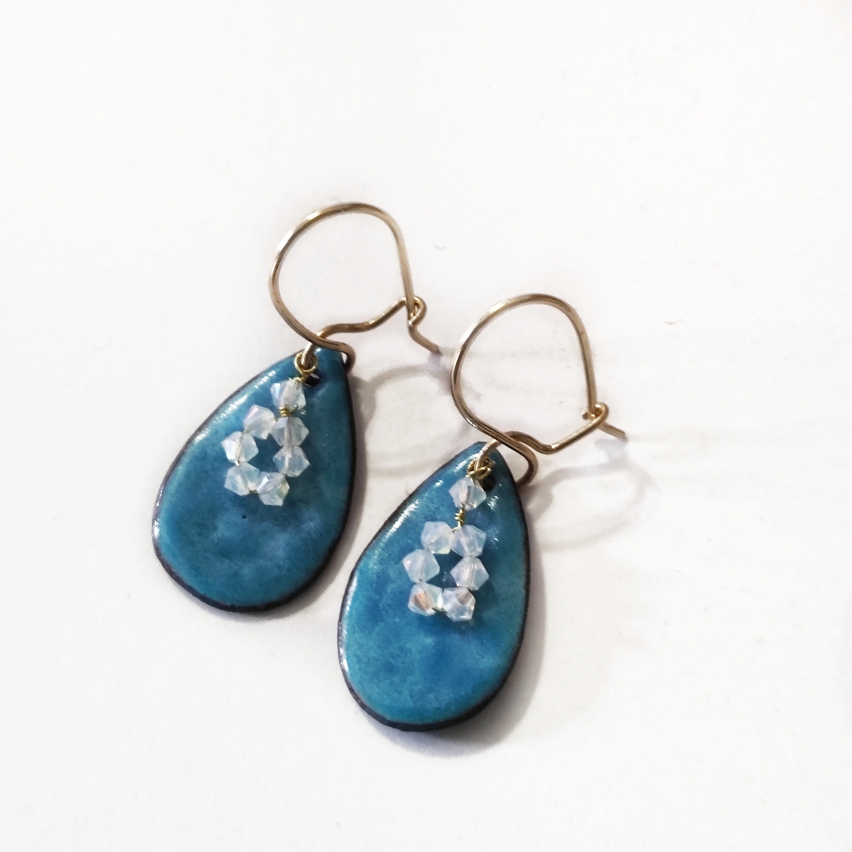Κρεμαστά σκουλαρίκια με γάντζους επιχρυσωμενους 14Κ χρυσό, το χάλκινο δάκρυ είναι επικαλυμμένο με μπλε ρουά σμάλτο ψημένο στους 750°C και διακοσμημένα με πέτρες Swarovski. Εξ ολοκλήρου χειροποίητα.