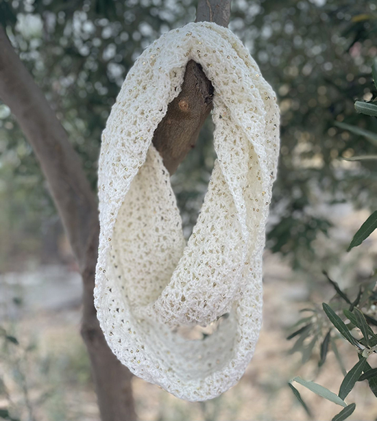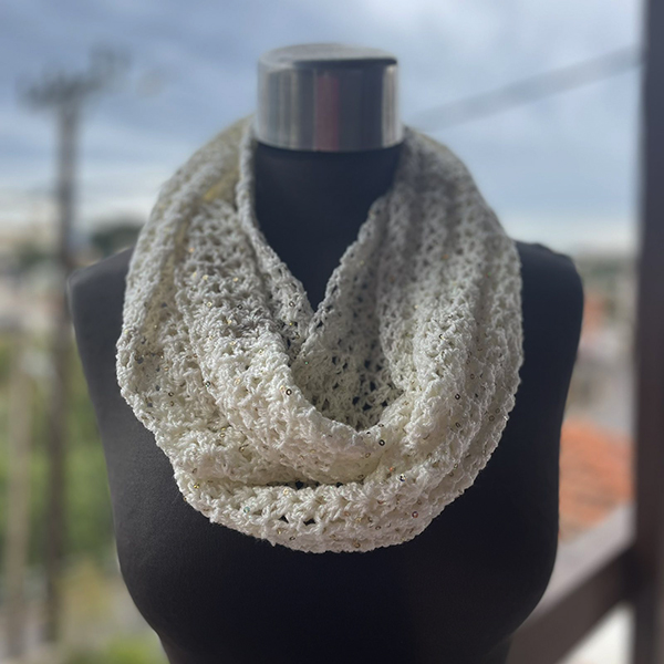 🧶 Διπλός λαιμός, πλεγμένος στο χέρι με βελονάκι, από απαλό εκρού ακρυλικό νήμα. Διακοσμημένος με μεταλλική ιριδίζουσα κλωστή και χρυσές, διακριτικές μίνι παγιέτες, προσφέρει μια αίσθηση φεγγαρόσκονης και ρομαντικής δαντέλας.