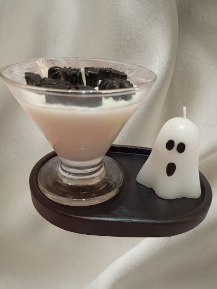 Σετ χειροποίητων κεριών με ελαφρύ άρωμα βανίλιας 1 κερί σέ γυάλινο ποτήρι+ 1 κερί φαντασματάκι+διακοσμητική πιατέλα 16cm ιδανικό για διακόσμηση σπιτιού η δώρο