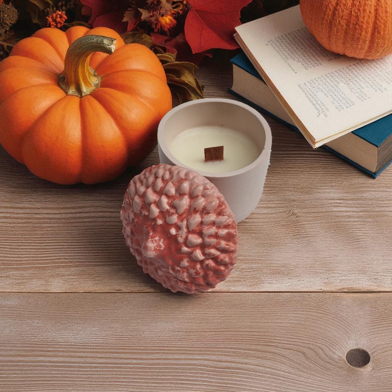 Περιέχει 130 γραμμάρια κερί και το βελανίδι είναι κατασκευασμένο από σκόνη πορσελάνης.