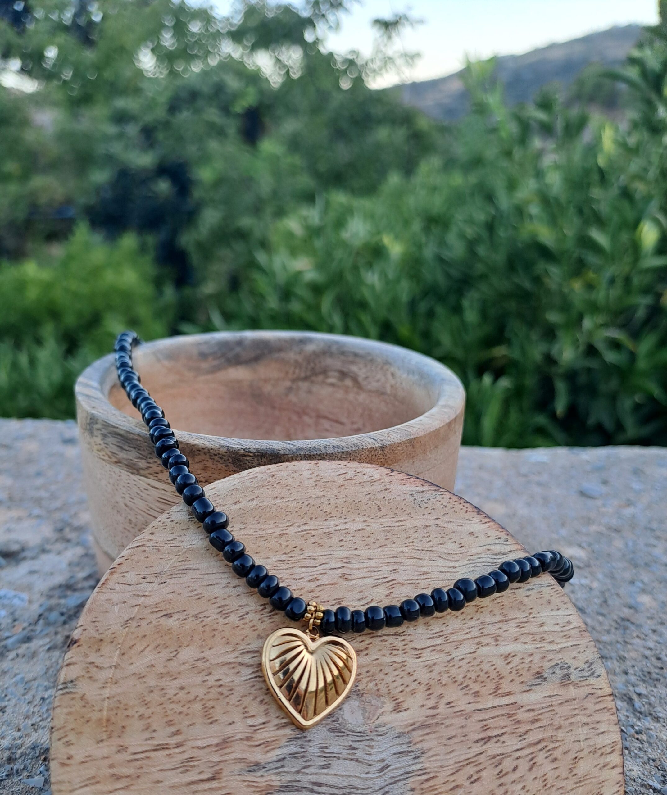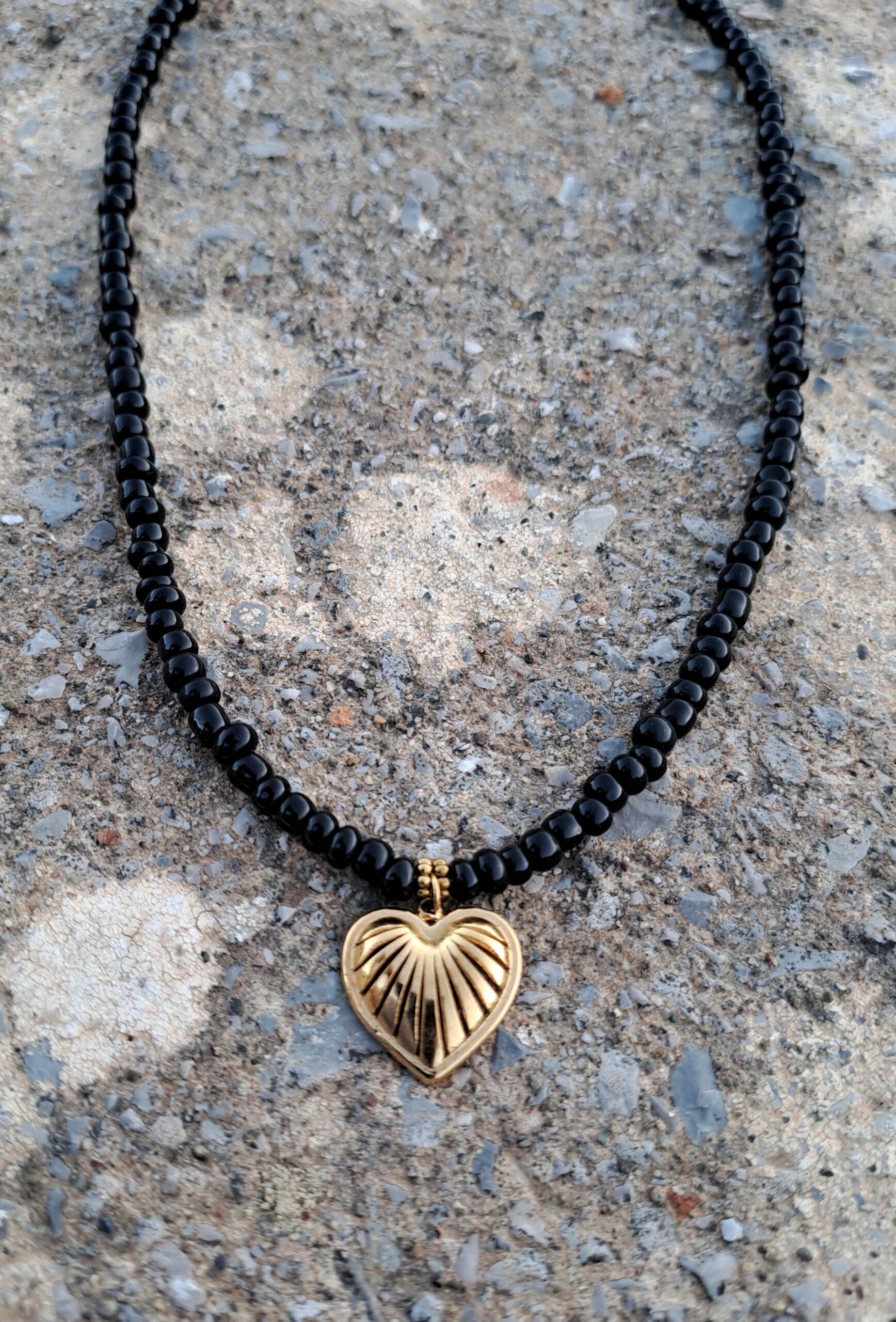 Κολιέ με μαύρες χάντρες και χρυσή ανοξείδωτη κρεμαστή καρδιά