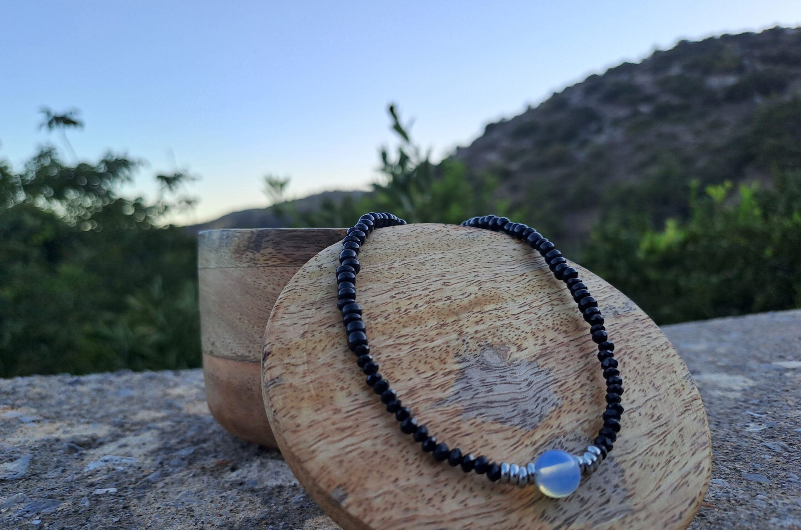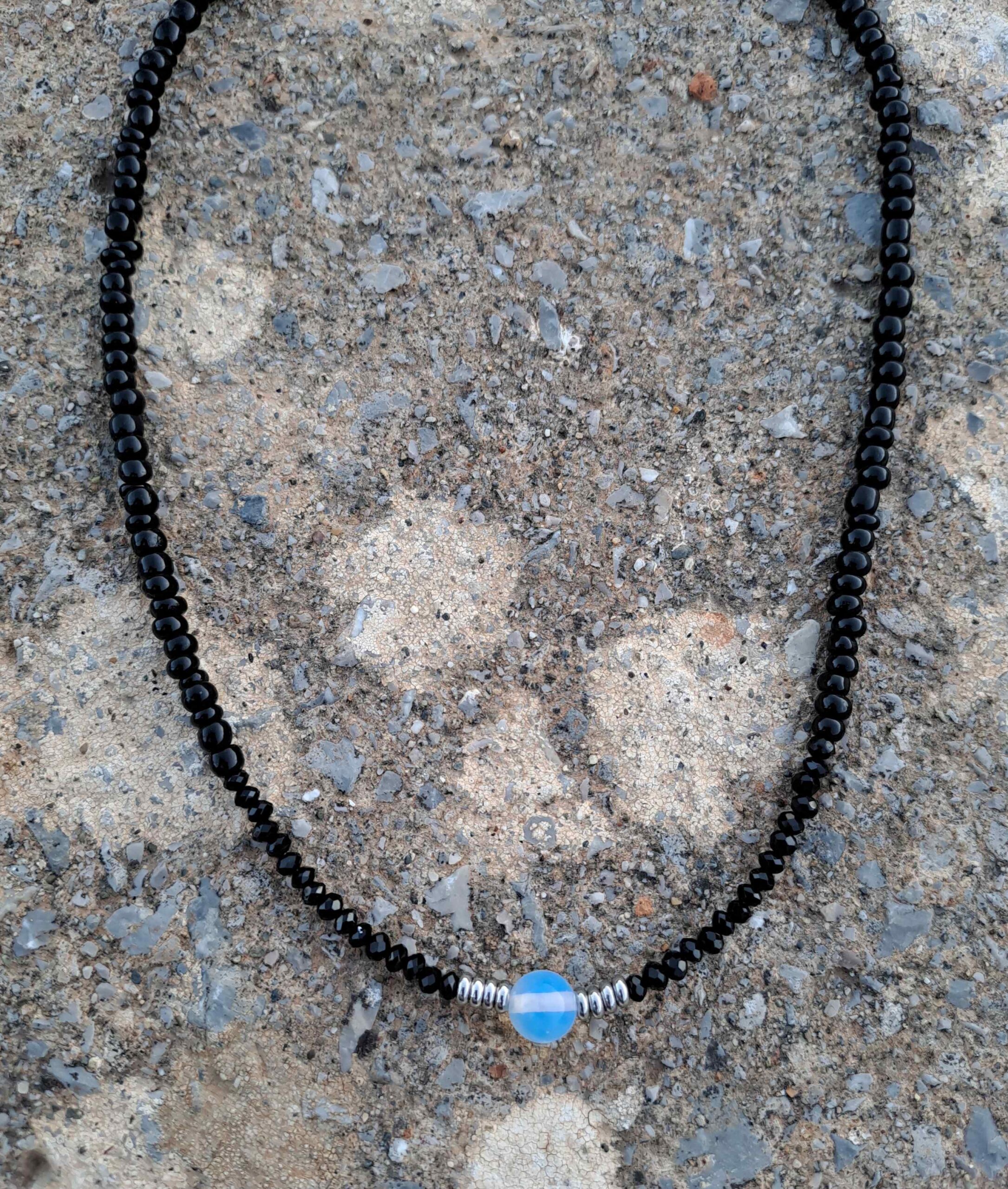 Κολιέ με μαύρες πέτρες και κεντρική ημιπολύτιμη φεγγαρόπετρα