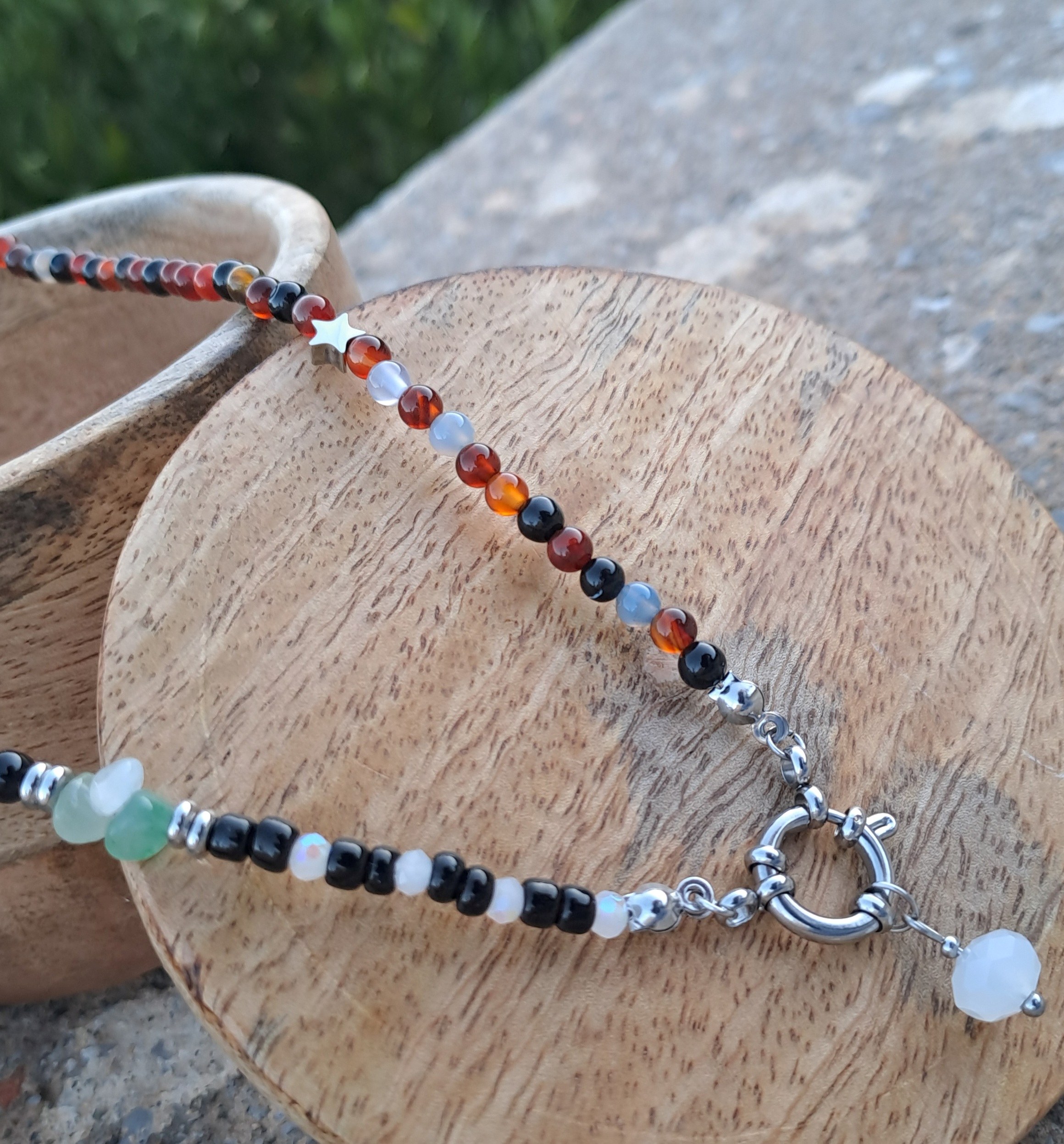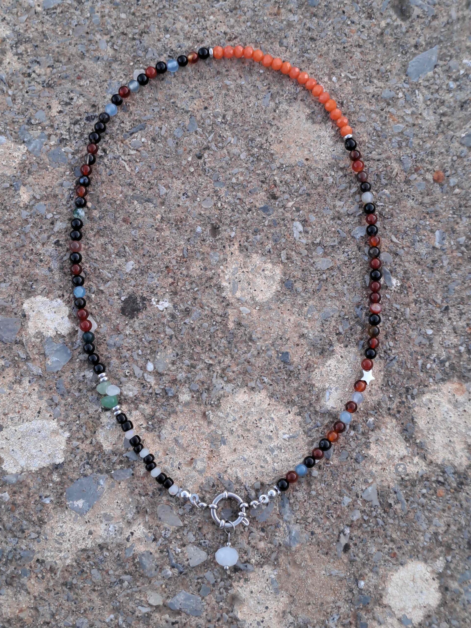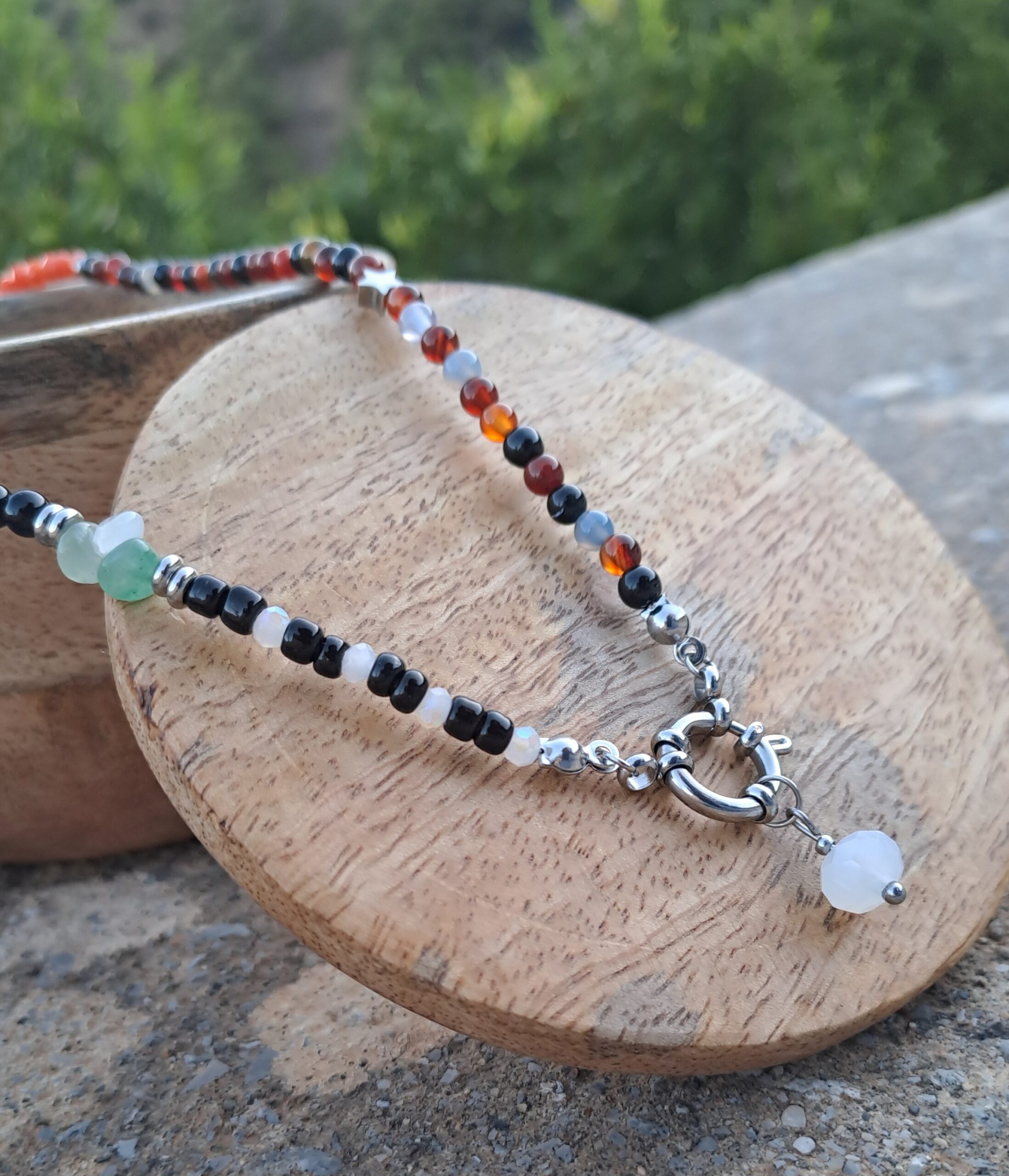 Κολιέ από πολύχρωμες ημιπολύτιμες χάντρες, κρυσταλλάκια και μεγάλο στρογγυλό ανοξείδωτο κούμπωμα