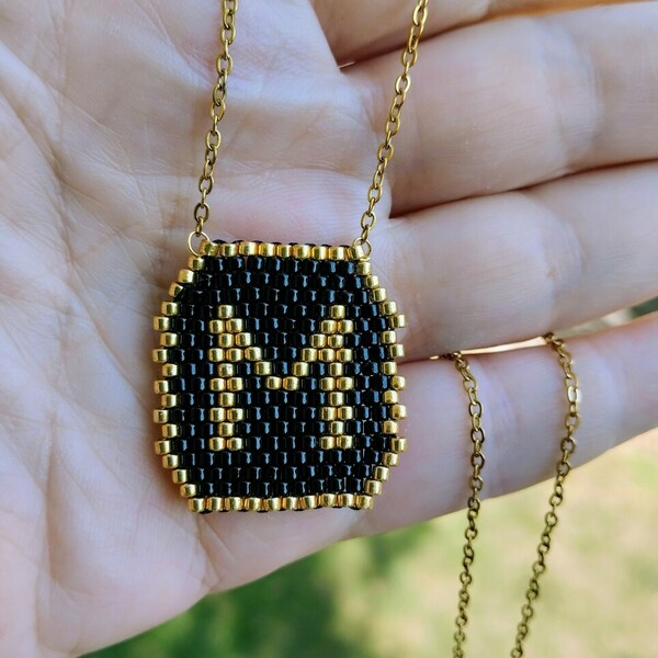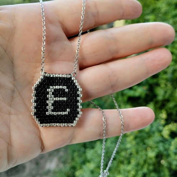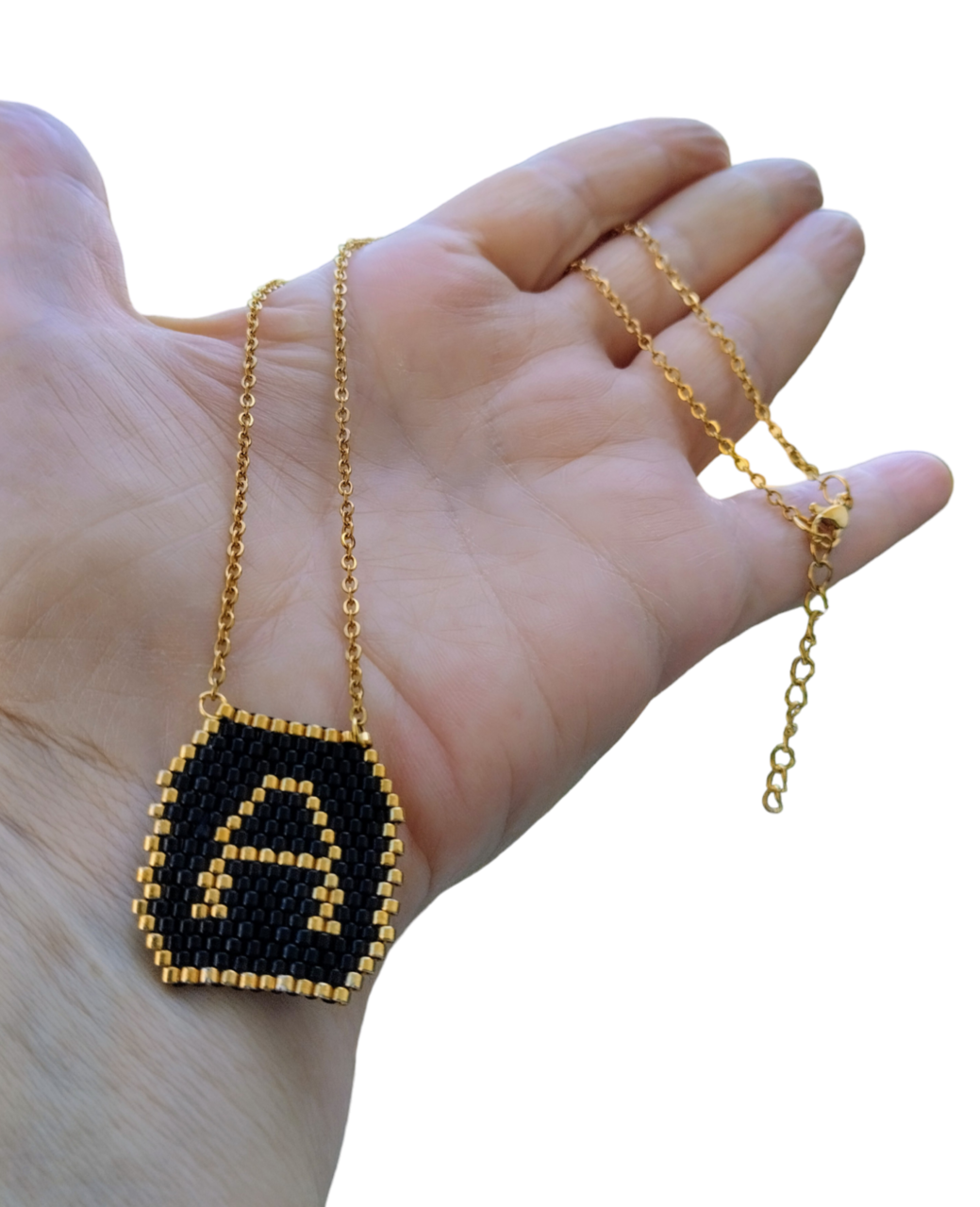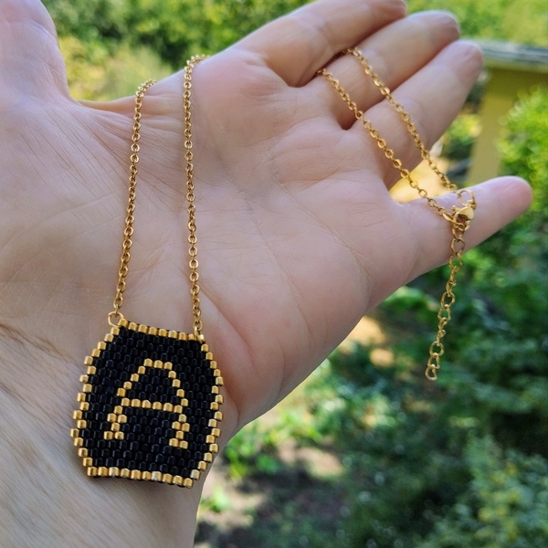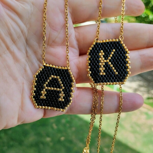 Είναι ένα υπέροχο ατσάλινο κολιέ μενταγιόν με μεγάλο μονόγραμμα, με χάντρες miyuki delica στα χρώματα του μαύρου και του χρυσού.