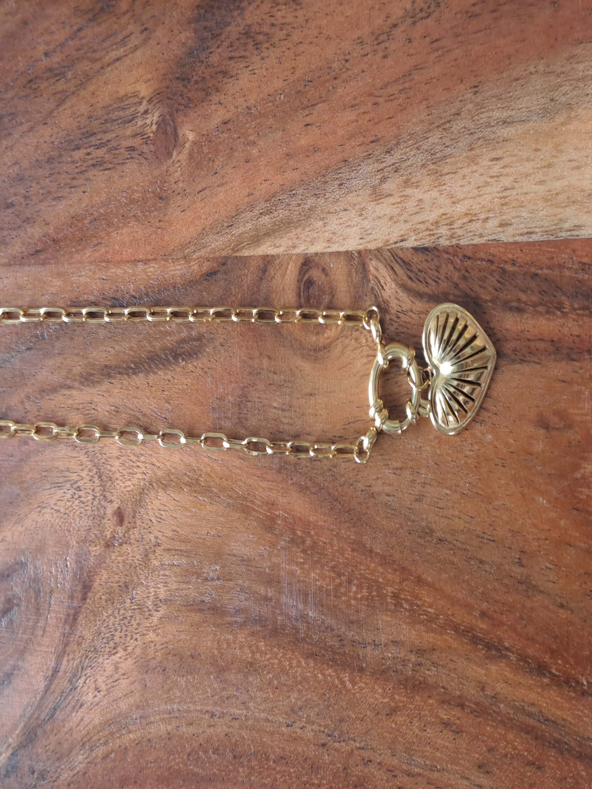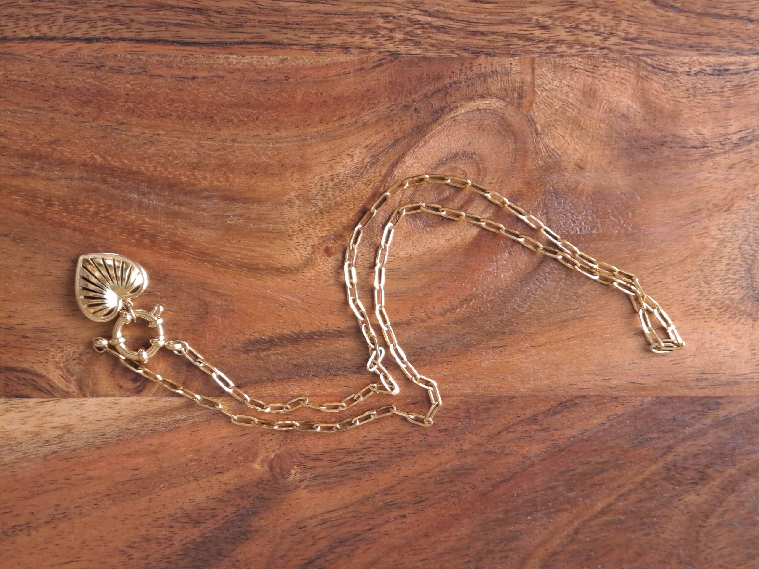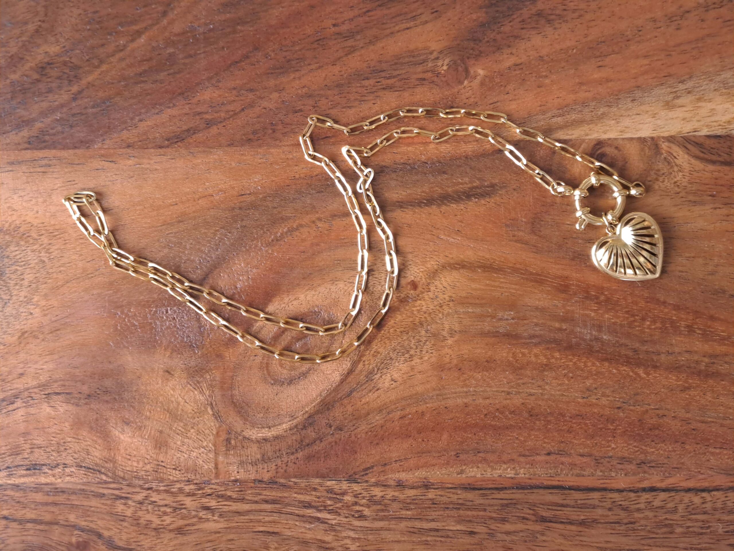 Χρυσό χειροποίητο κολιέ με μεγάλο στρογγυλό κούμπωμα και διάτρητη κρεμαστή καρδιά
