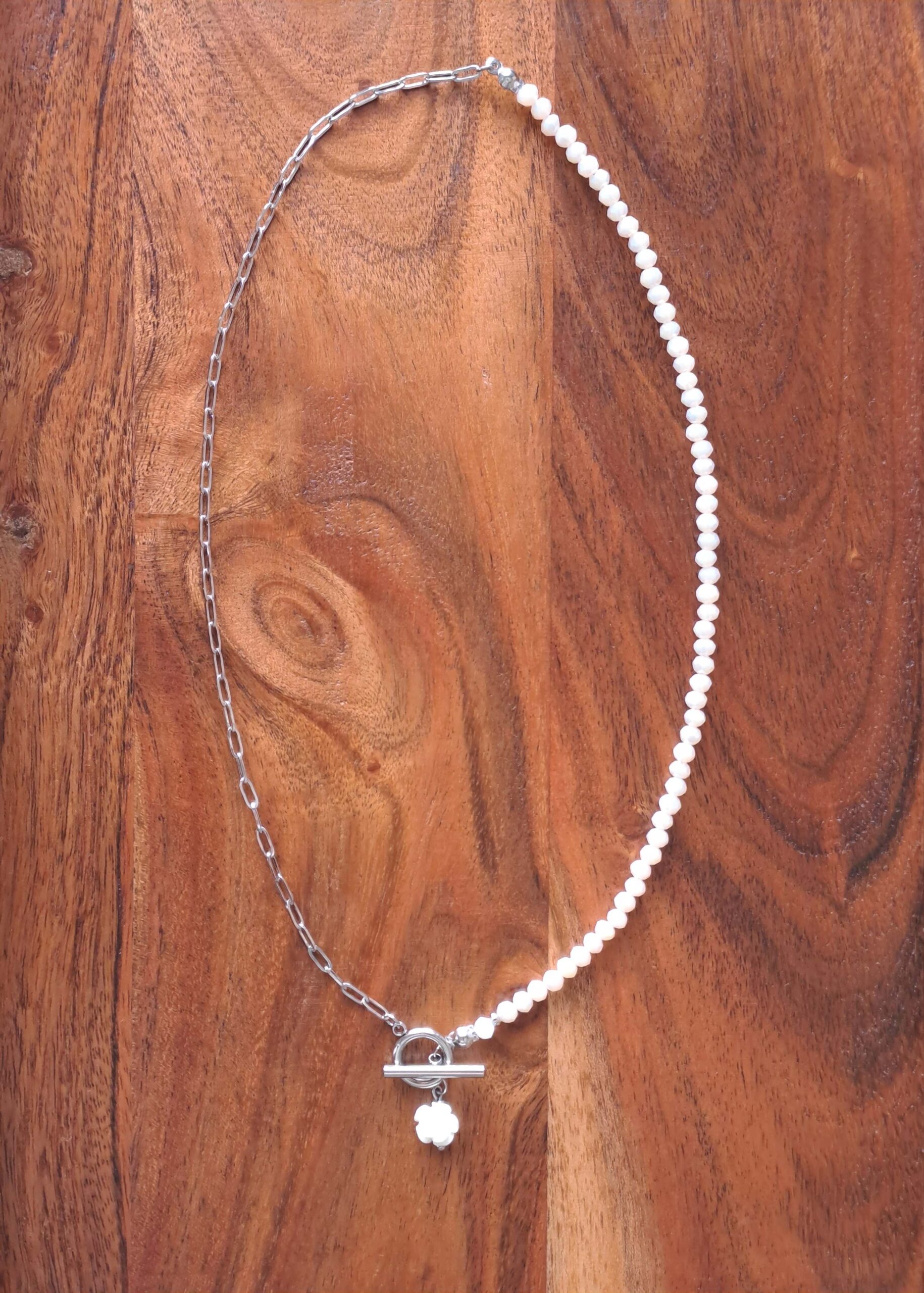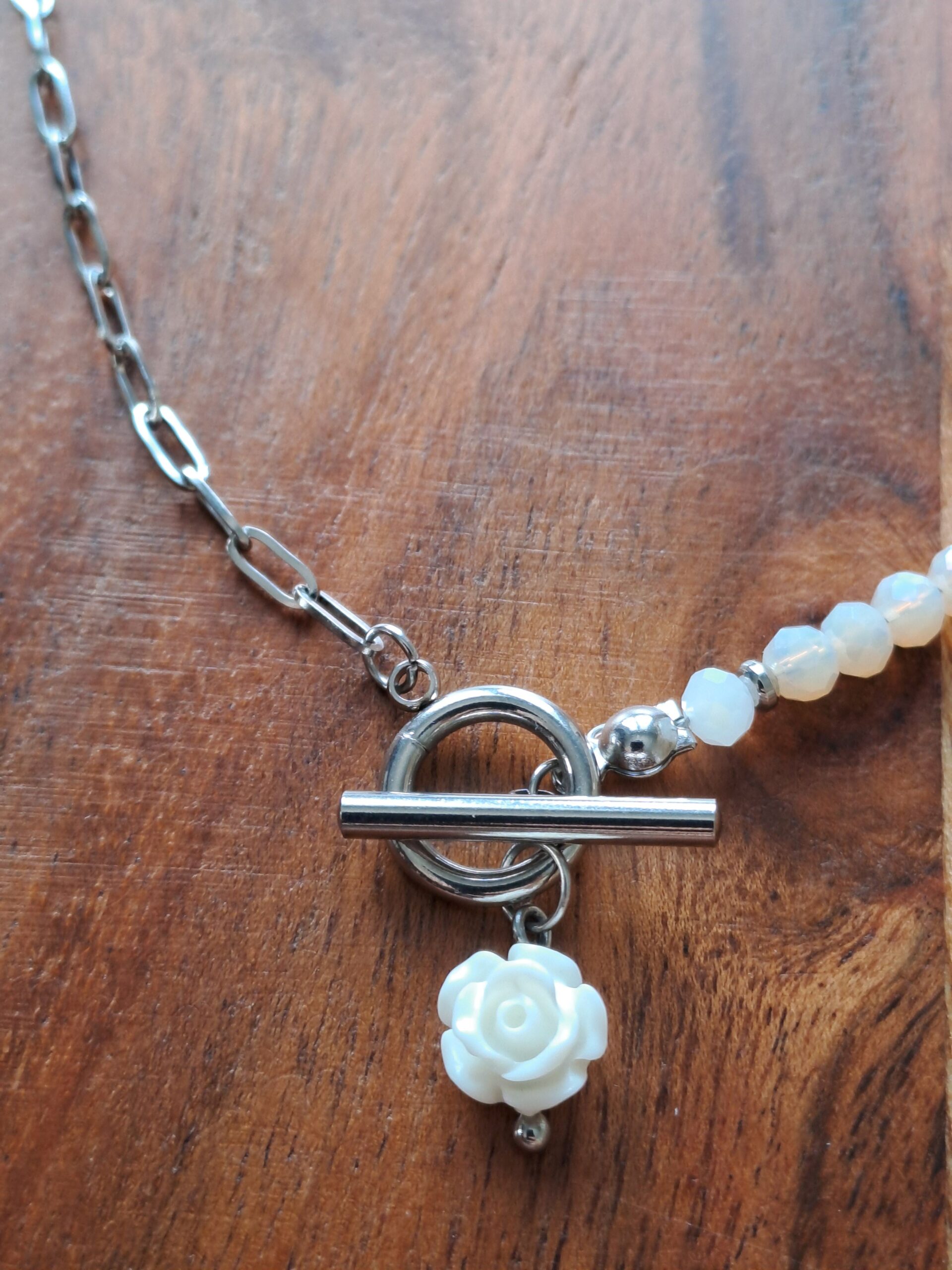 Χειροποίητο ασημί κολιέ με μεγάλο στρογγυλό κούμπωμα και τριανταφυλλάκι κρεμαστό